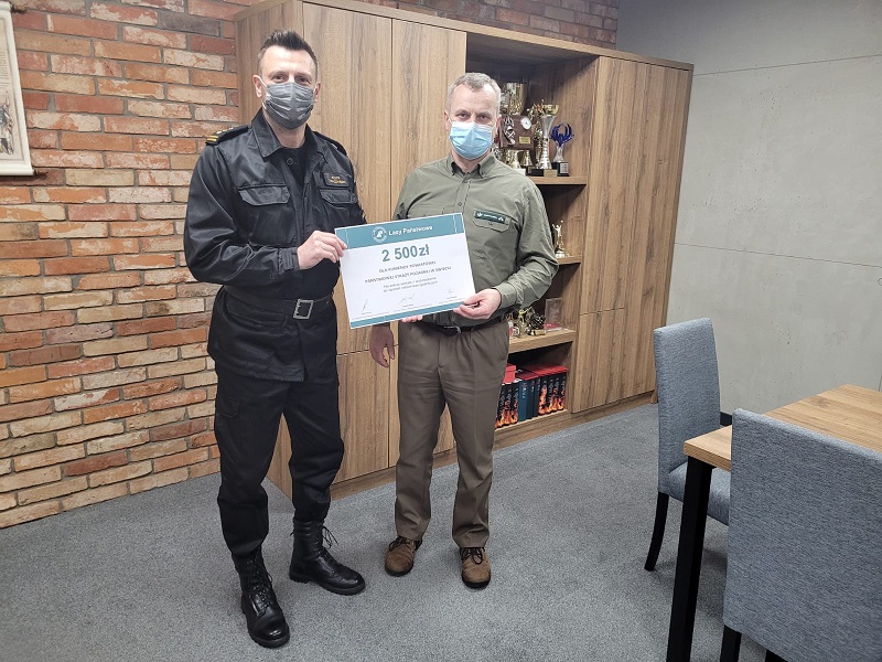 W dniu 21 grudnia 2021r. Komendant Powiatowy PSP w Świeciu st. bryg. Piotr Tkaczyński gościł Nadleśniczego Nadleśnictwa Dąbrowa Karola Pawlickiego, który w imieniu p.o. Dyrektora Generalnego Lasów Państwowych Józefa Kubicy oraz Sekretarza w Ministerstwie Klimatu i Środowiska Edwarda Siarka przekazał czek o wartości 2500zł na zakup sprzętu i wyposażenia do działań ratowniczo-gaśniczych.