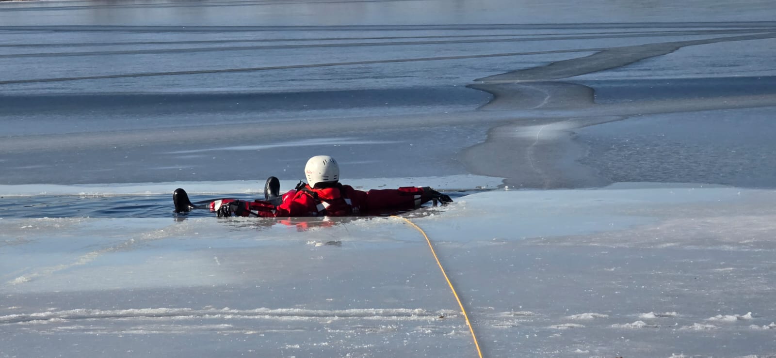 Ćwiczenia obejmowały również organizację prac asekuracyjnych oraz trening technik samoratowania w przypadku załamania się lodu