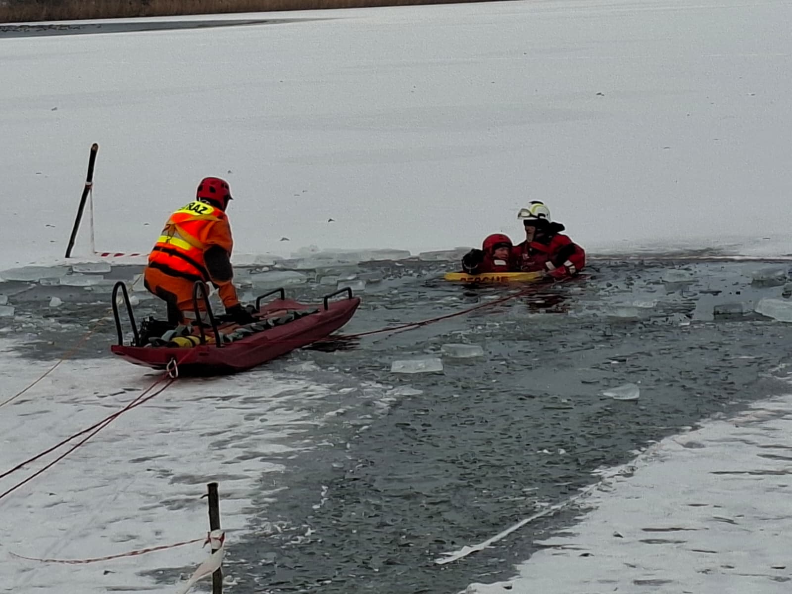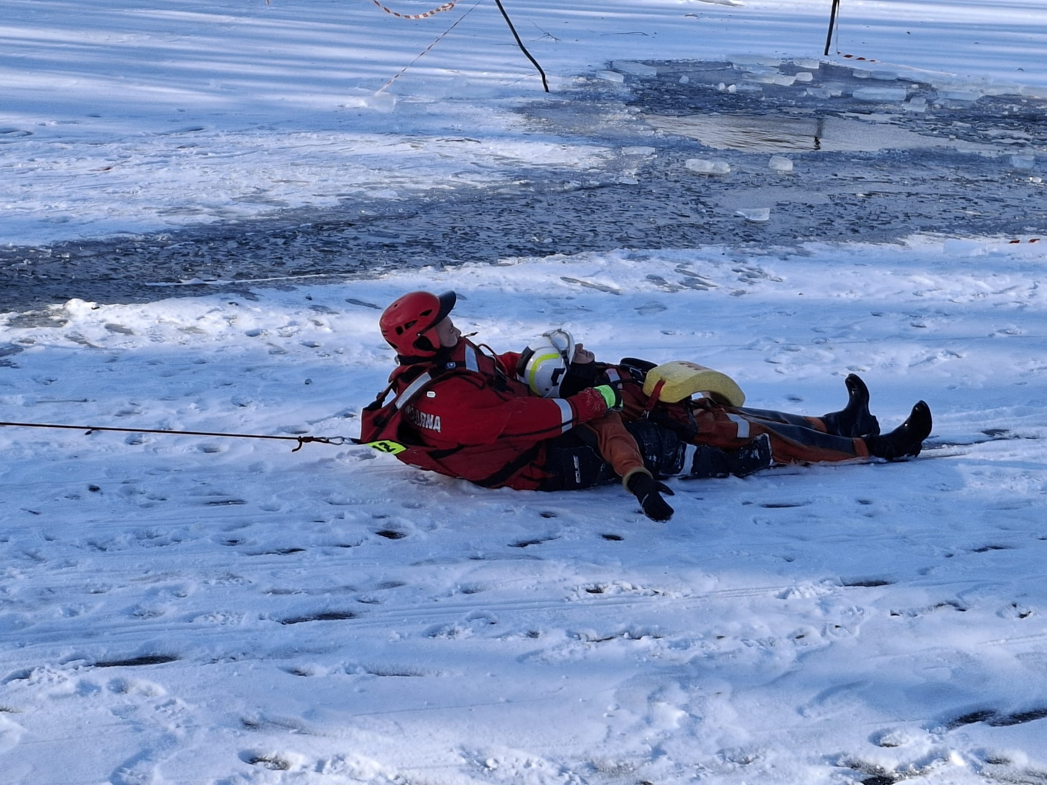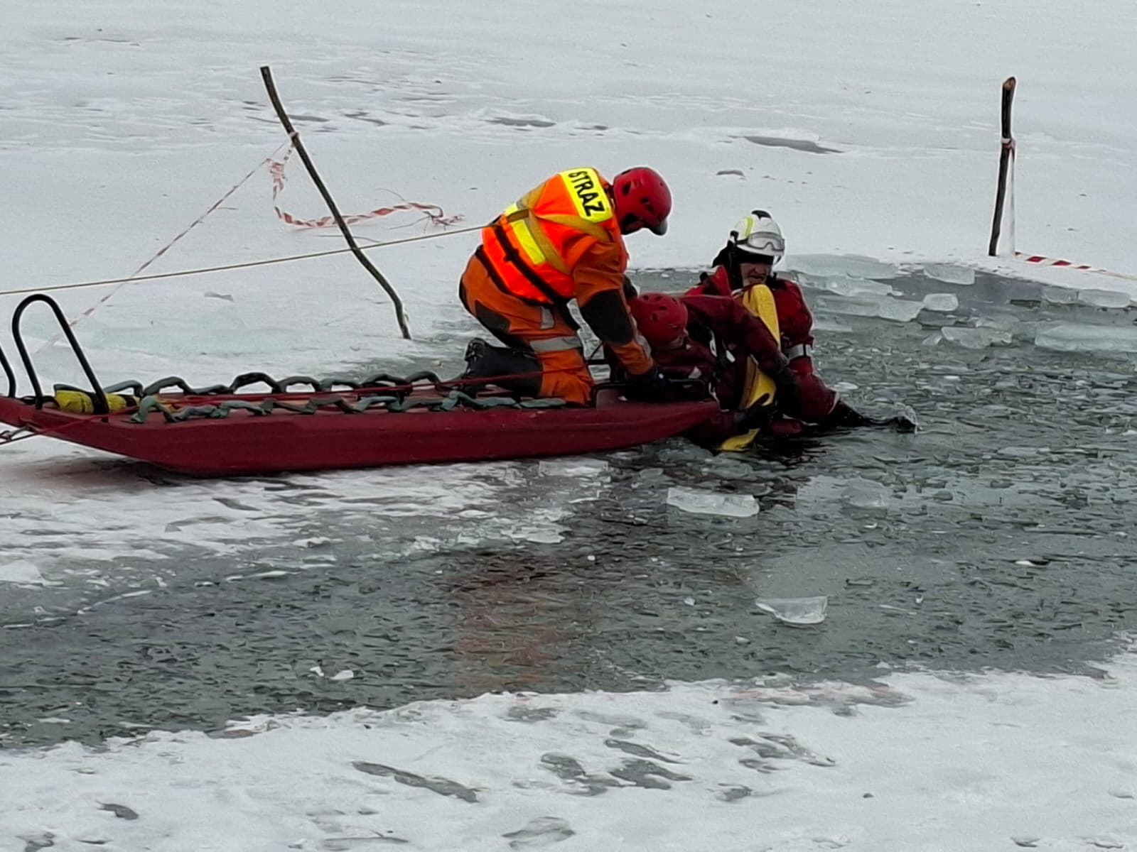Lód na naturalnych akwenach bywa kruchy i nieprzewidywalny, dlatego podczas ćwiczeń szczególny nacisk położono na zapewnienie bezpieczeństwa ratownikom wchodzącym na taflę lodową.