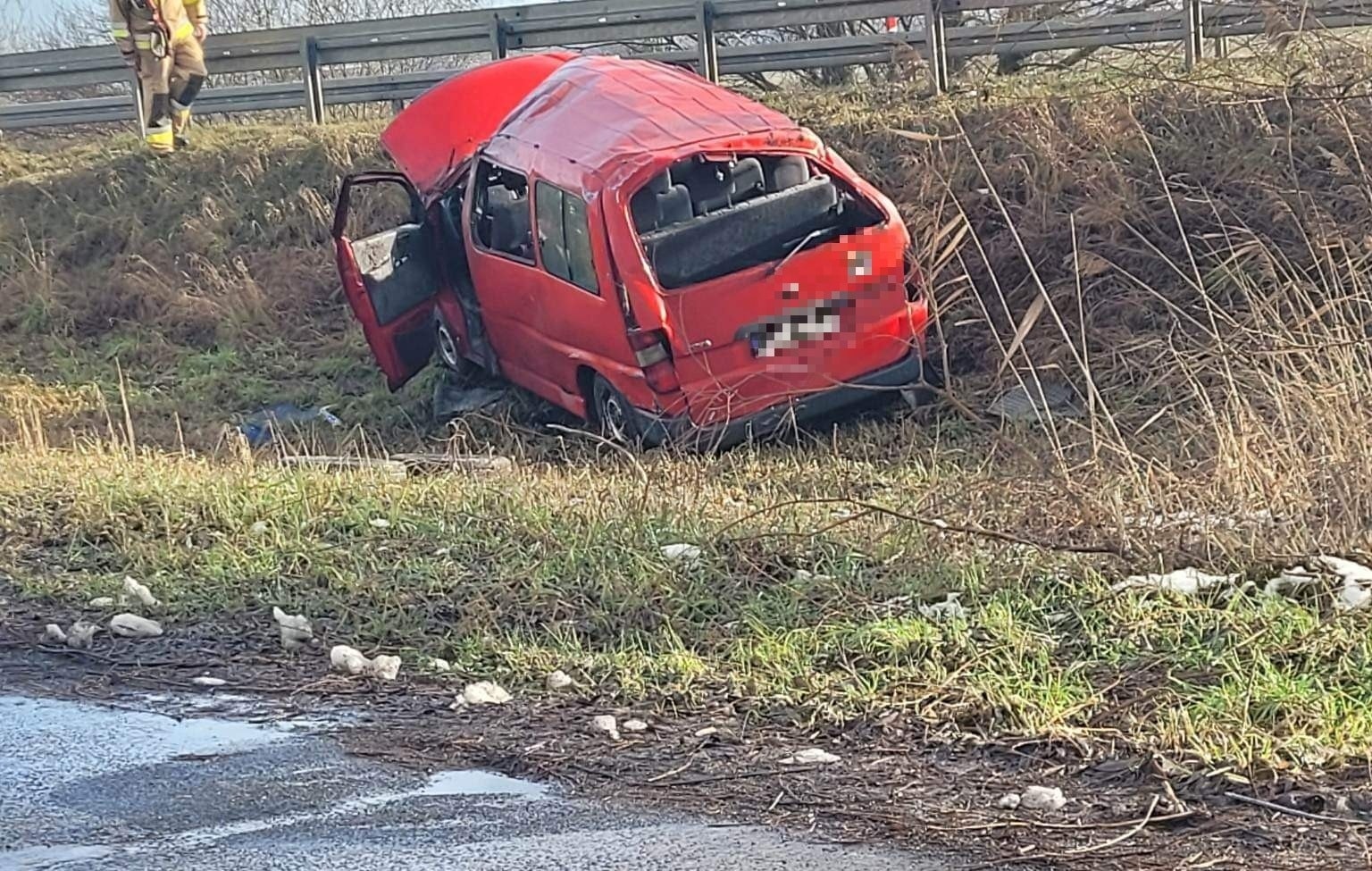 Po dojeździe na miejsce zdarzenia strażacy zastali samochód osobowy, który po dachowaniu znajdował się na pobliskim polu. Osoby podróżujące opuściły pojazd przed przybyciem SP i znajdowały się w pobliżu.