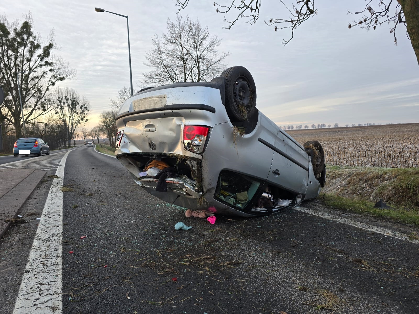 Dachowanie samochodu na drodze wojewódzkiej, jedna osoba poszkodowana przewieziona do szpitala