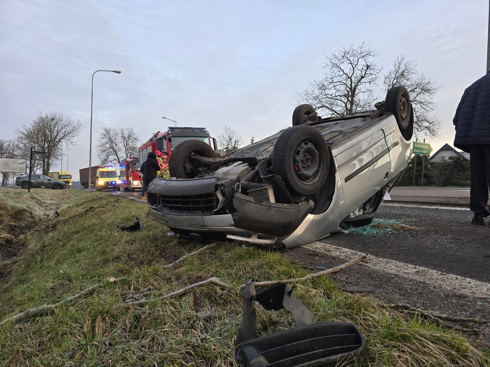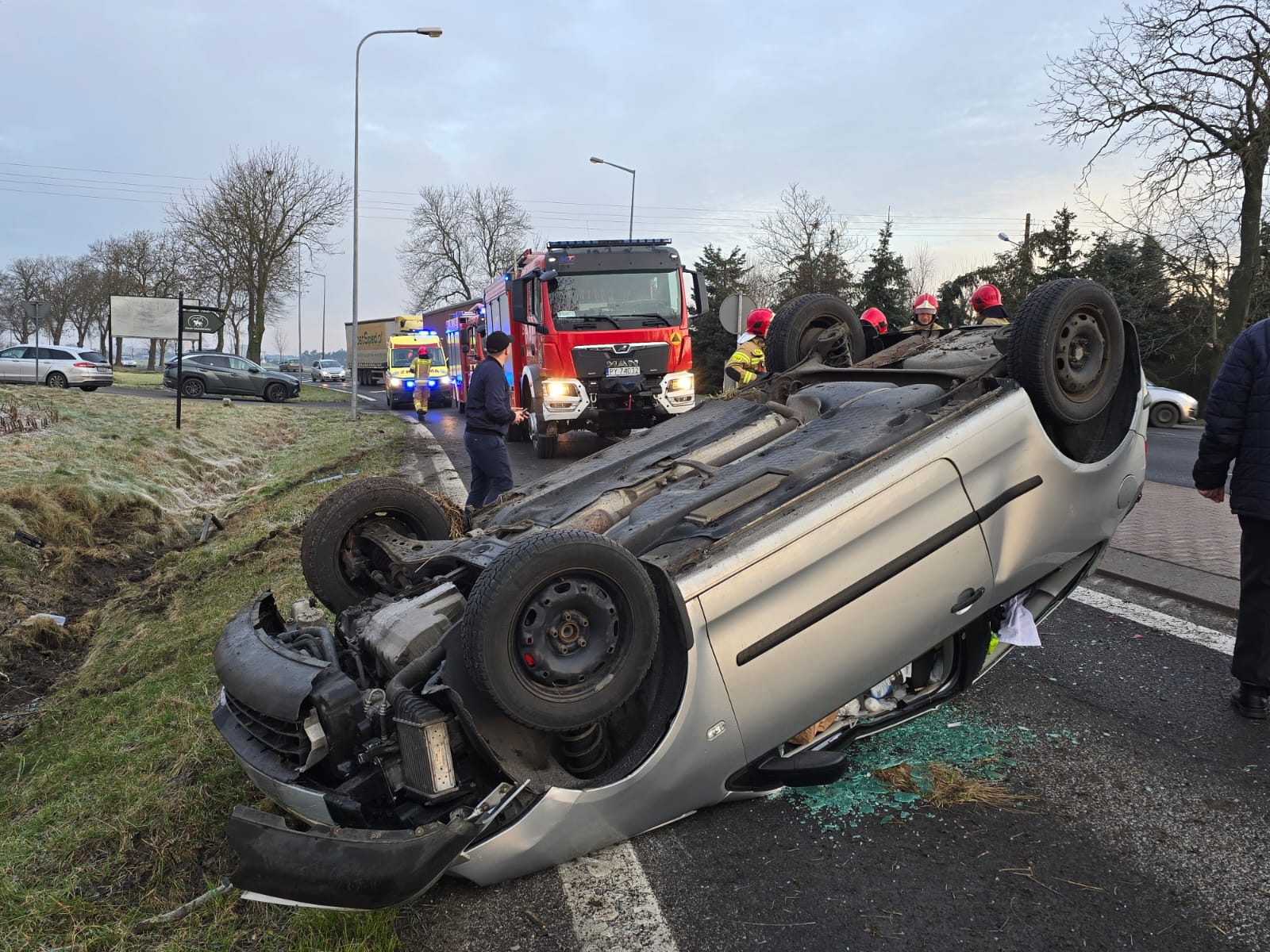 W środę, 14 lutego o godz. 7.27 do dyżurnego Stanowiska Kierowania Państwowej Straży Pożarnej w Szamotułach wpłynęło zgłoszenie z Centrum Powiadamiania Ratunkowego, które informowało o dachowaniu samochodu osobowego oraz jednej osobie poszkodowanej na trasie Szamotuły – Poznań w miejscowości Kąsinowo.