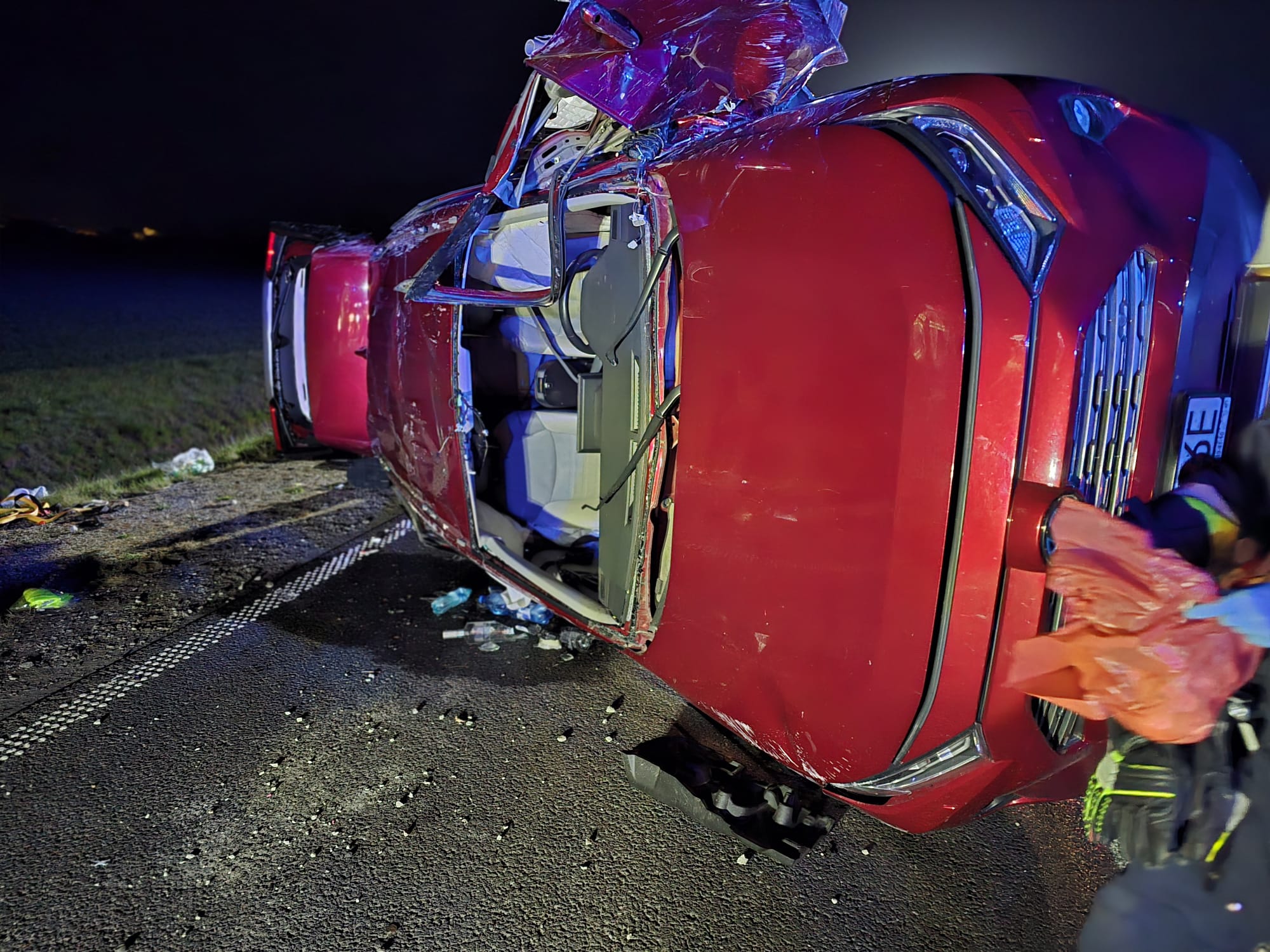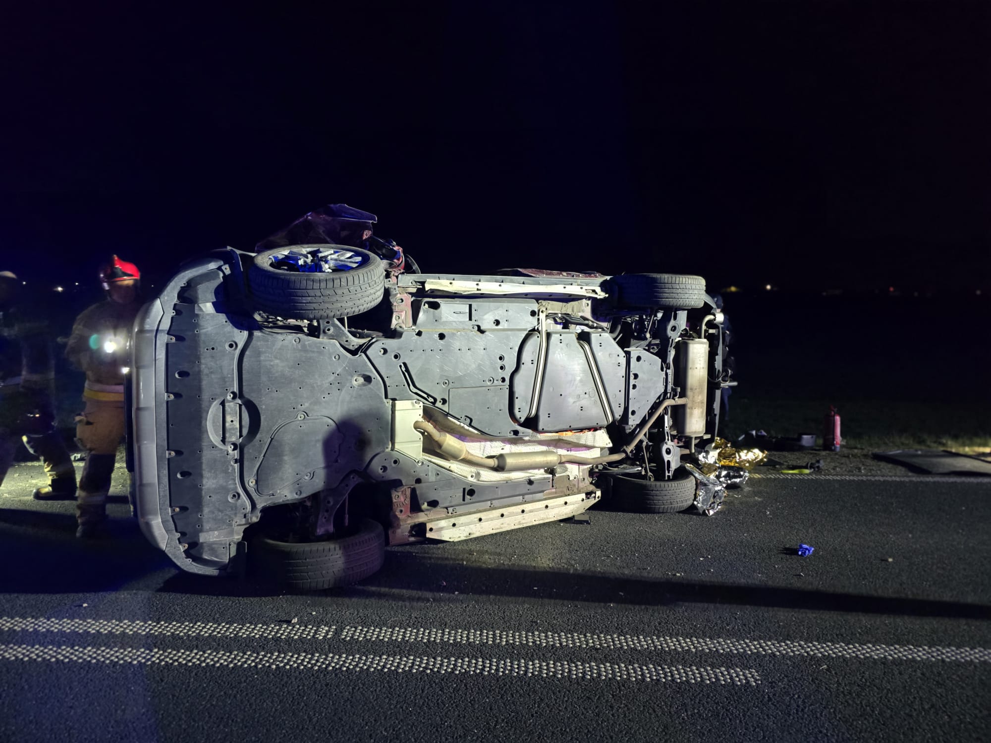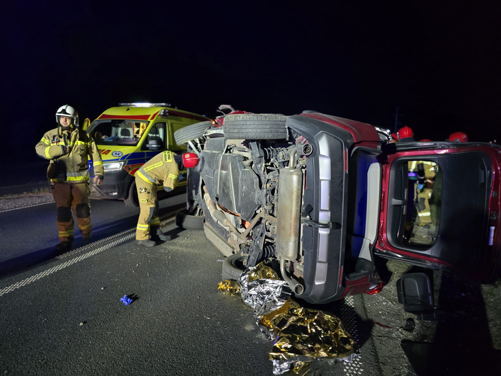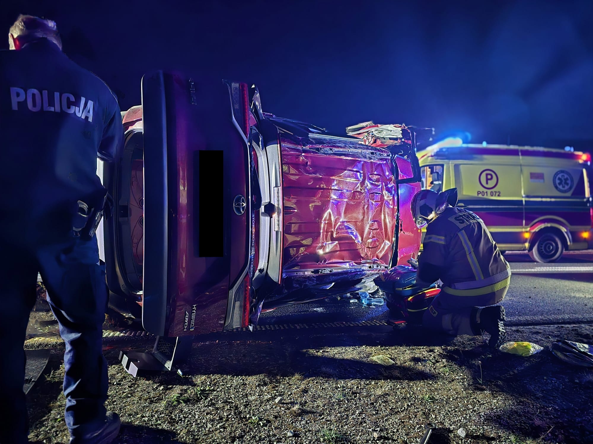 Po przybyciu na miejsce służby stwierdziły, że doszło do dachowania samochodu osobowego marki Toyota, pojazd znajdował się na prawym boku na drodze. Kierujący i pasażerowie opuścili pojazd przed przybyciem SP i znajdował się w pobliżu pod opieką świadków zdarzenia - trzy osoby zostały poszkodowane.