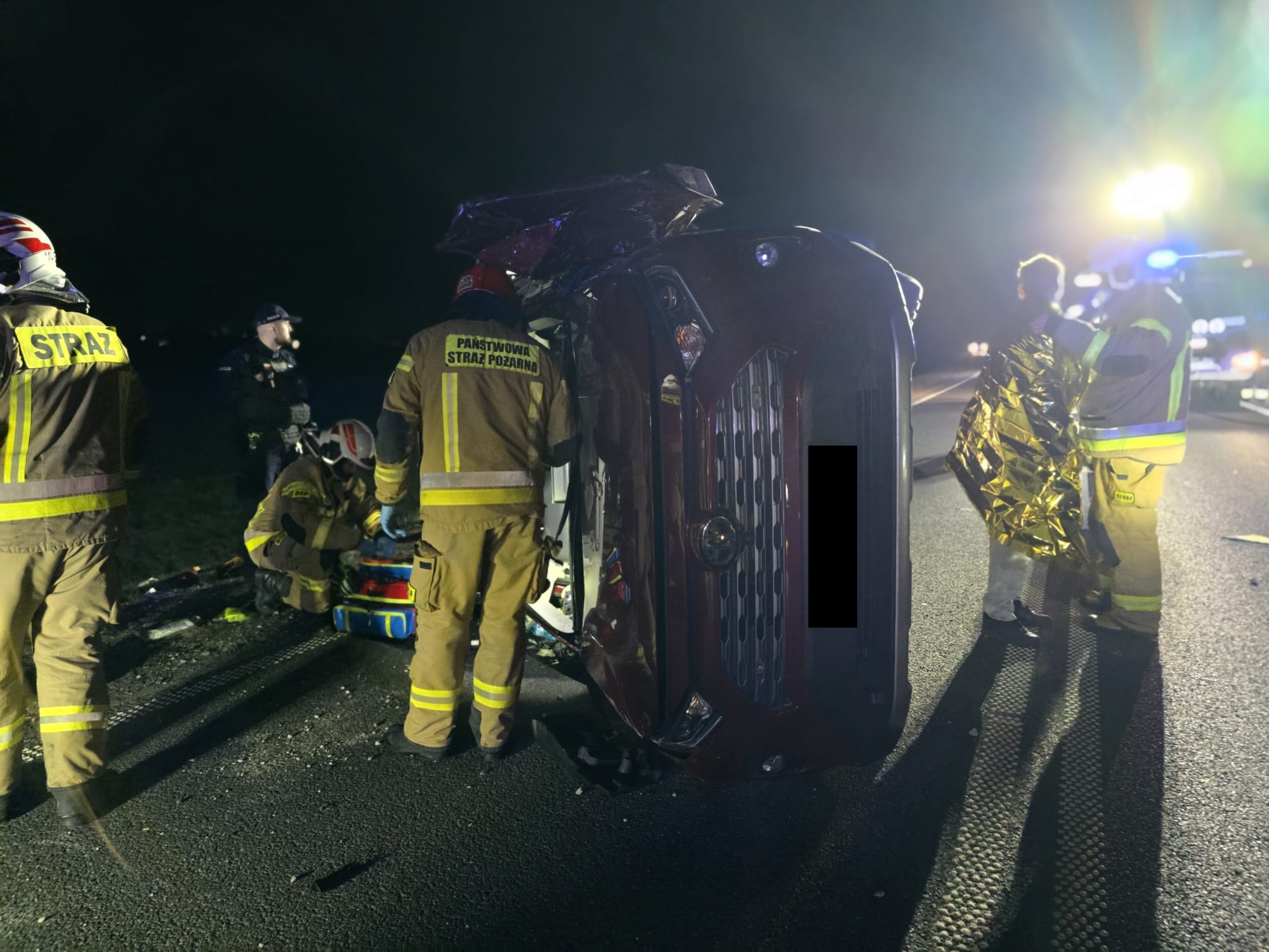 W piątek, 24 kwietnia 2026 roku o godz. 21.53 do dyżurnego Stanowiska Kierowania Państwowej Straży Pożarnej w Szamotułach wpłynęło zgłoszenie z Centrum Powiadamiania Ratunkowego, które informowało o dachowaniu samochodu oraz jednej osobie poszkodowanej na obwodnicy Wronek w pobliżu ronda w miejscowości Nowa Wieś.