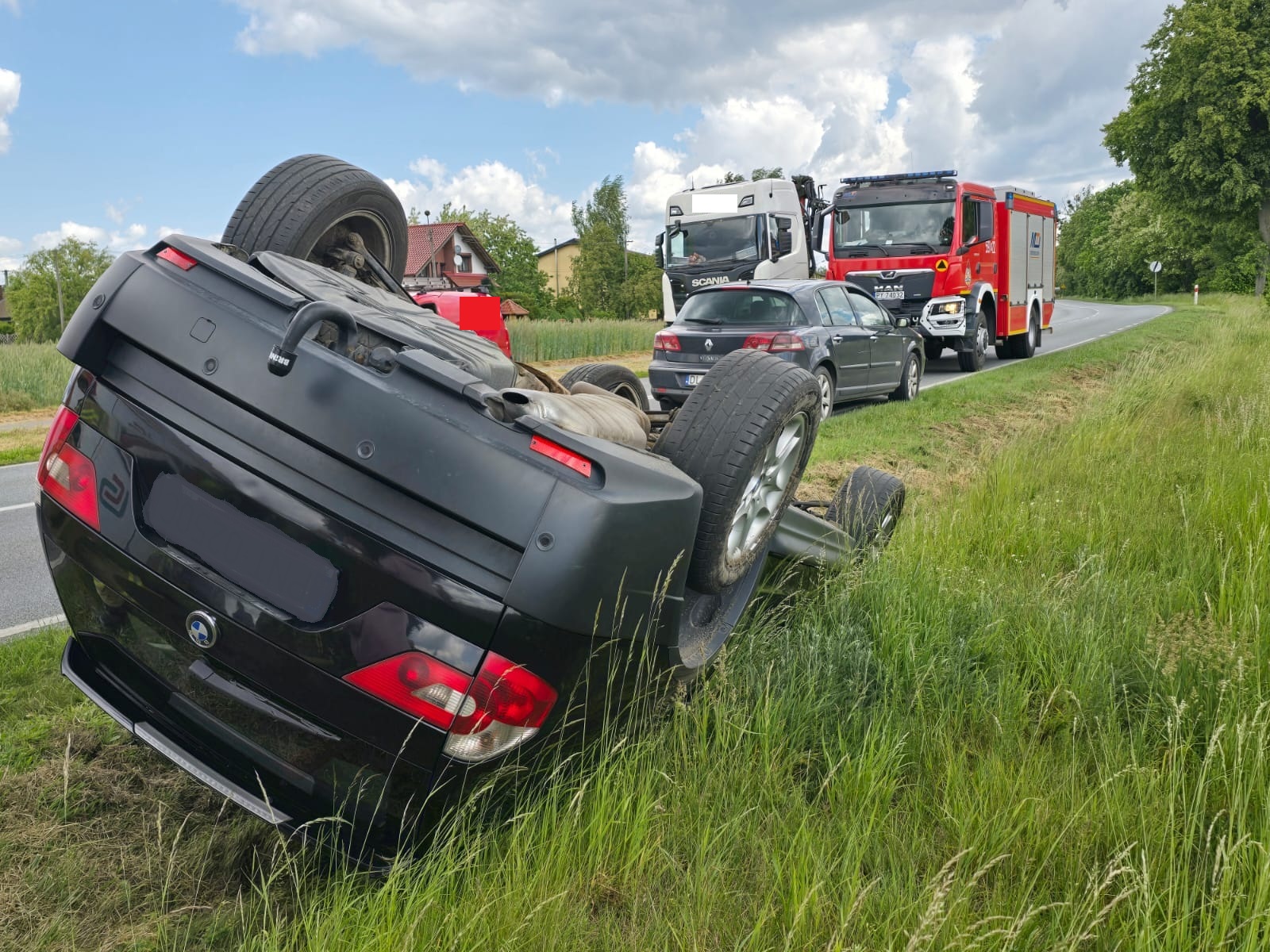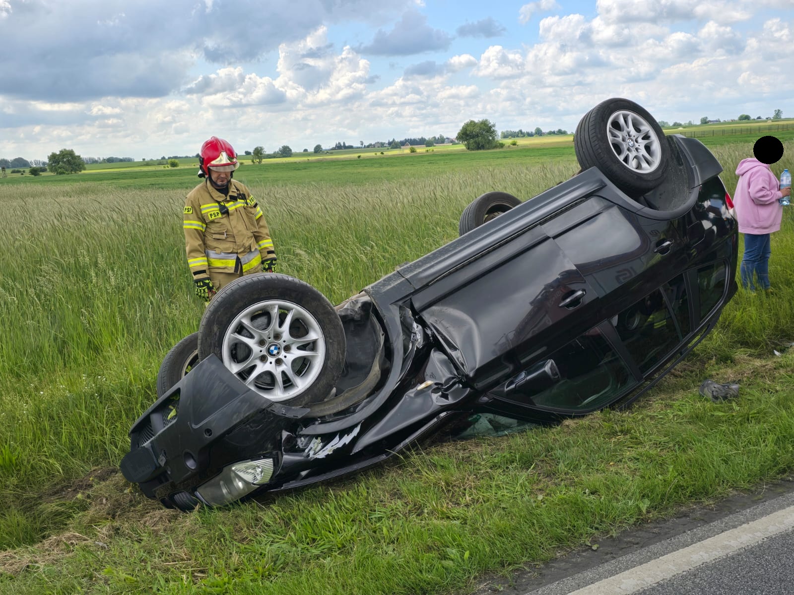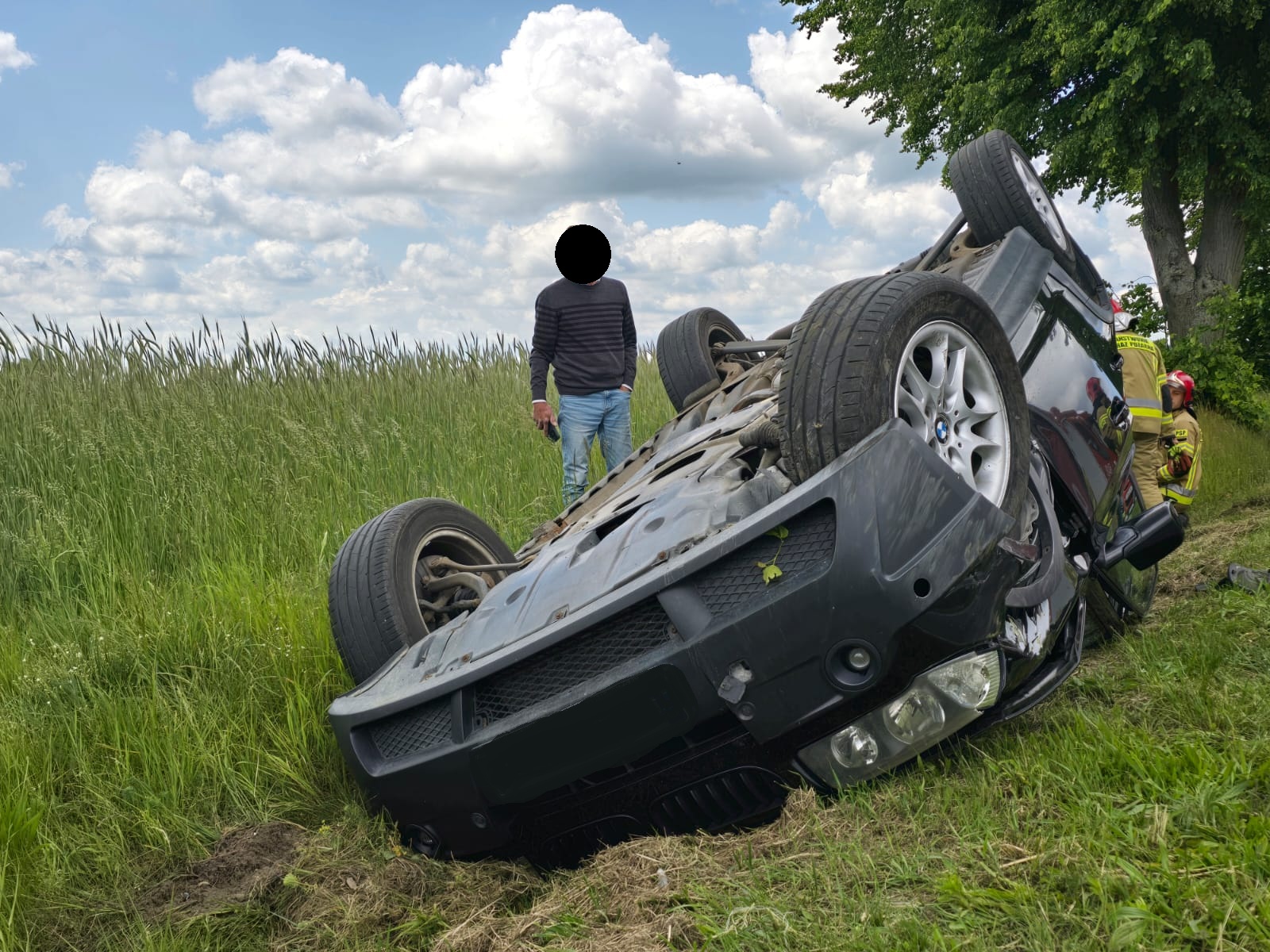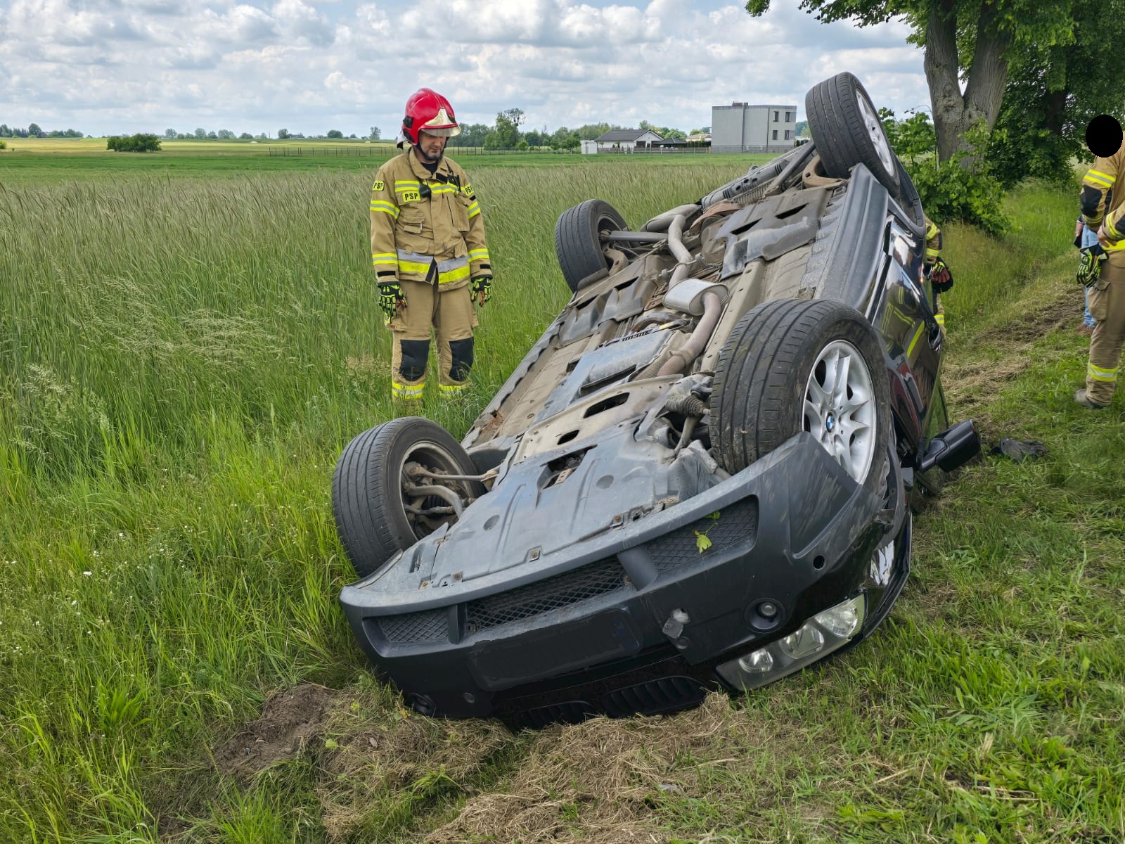 Po dojeździe na miejsce zdarzenia strażacy zastali samochód osobowy marki BMW, który po dachowaniu znajdował się poza drogą.