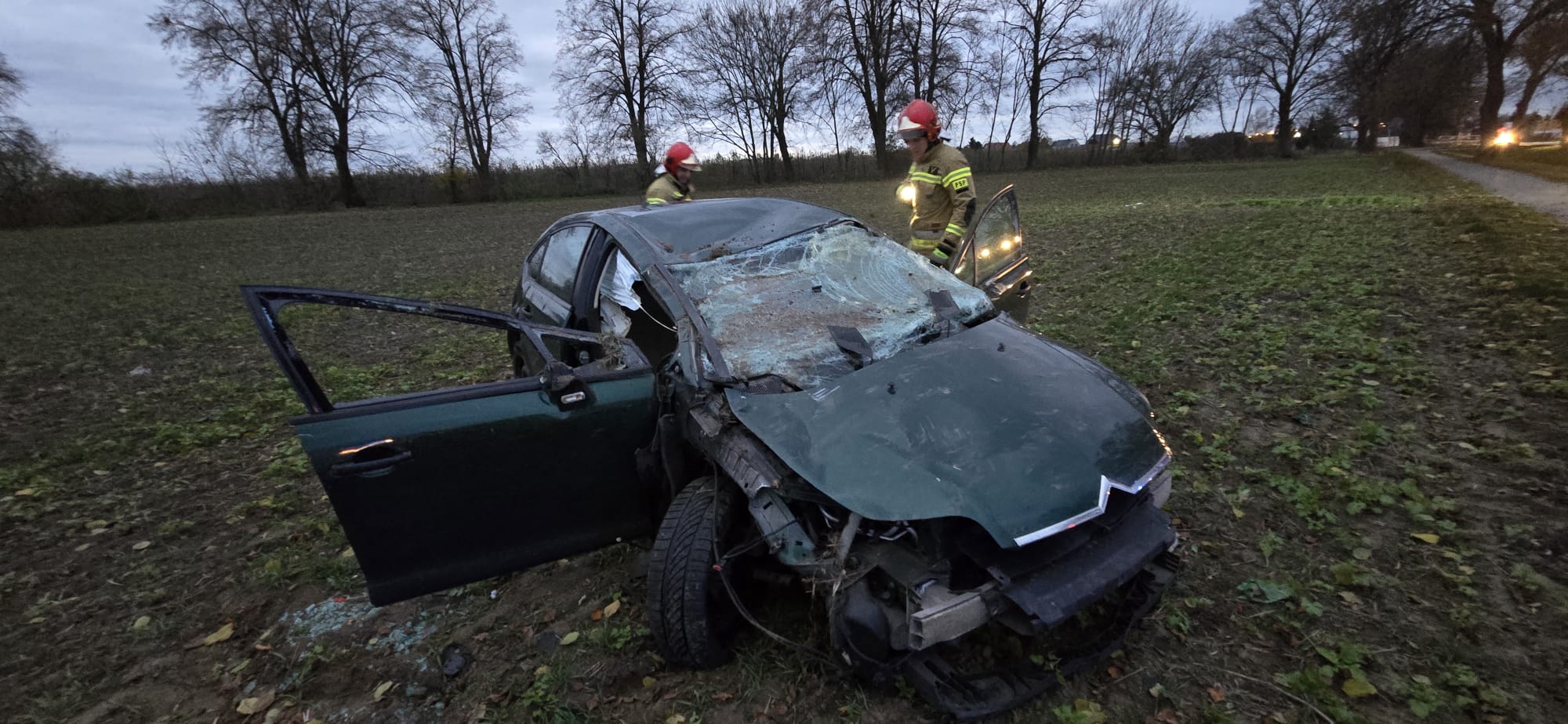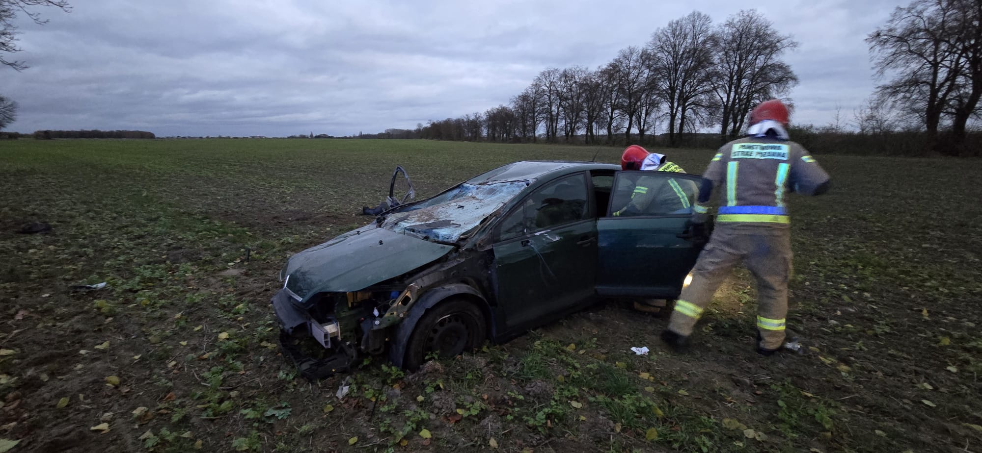 Po dojeździe na miejsce strażacy zastali samochód osobowy, który po dachowaniu znajdował się na pobliskim polu. Kierująca opuściła pojazd przed przybyciem SP i znajdował się w pobliżu pod opieką świadków zdarzenia.