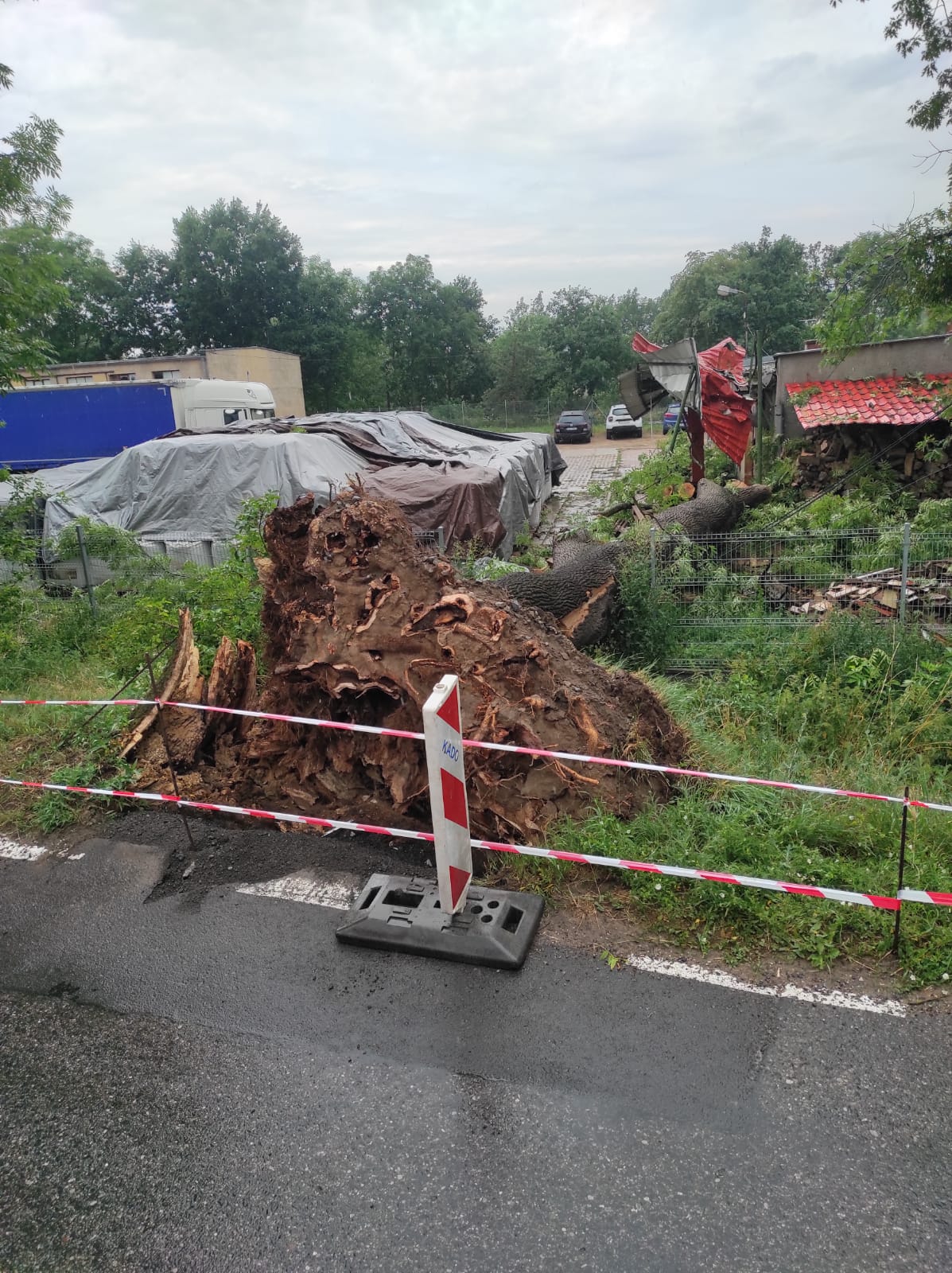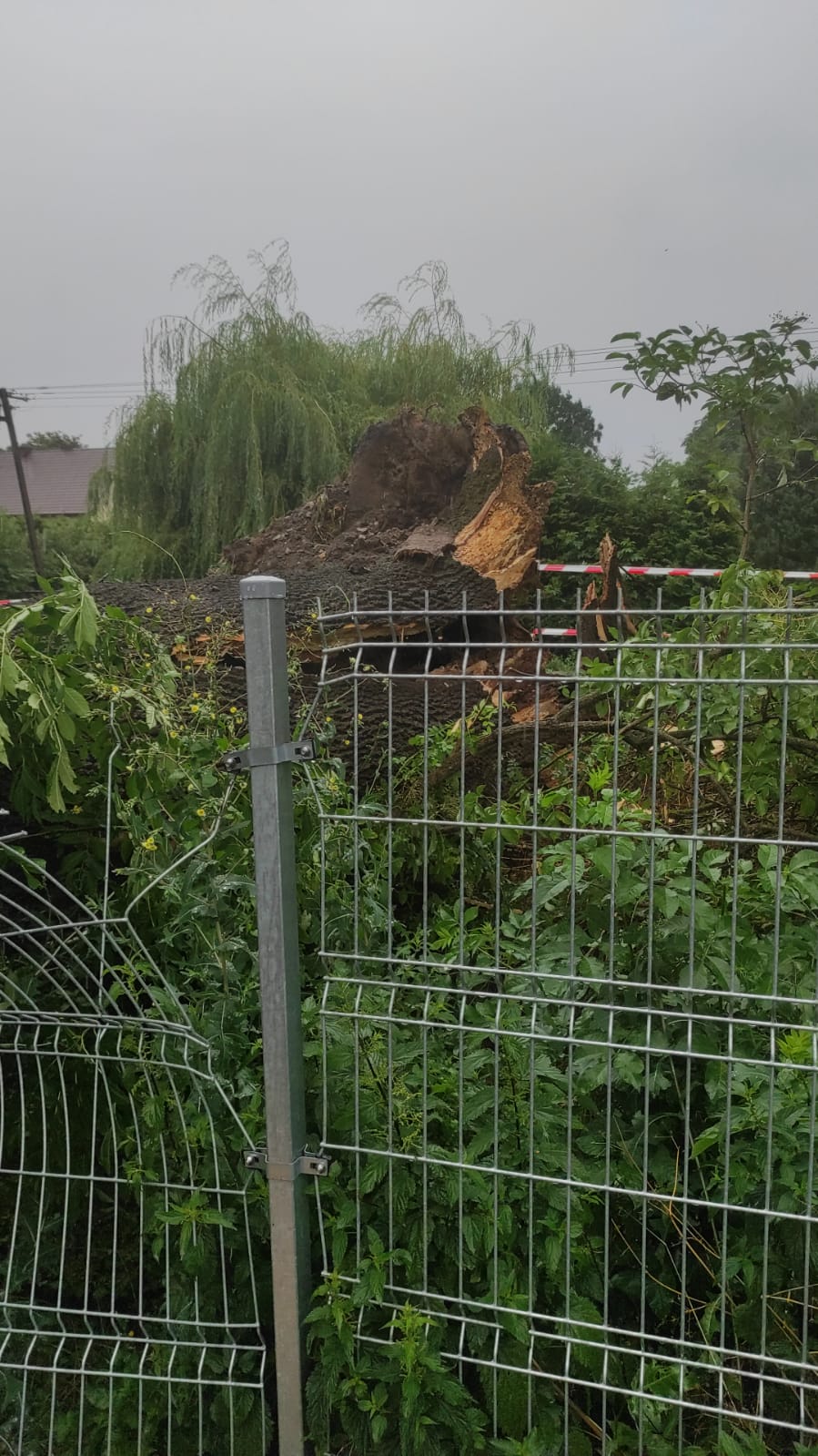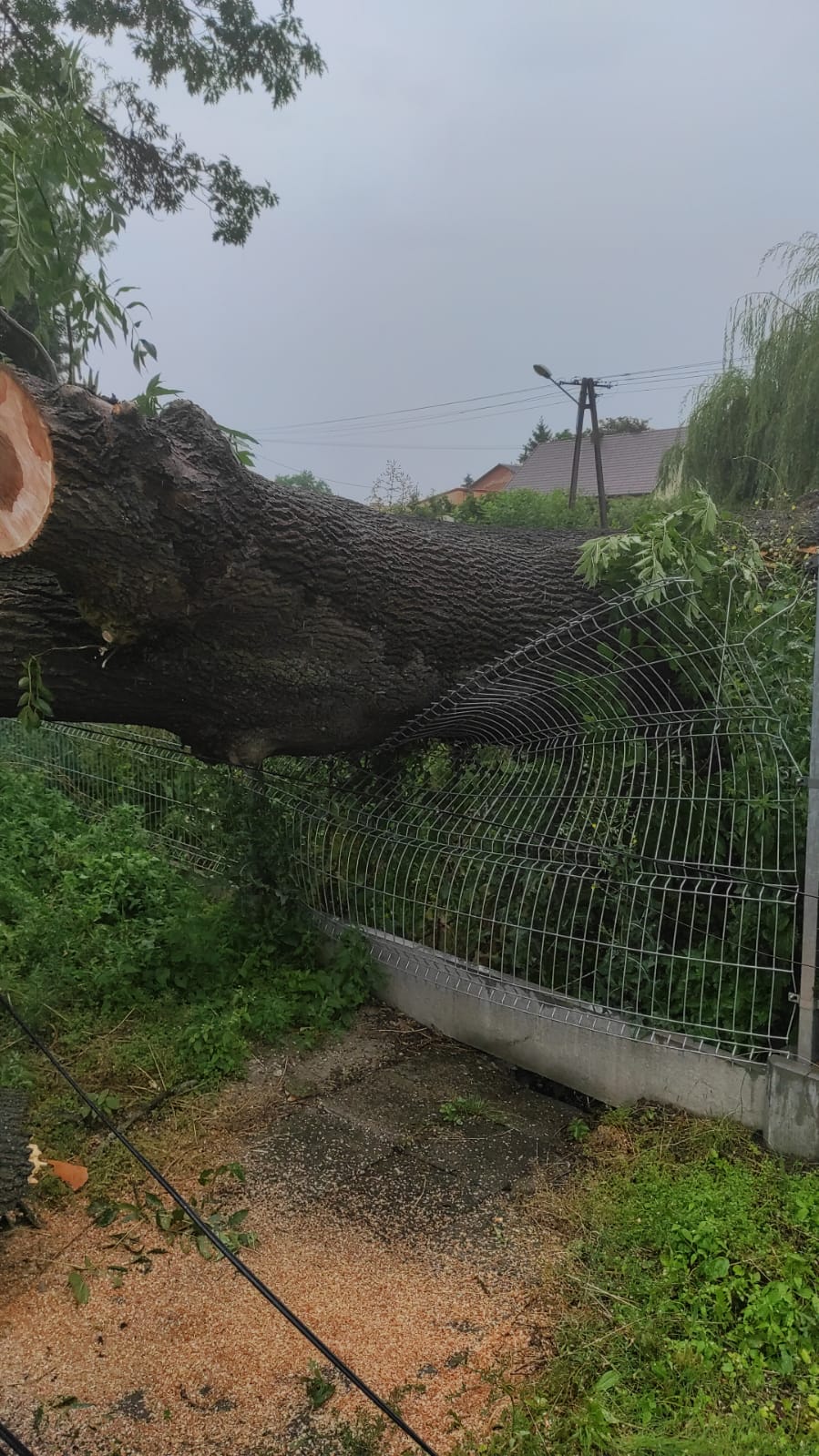 Po dojeździe na miejsce zdarzenia strażacy zastali drzewo leżące na budynku gospodarczym, w którym znajdowały się nawozy, uszkodzone było ogrodzenie posesji, dach budynku oraz nawierzchnia drogi.