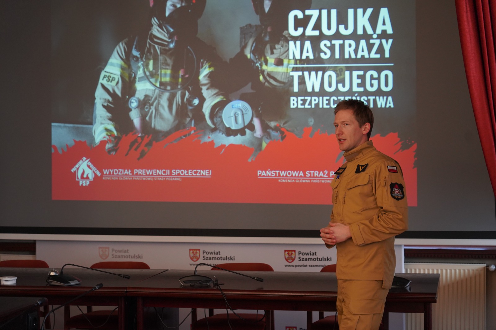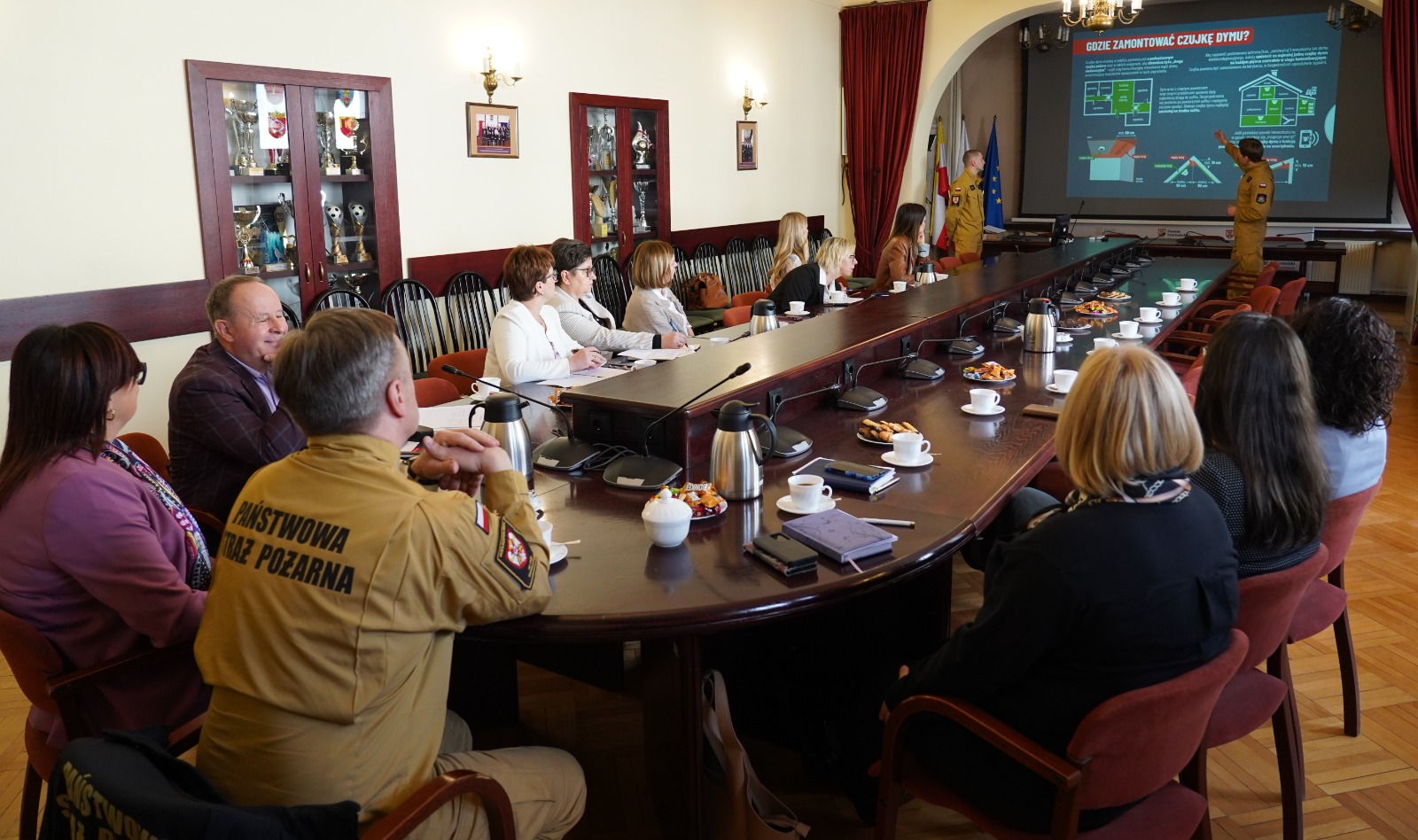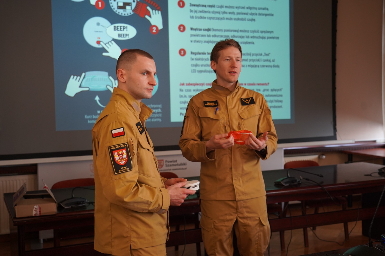 W dniu 9 kwietnia 2026 roku w sali sesyjnej Starostwa Powiatowego w Szamotułach odbyło się spotkanie z udziałem Starosty Powiatu Szamotulskiego Pani Beaty Hanyżak, dyrektora Powiatowego Centrum Pomocy Rodzinie w Szamotułach Pana Jaromira Zielińskiego, przedstawicieli gminnych ośrodków pomocy społecznej (OPS) oraz Komendanta Powiatowego PSP w Szamotułach st. bryg. Ireneusza Persa. Podczas spotkania przekazano czujki dymu i tlenku węgla zakupione przez Ministerstwo Spraw Wewnętrznych i Administracji we współpracy z Komendą Główną Państwowej Straży Pożarnej w ramach programu OLiOC na lata 2025–2026.