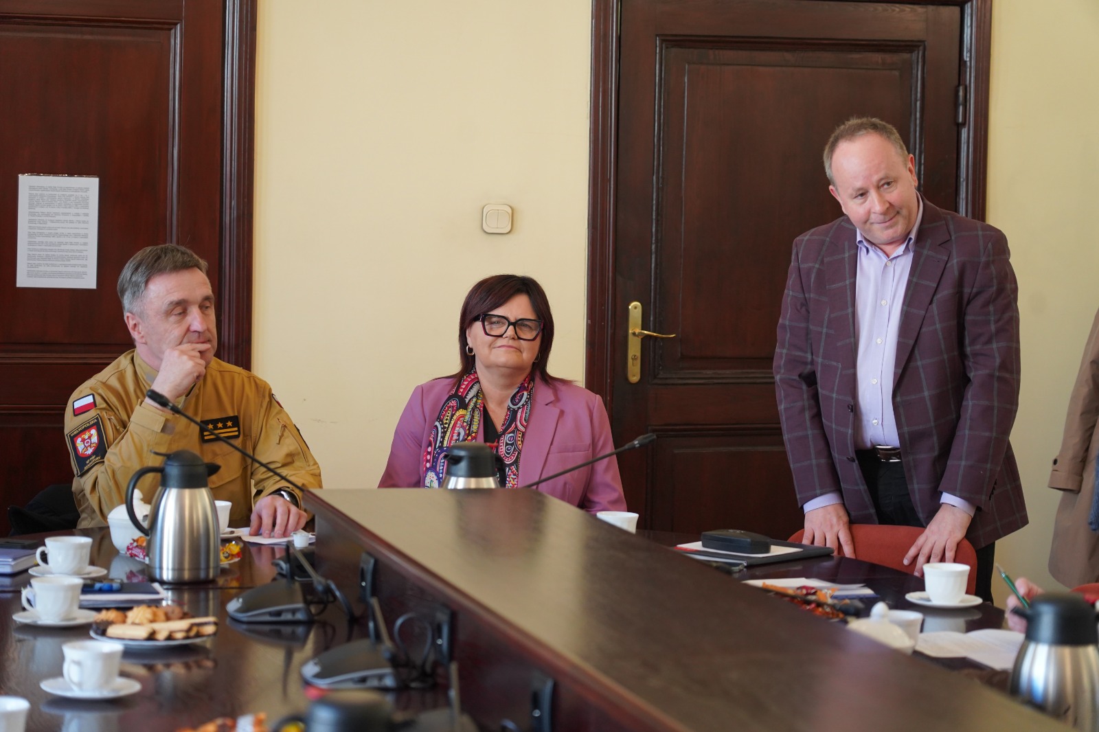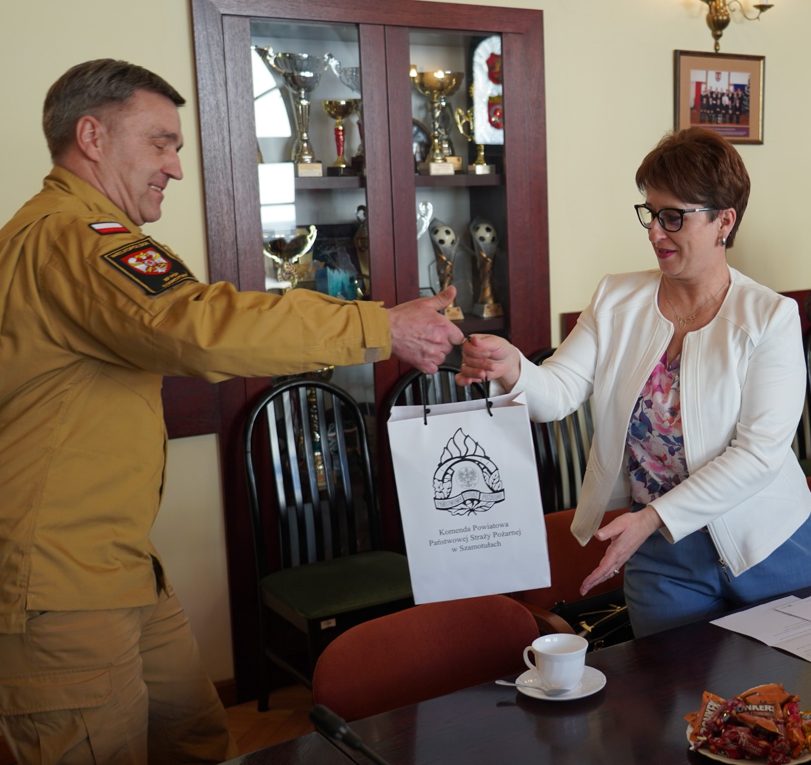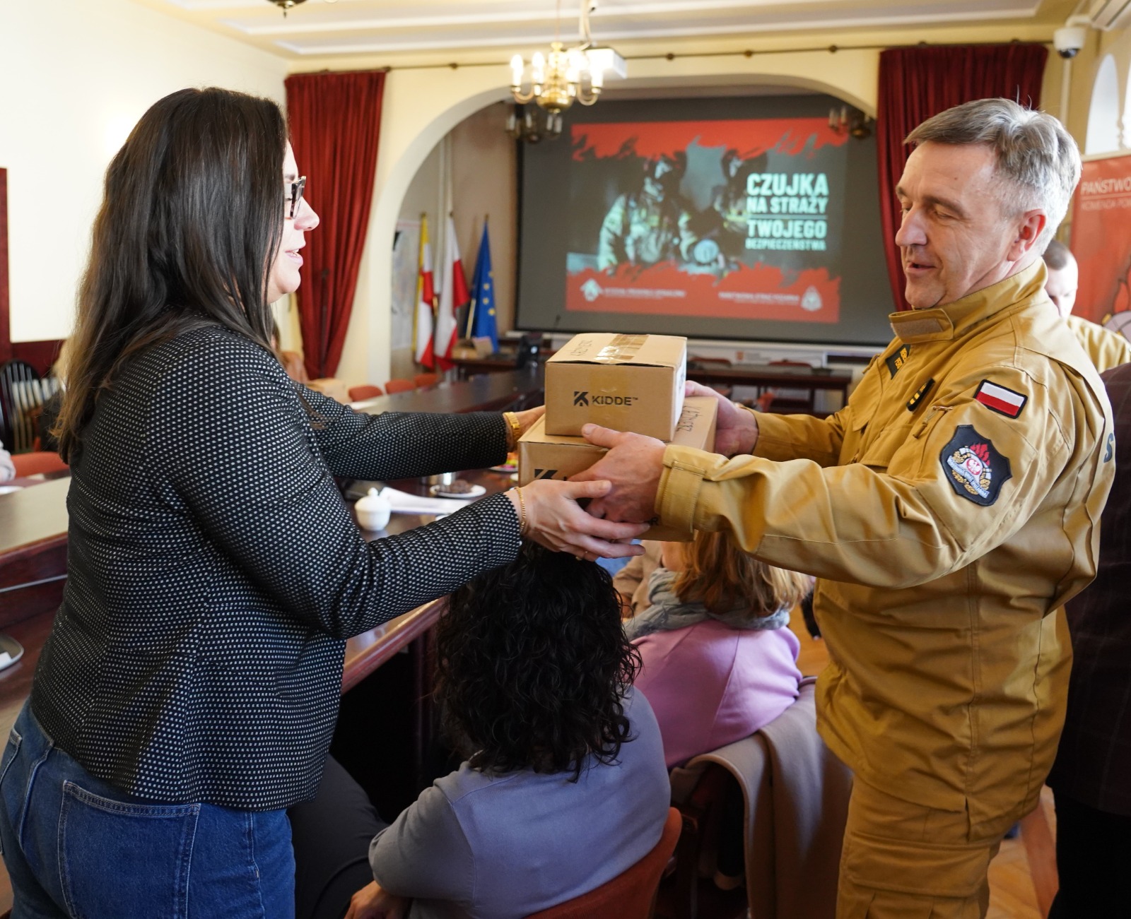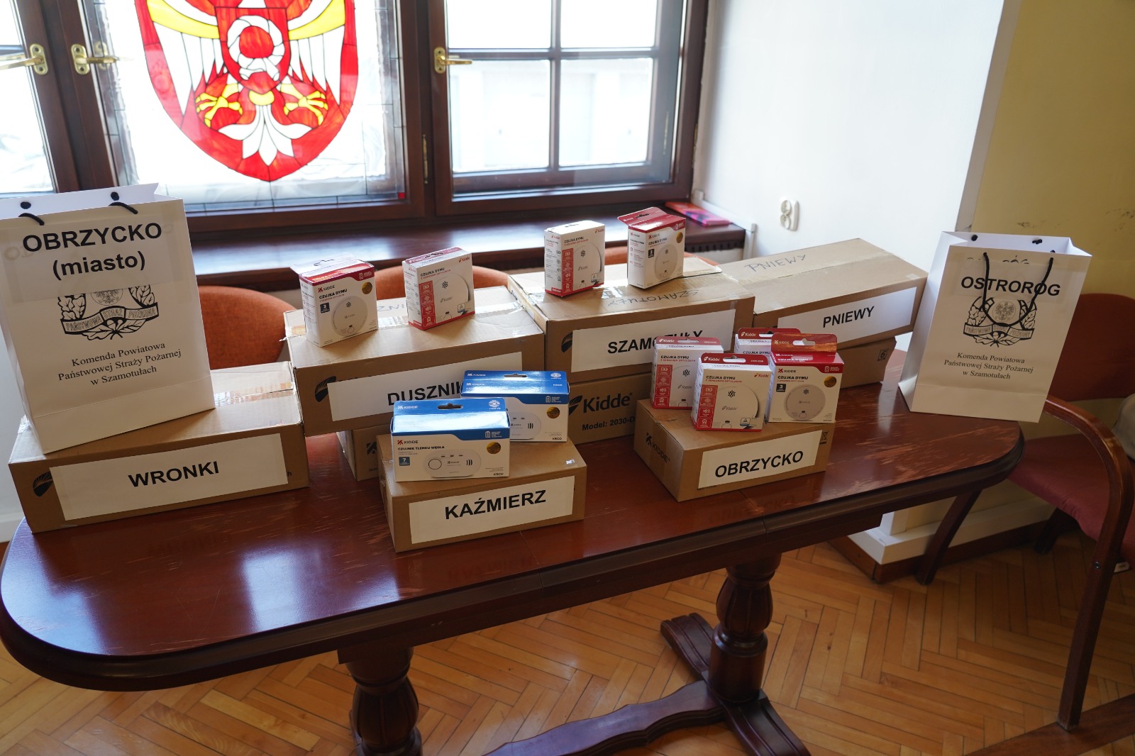 W dniu 9 kwietnia 2026 roku w sali sesyjnej Starostwa Powiatowego w Szamotułach odbyło się spotkanie z udziałem Starosty Powiatu Szamotulskiego Pani Beaty Hanyżak, dyrektora Powiatowego Centrum Pomocy Rodzinie w Szamotułach Pana Jaromira Zielińskiego, przedstawicieli gminnych ośrodków pomocy społecznej (OPS) oraz Komendanta Powiatowego PSP w Szamotułach st. bryg. Ireneusza Persa. Podczas spotkania przekazano czujki dymu i tlenku węgla zakupione przez Ministerstwo Spraw Wewnętrznych i Administracji we współpracy z Komendą Główną Państwowej Straży Pożarnej w ramach programu OLiOC na lata 2025–2026.