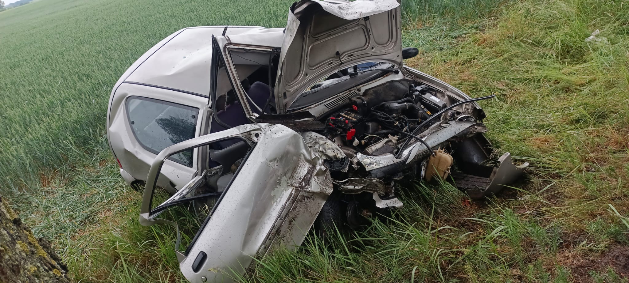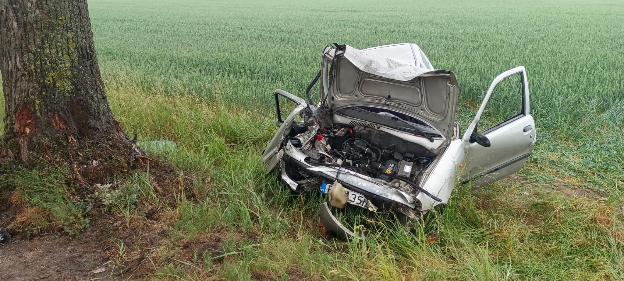 W środę, 28 maja 2025 roku o godz. 14.20 do dyżurnego Stanowiska Kierowania Państwowej Straży Pożarnej w Szamotułach wpłynęło zgłoszenie z Centrum Powiadamiania Ratunkowego, które informowało o uderzeniu samochodu osobowego w drzewo oraz jednej osobie poszkodowanej uwiezionej wewnątrz pojazdu na trasie Wróblewo-Wierzchocin.