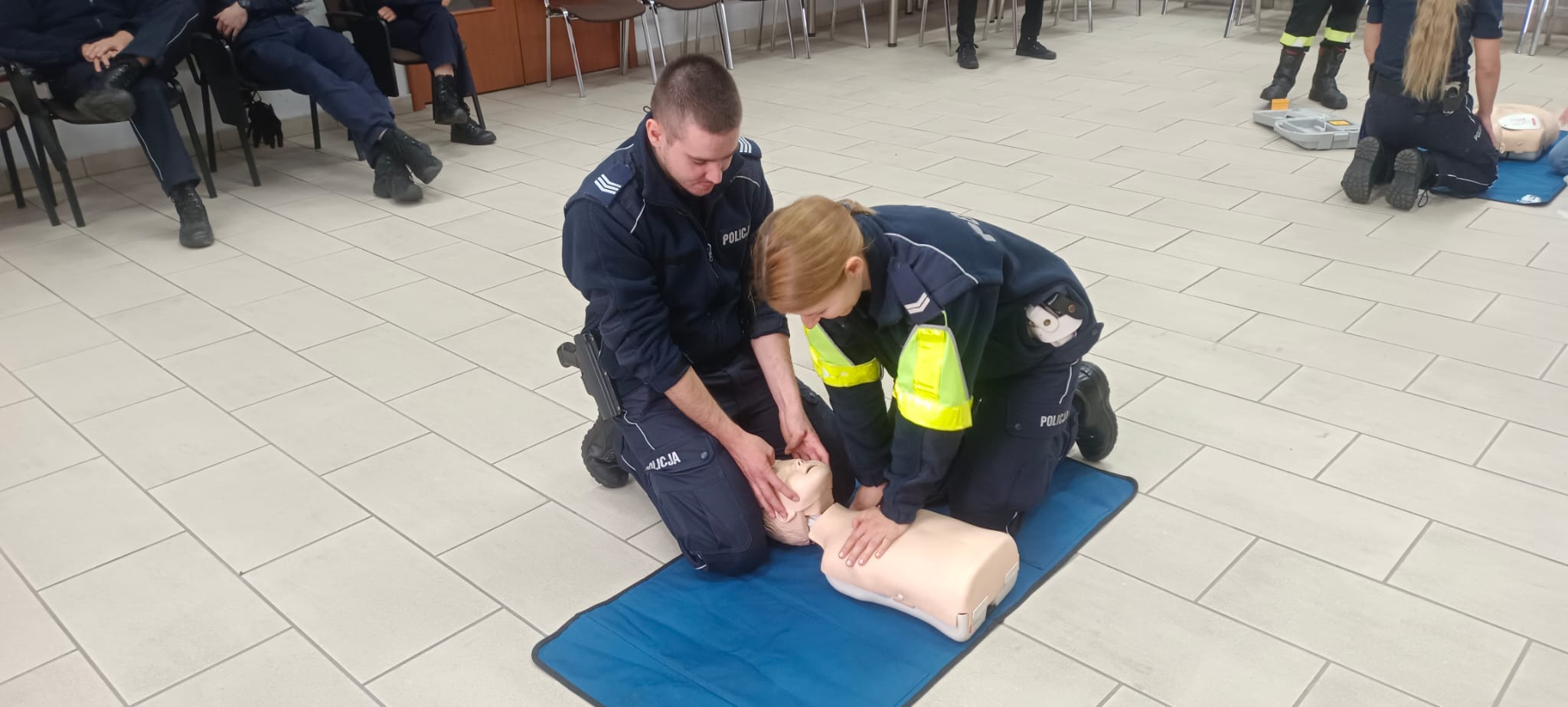 Strażacy w ramach powyższego szoklenia, zapoznali funkcjonariuszy Policji z zasadami udzielania pomocy przedlekarskiej oraz procedurami związanymi z udzielaniem pierwszej pomocy. Najbardziej istotnym jednak było przeprowadzenie ćwiczeń praktycznych z udzielania takiej pomocy. W ramach powyższego policjanci mieli okazję poszerzyć wiedzę i umiejętności w zakresie udzielania pomocy osobie poszkodowanej m. in. w sytuacjach zatrzymania krążenia, zadławienia, omdlenia, czy też w przypadkach różnego rodzaju urazów i złamań. Zajęcia prowadzone są z wykorzystaniem fantomów oraz defibrylatora AED.
