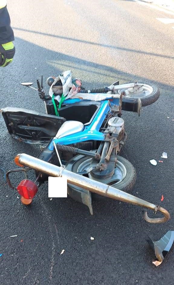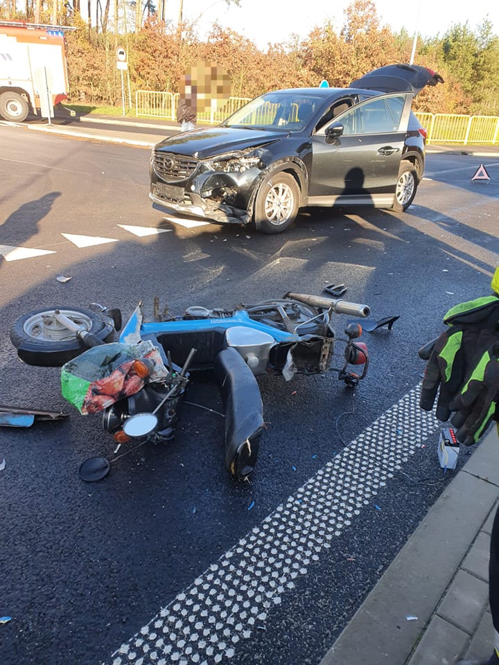 Po dojeździe na miejsce zdarzenia strażacy zastali samochód osobowy i skuter leżący na środku skrzyżowania. Kierujący pojazdami znajdowali się w pobliżu, jedna osoba została poszkodowana.