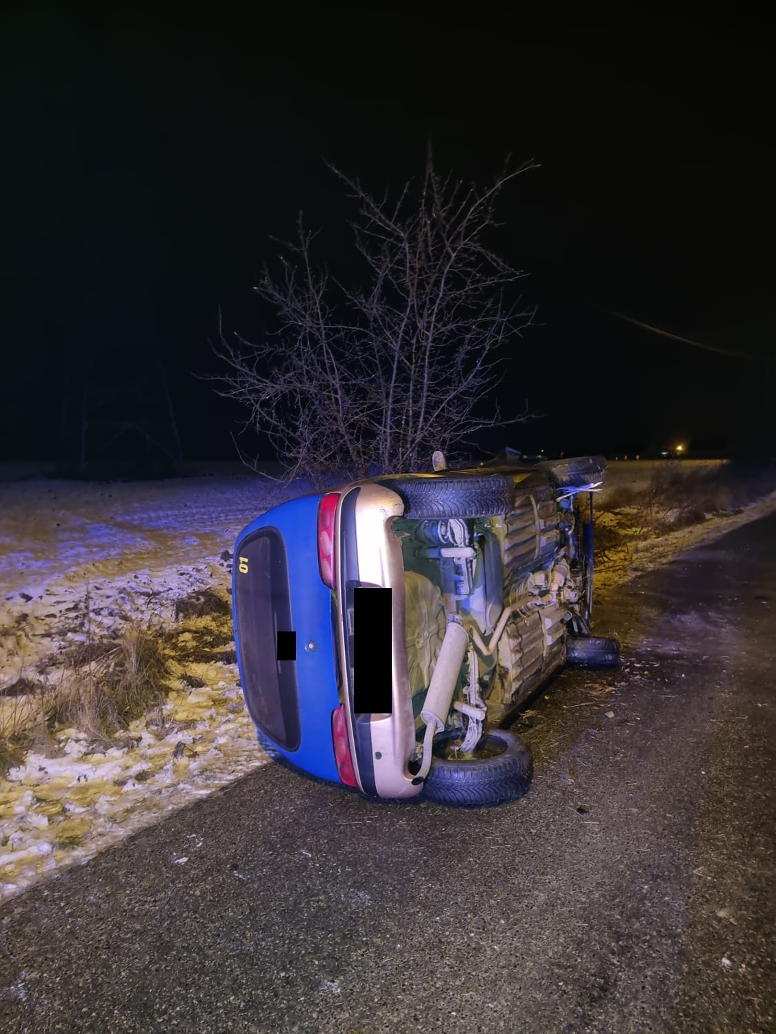 Po dojeździe na miejsce zdarzenia strażacy zastali samochód osobowy w pozycji na boku, który znajdował się na drodze. Kierujący opuścił pojazd przed przybyciem SP i znajdował się w pobliżu.