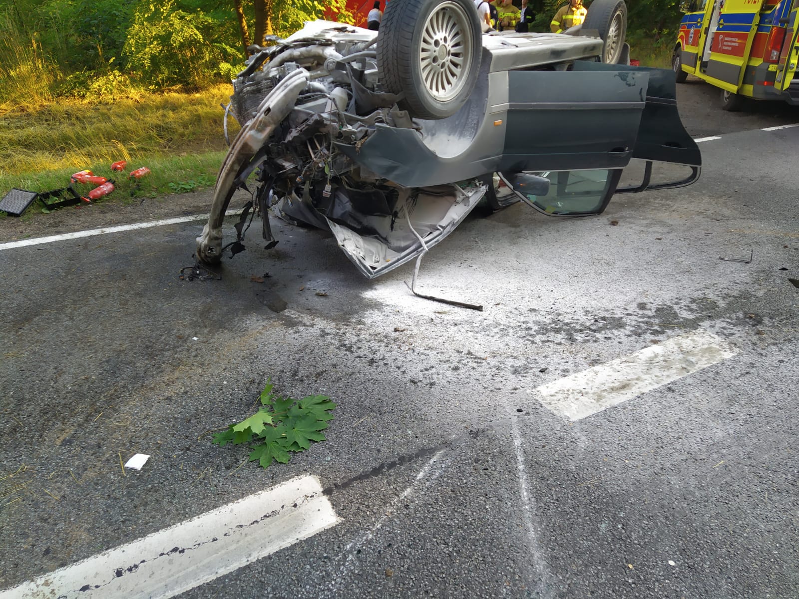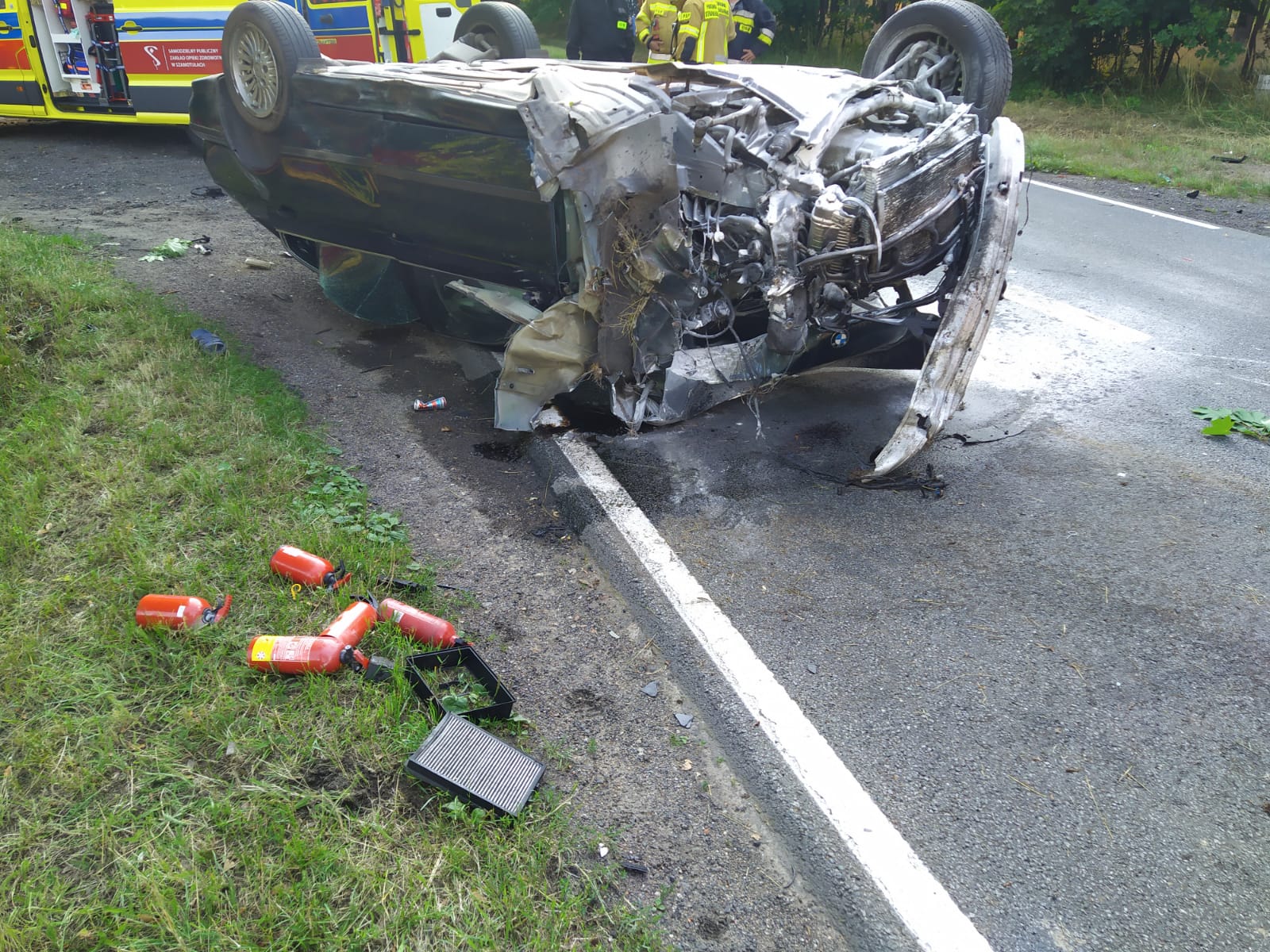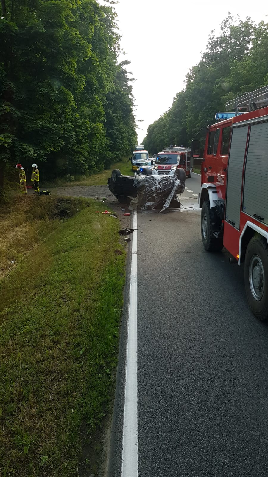Po dojeździe na miejsce zdarzenia ratownicy zastali leżący na dachu blokujący jeden pas ruchu samochód osobowy, kierujący pojazdem oraz pasażerowie zostali uwolnieni z pojazdu przez świadków zdarzenia. Świadkowie ugasili palący się samochód przed przybyciem jednostek SP.