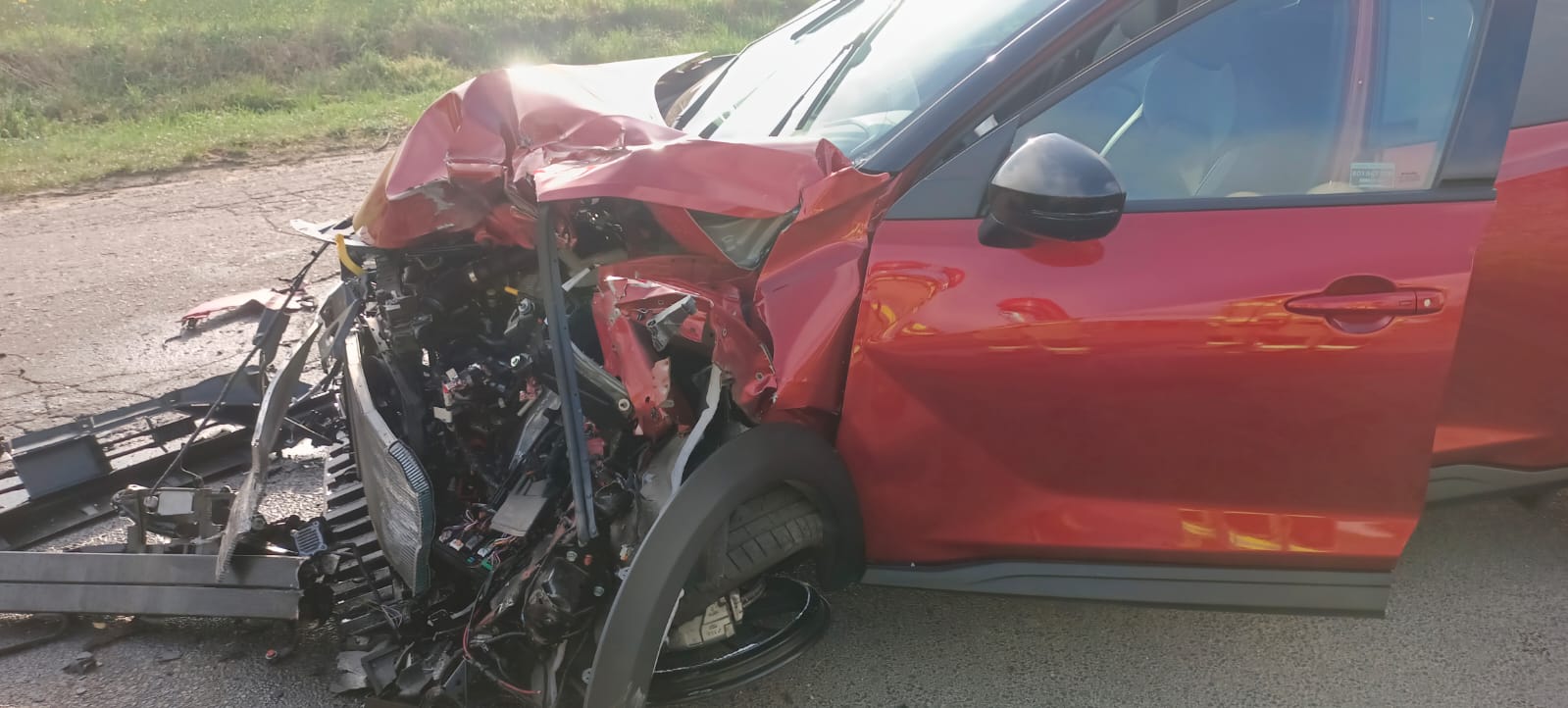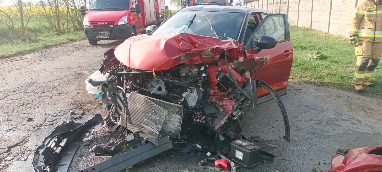 Po dojeździe na miejsce zdarzenia strażacy zastali samochód osobowy Nissan, który uderzył w bok naczepy pojazdu ciężarowego. Kierujący i pasażerowie opuścili pojazdy przed przybyciem SP i znajdowali się w pobliżu.
