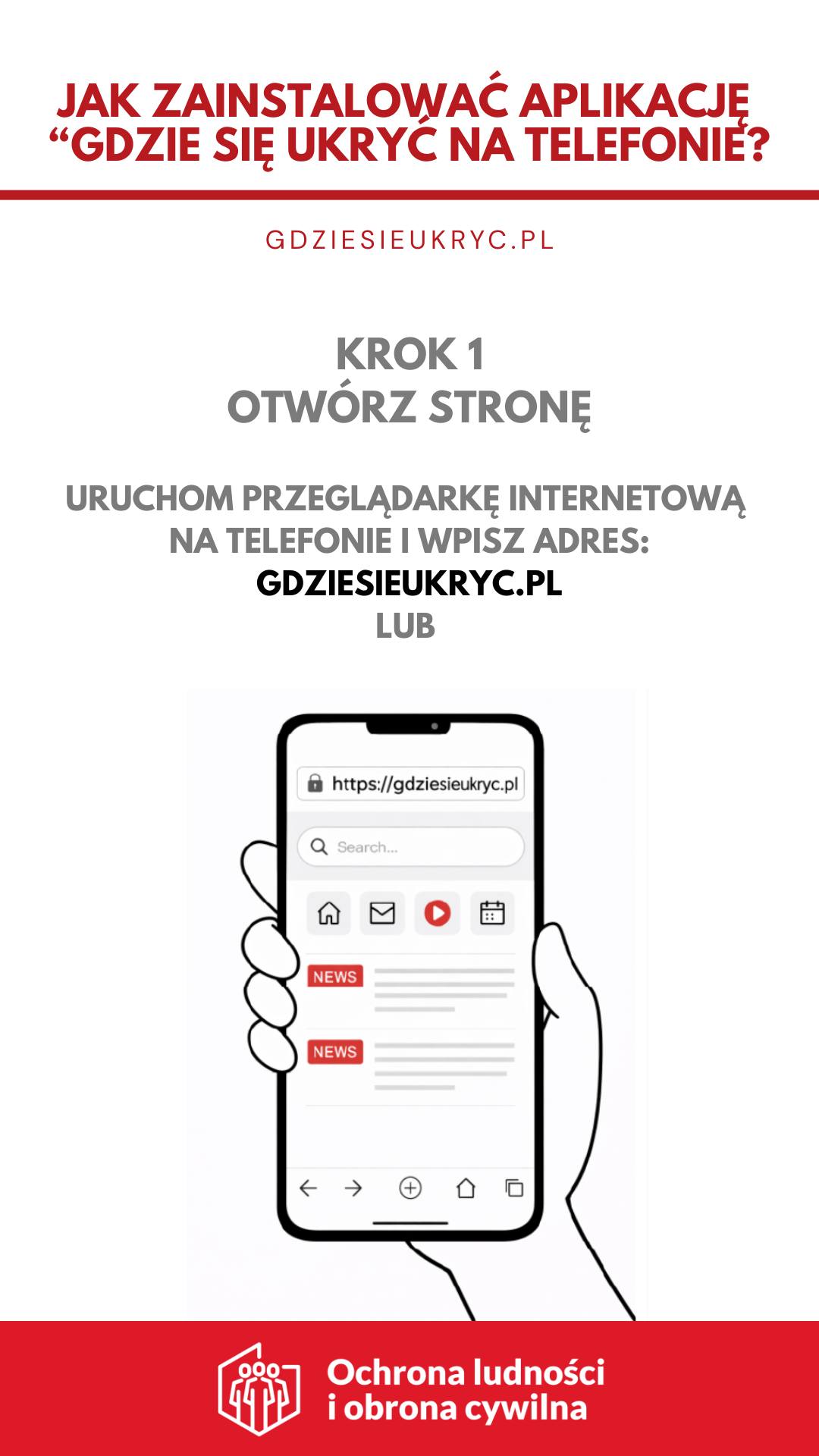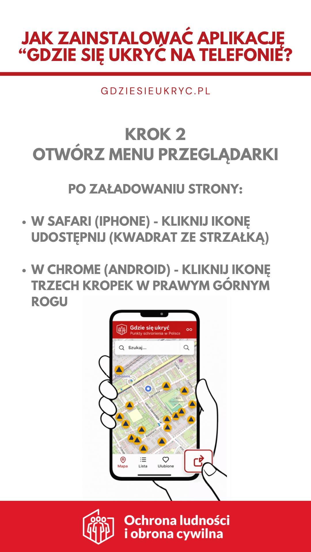 „Gdzie się ukryć” to nowoczesne i przyjazne narzędzie, które może posiadać każdy obywatel. Zostało zaprojektowana z myślą o prostocie i skuteczności: wystarczy telefon komórkowy typu smartfon by w sytuacji nagłego zagrożenia – np. bardzo silnego wiatru czy potencjalnych zagrożenie środkami napadu powietrznego – szybko odnaleźć najbliższe Punkty Schronienia (PS) oraz uruchomić nawigację na mapie. Co ważne, po wcześniejszym pobraniu danych aplikacja działa również w trybie offline.