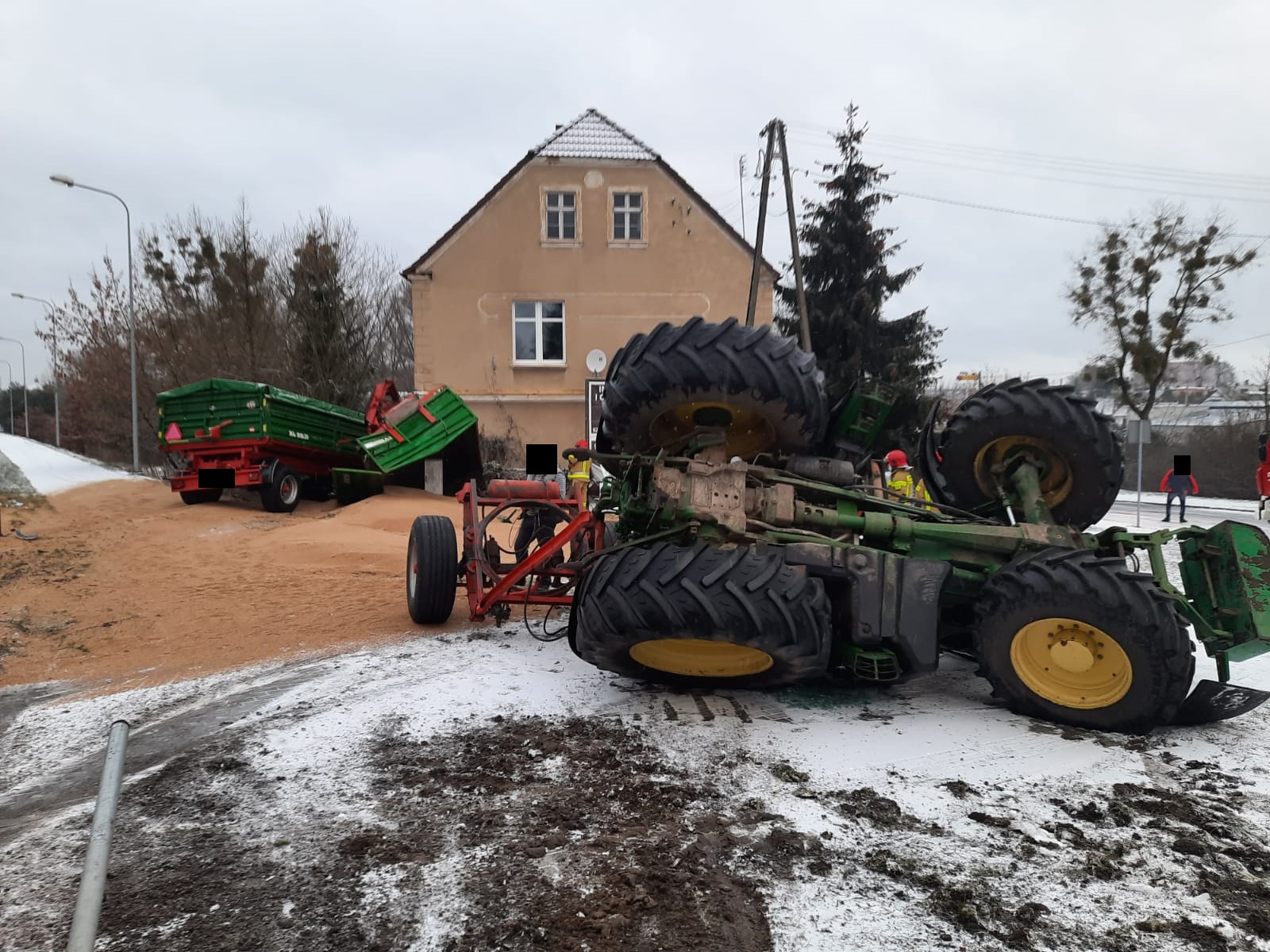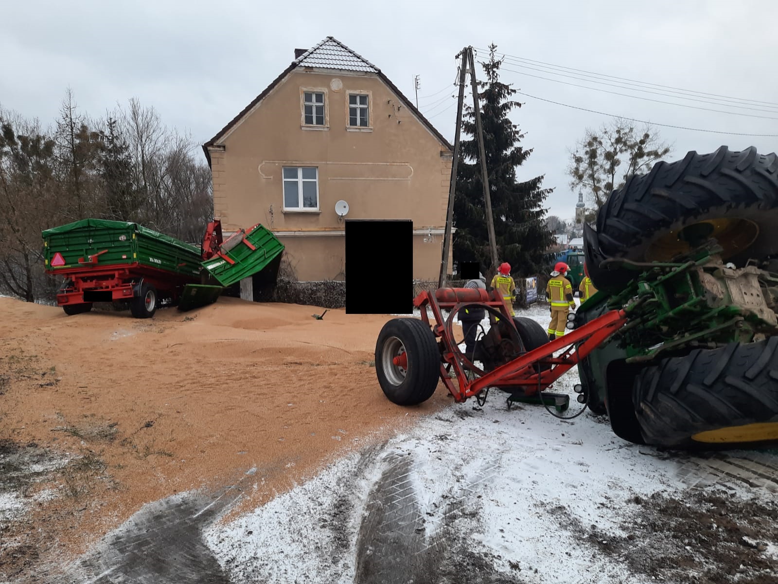Po dojeździe na miejsce zdarzenia strażacy zastali przewrócony ciągnik rolniczy oraz dwie przyczepy, które znajdowały się w pobliżu budynku. Z uszkodzonej przyczepy wysypało się zboże. Kierujący opuścił pojazd przed przybyciem SP i znajdował się w pobliżu.