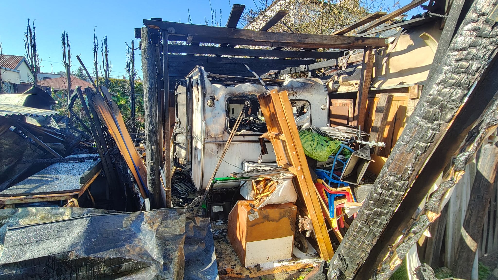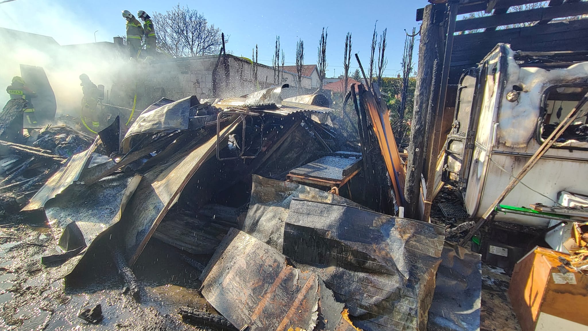 Spaleniu uległ drewniany garaż z wyposażeniem, dwie wiaty o konstrukcji drewnianej, przyczepa kempingowa oraz opony.