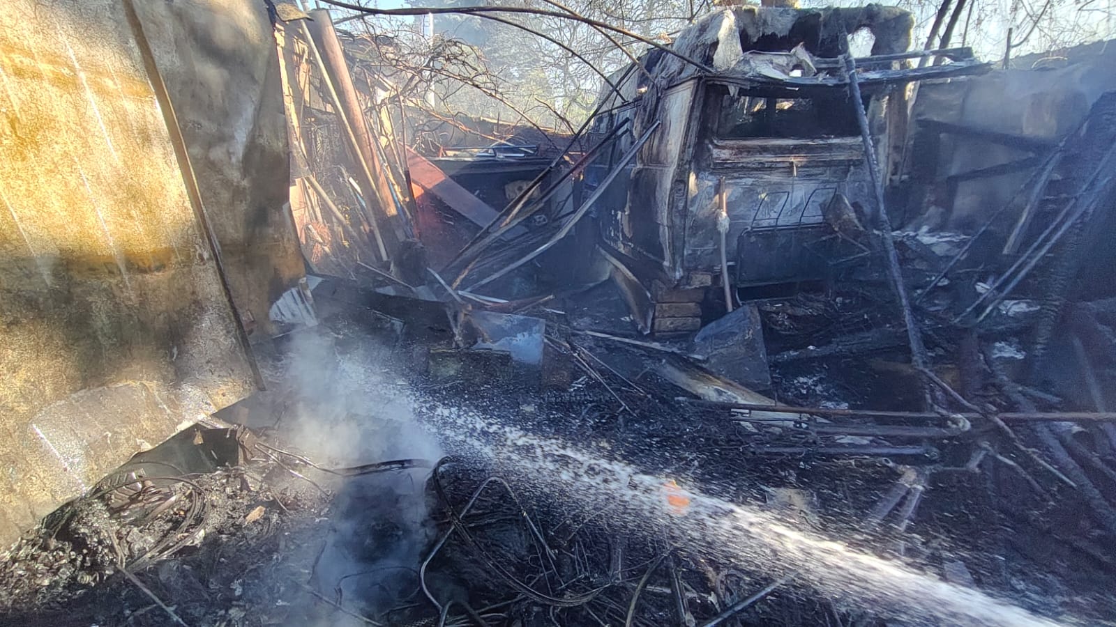 Działania SP polegały na zabezpieczeniu miejsca zdarzenia, podaniu trzech prądów gaśniczych w natarciu na palący się garaż, drewniane wiaty i przyczepę kempingową, podaniu dwóch prądów gaśniczych w obronie na pobliskie garaże, przewietrzeniu i oddymieniu budynku, wyniesieniu na zewnątrz butli z gazem propan-butan, chłodzeniu butli, sprawdzeniu obiektów kamerą termowizyjną w celu wykluczenia innych zarzewi ognia, wyniesieniu nadpalonego wyposażenia garażu i wiaty oraz dogaszeniu pogorzeliska.