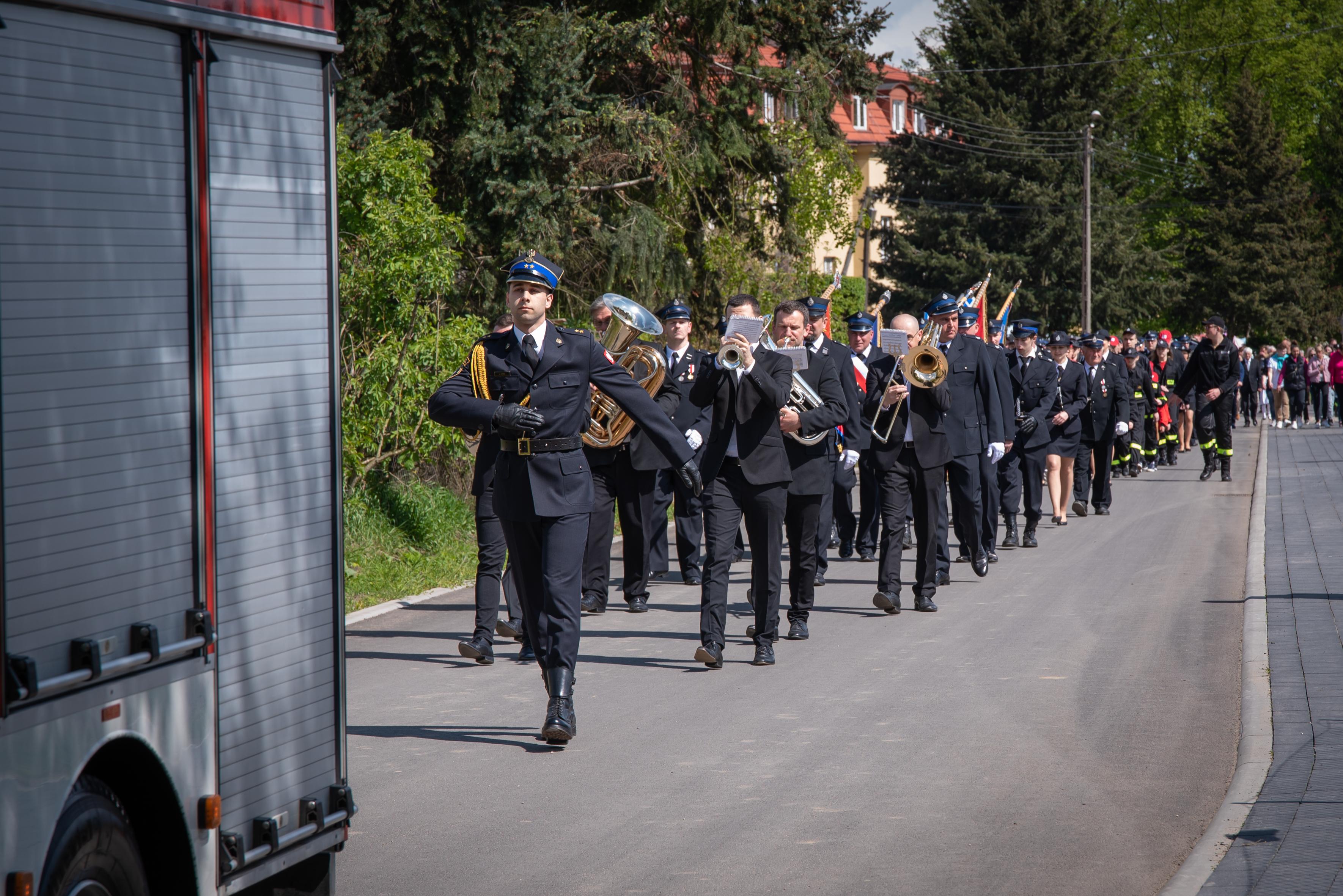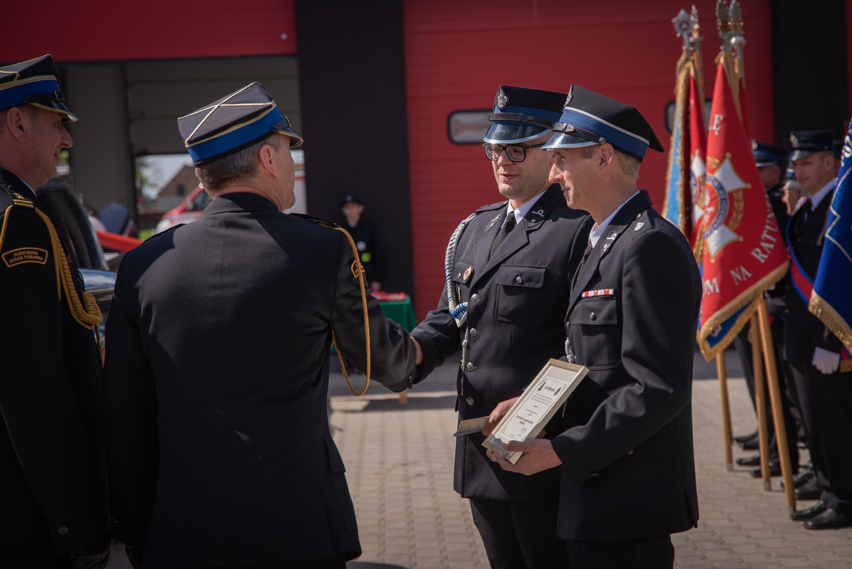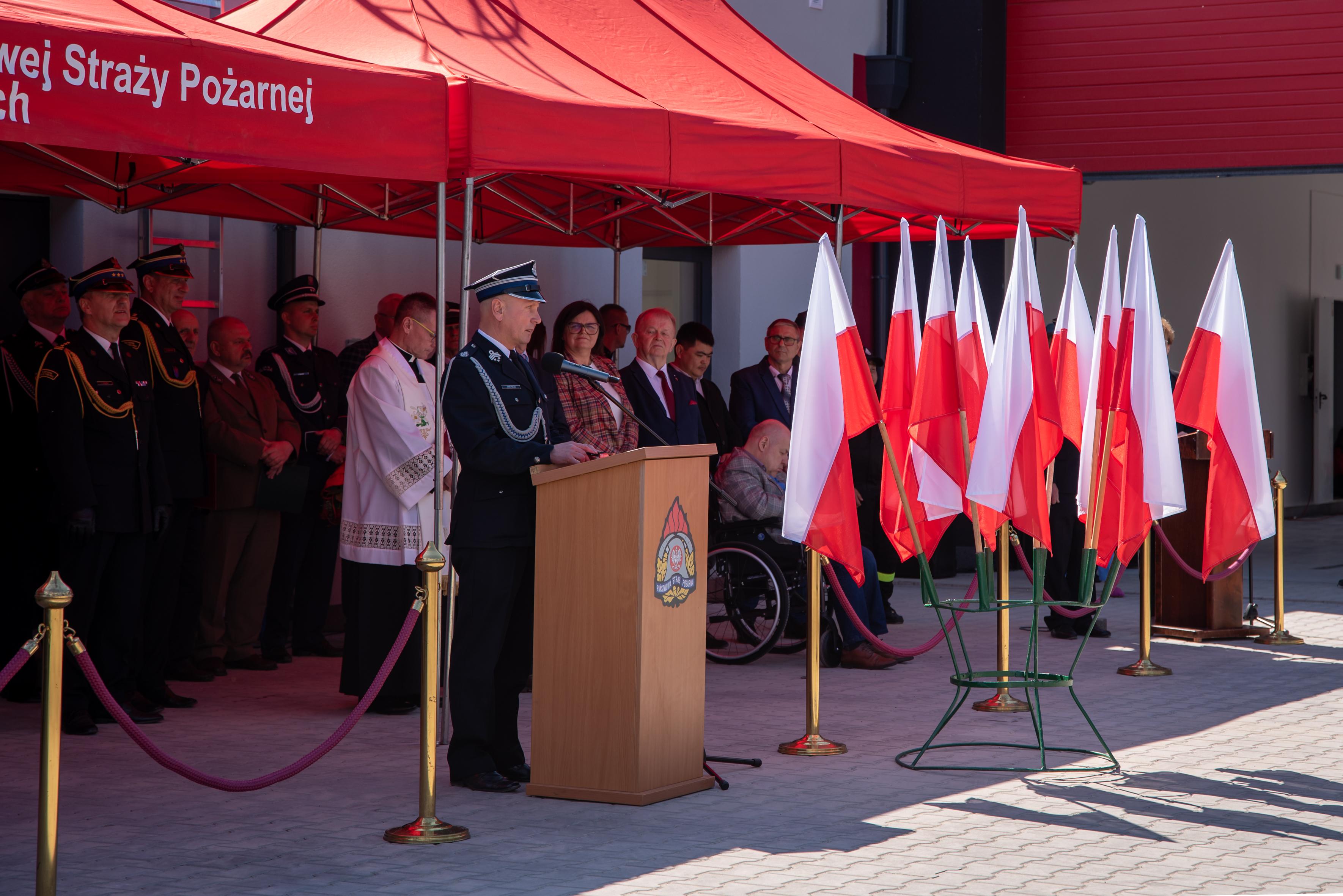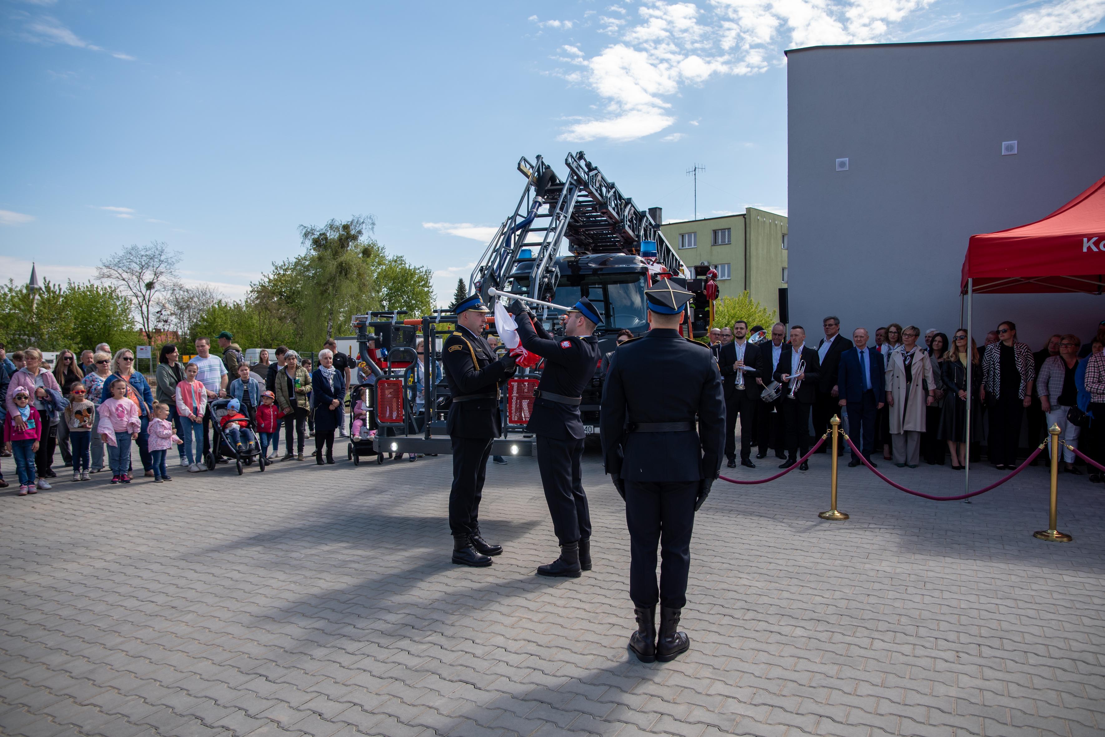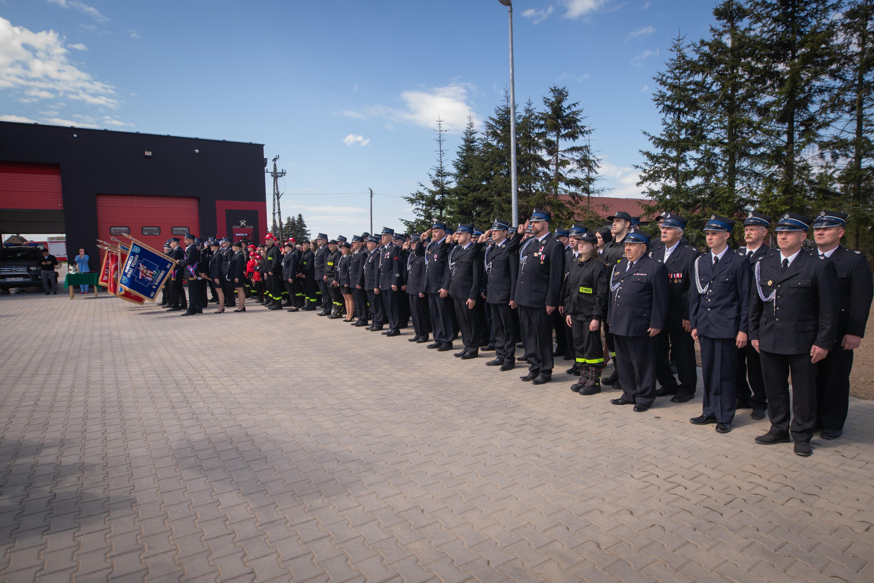 Następnie poczty sztandarowe wraz pododdziałami i zaproszonymi gościmy przemaszerowały na plac przed nową strażnicą w Ostrorogu. Dowódca uroczystości mł. kpt. Jakub Łyko złożył meldunek