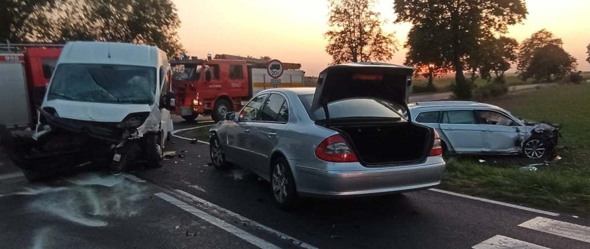 Dwa pojazdy znajdowały się na środku skrzyżowania, natomiast jeden samochód znajdował się poza drogą.