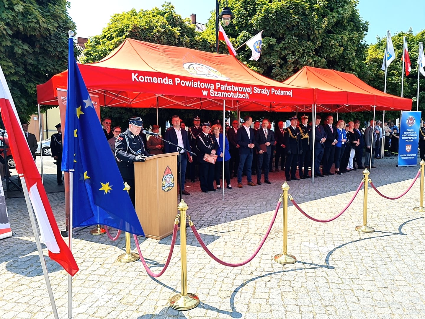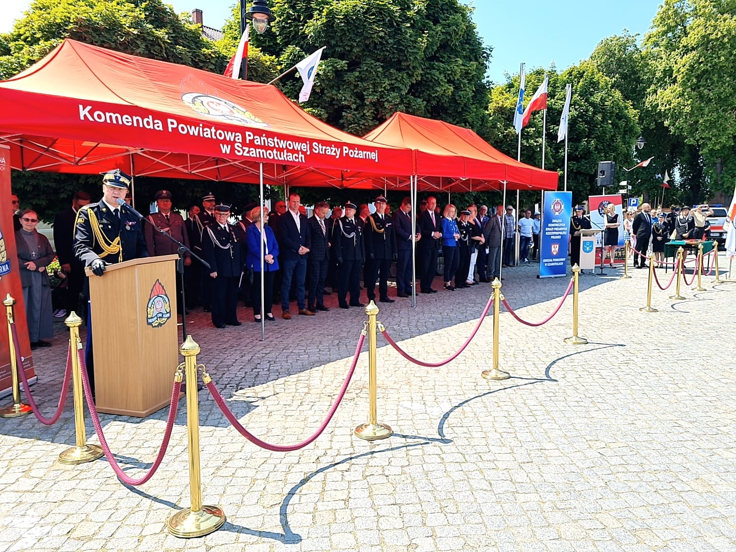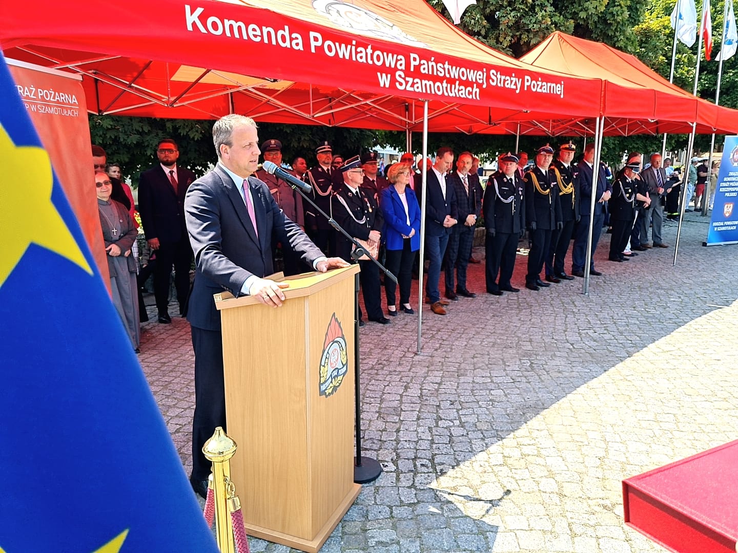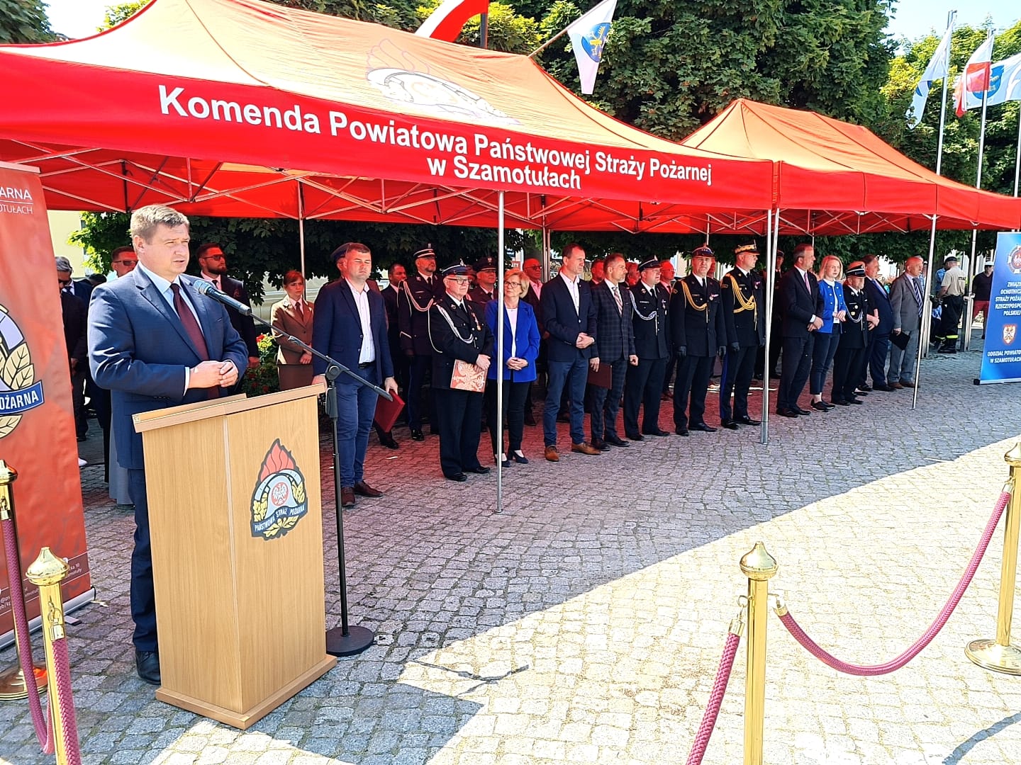 Podczas uroczystości Wojewoda Wielkopolski Michał Zieliński, Wielkopolski Komendant Wojewódzki nadbrygadier Dariusz Matczak oraz Wice Starosta Powiatu szamotulskiego wręczyli Komendantowi Powiatowemu PSP w Szamotułach promesę na zakup nowego samochodu pożarniczego drabiny SD 30.