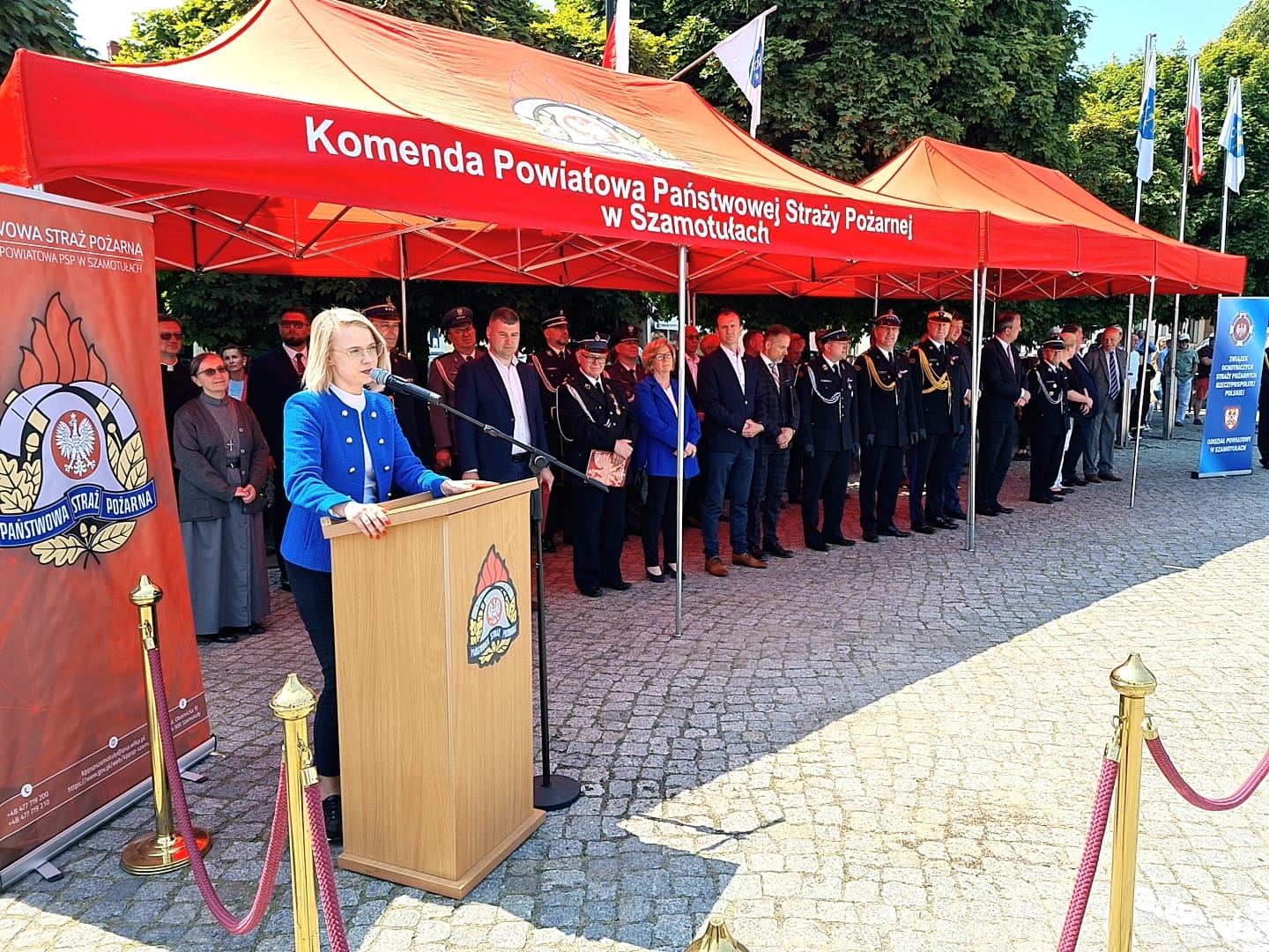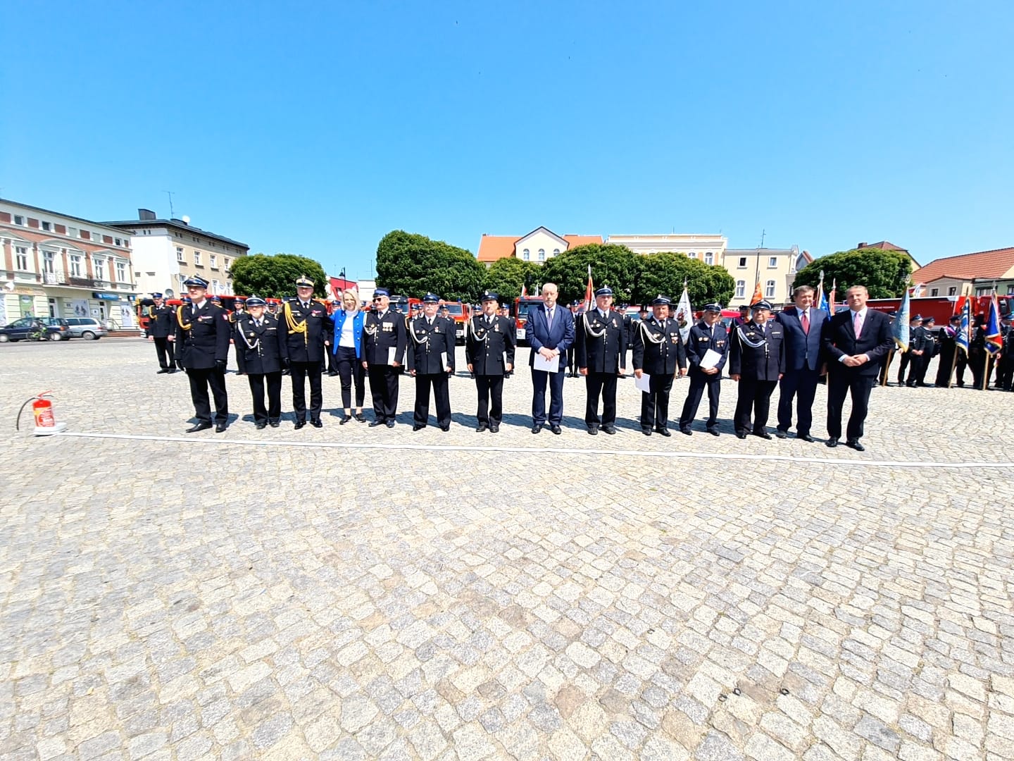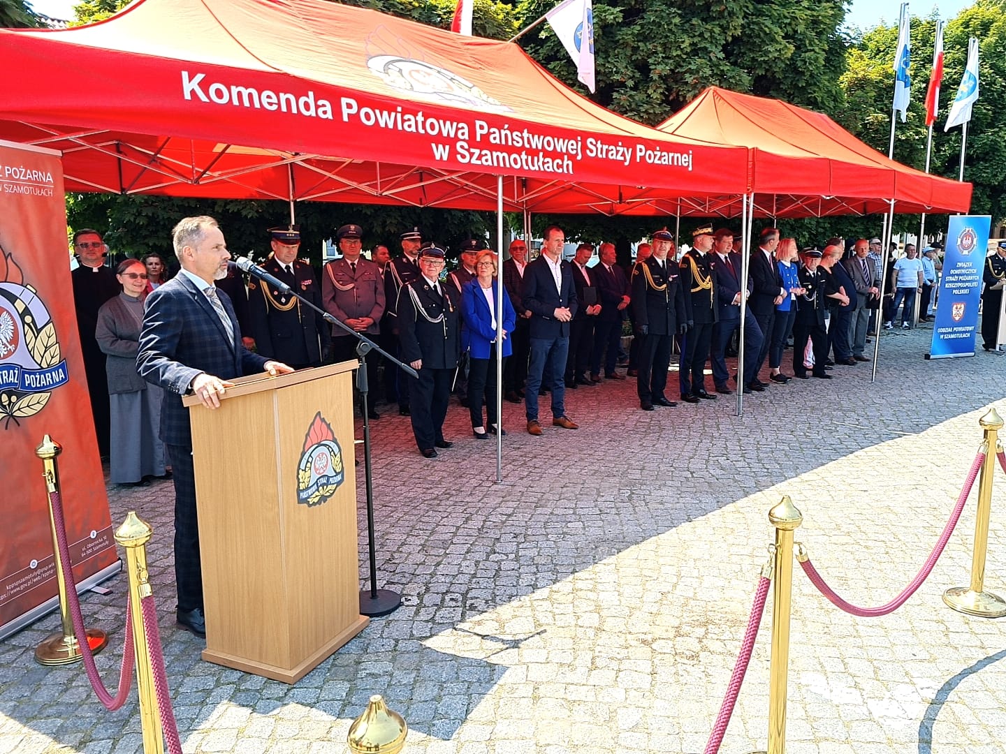 Podczas uroczystości Wojewoda Wielkopolski Michał Zieliński, Wielkopolski Komendant Wojewódzki nadbrygadier Dariusz Matczak oraz Wice Starosta Powiatu szamotulskiego wręczyli Komendantowi Powiatowemu PSP w Szamotułach promesę na zakup nowego samochodu pożarniczego drabiny SD 30.