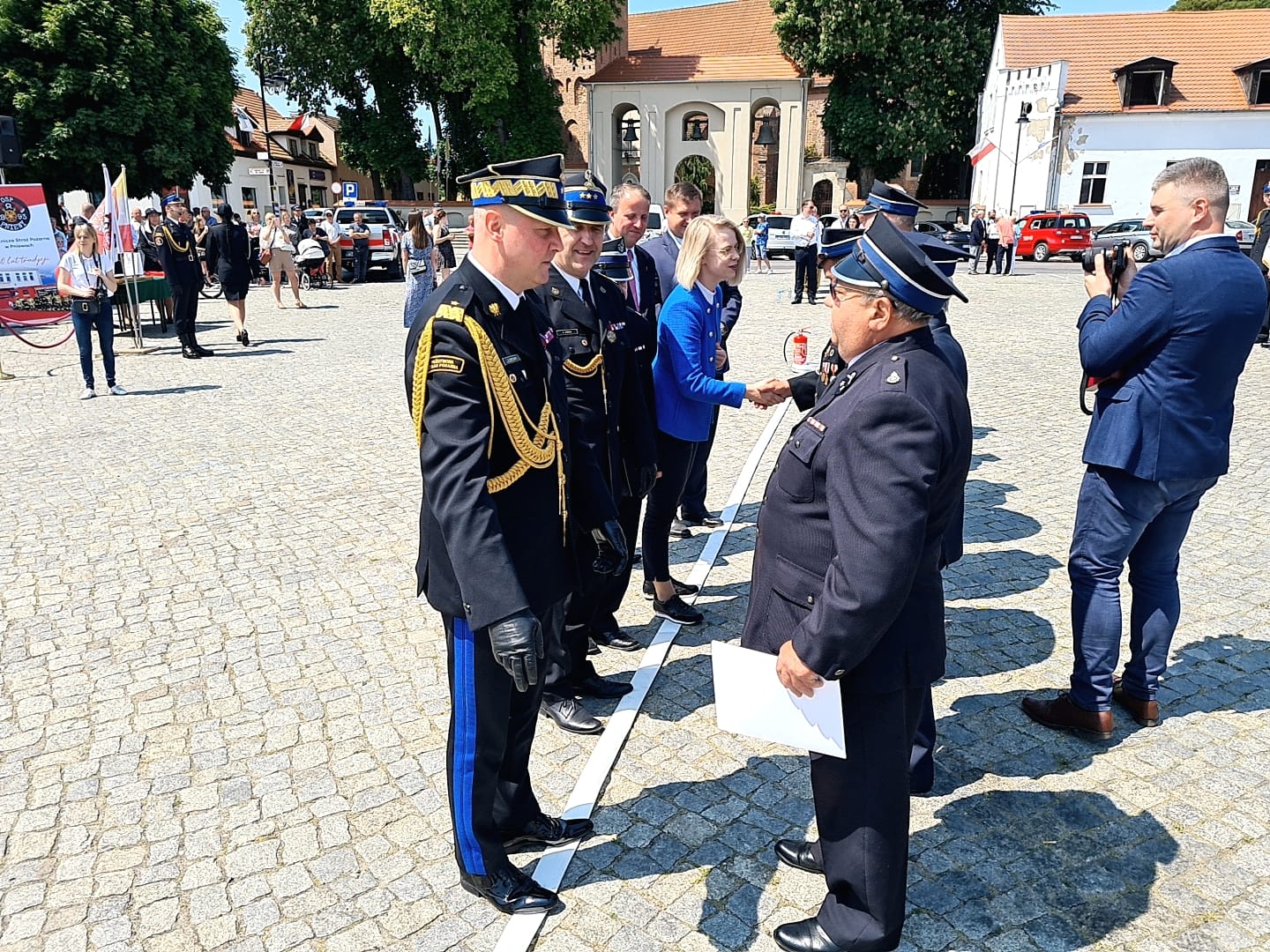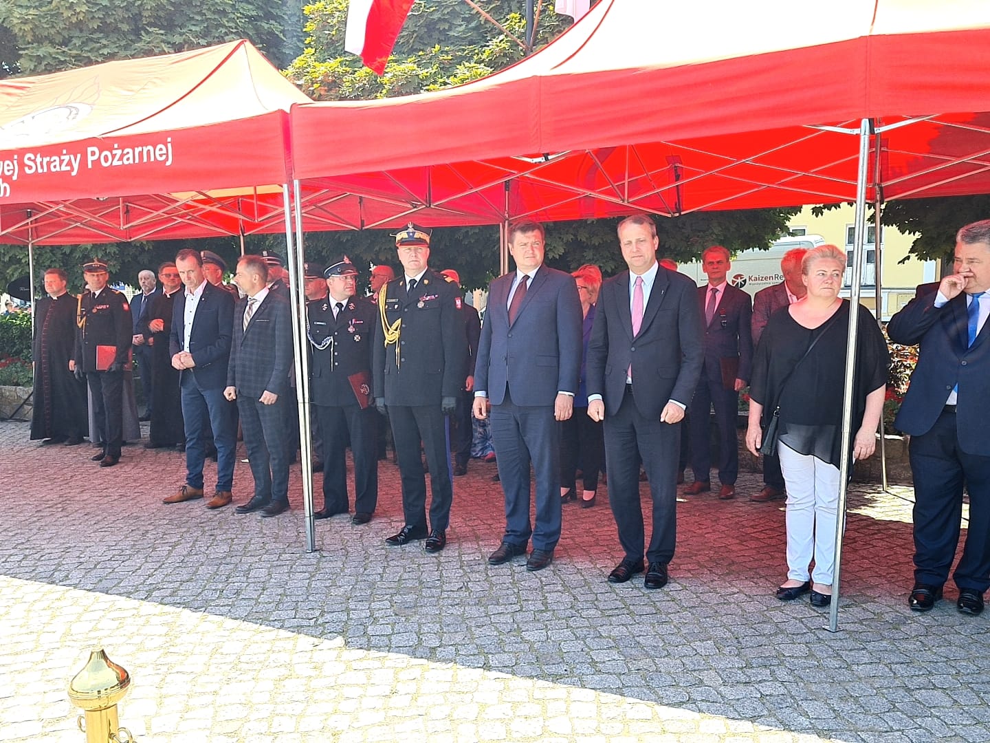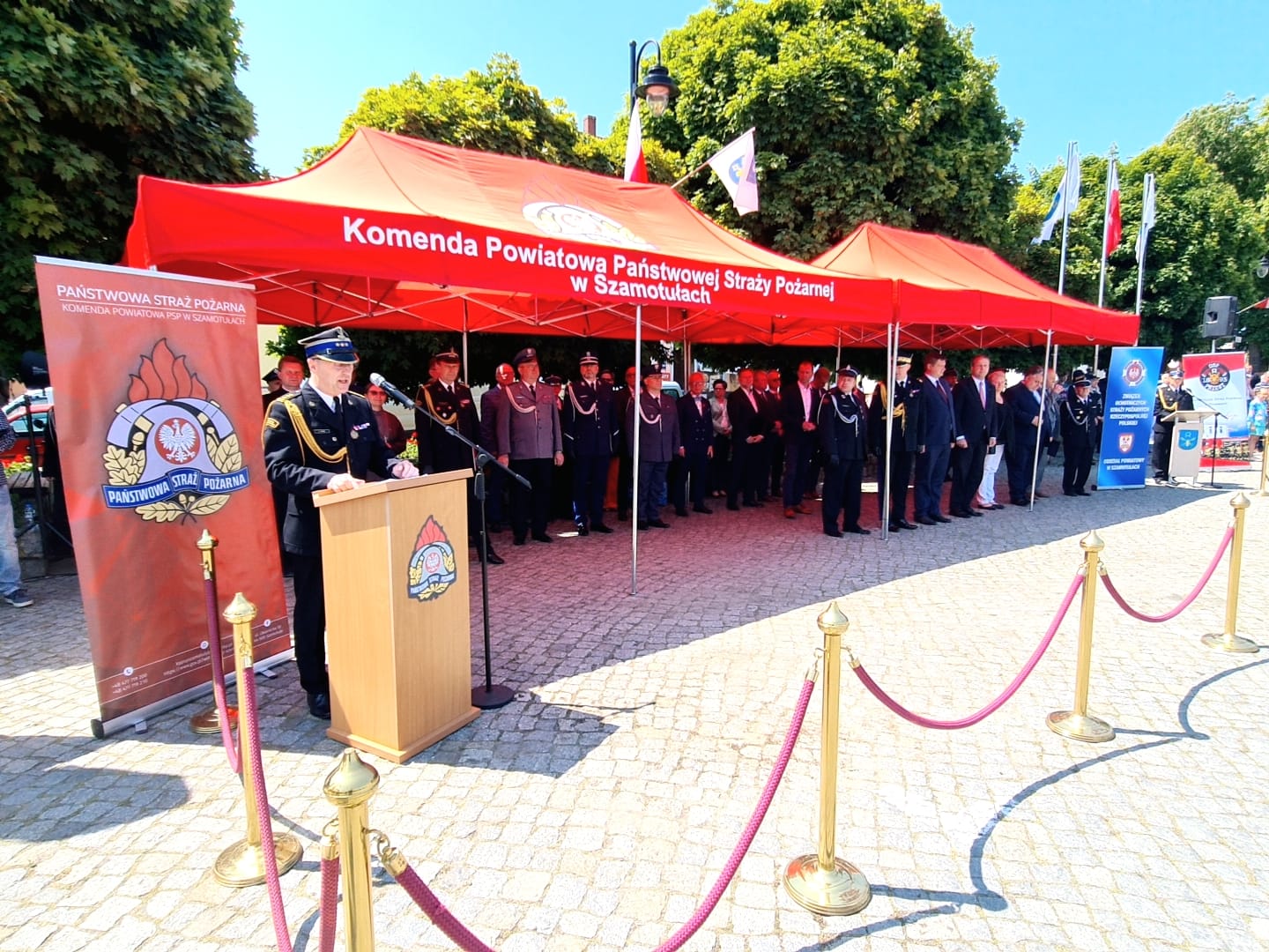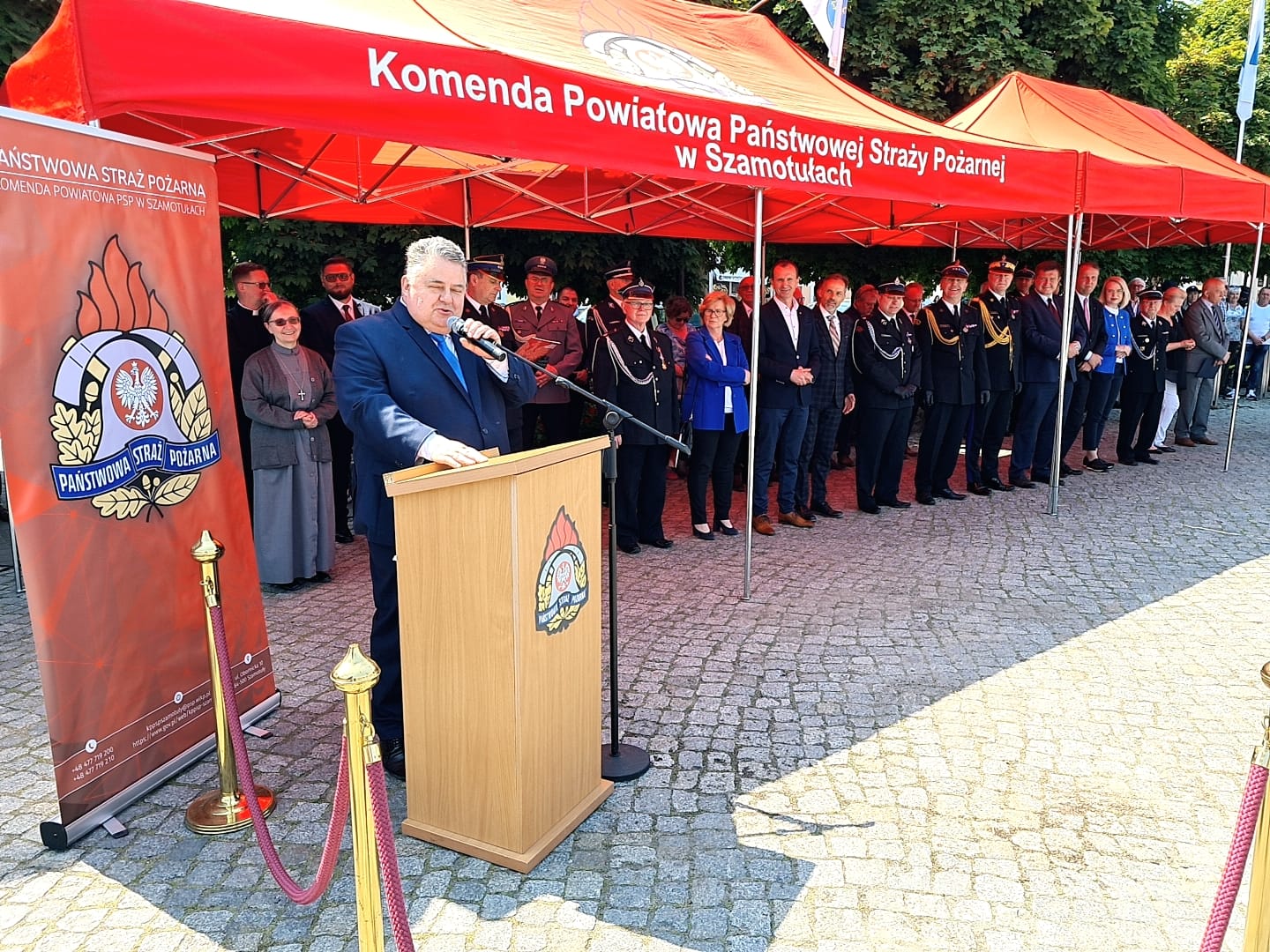 Podczas uroczystości Wojewoda Wielkopolski Michał Zieliński, Wielkopolski Komendant Wojewódzki nadbrygadier Dariusz Matczak oraz Wice Starosta Powiatu szamotulskiego wręczyli Komendantowi Powiatowemu PSP w Szamotułach promesę na zakup nowego samochodu pożarniczego drabiny SD 30.