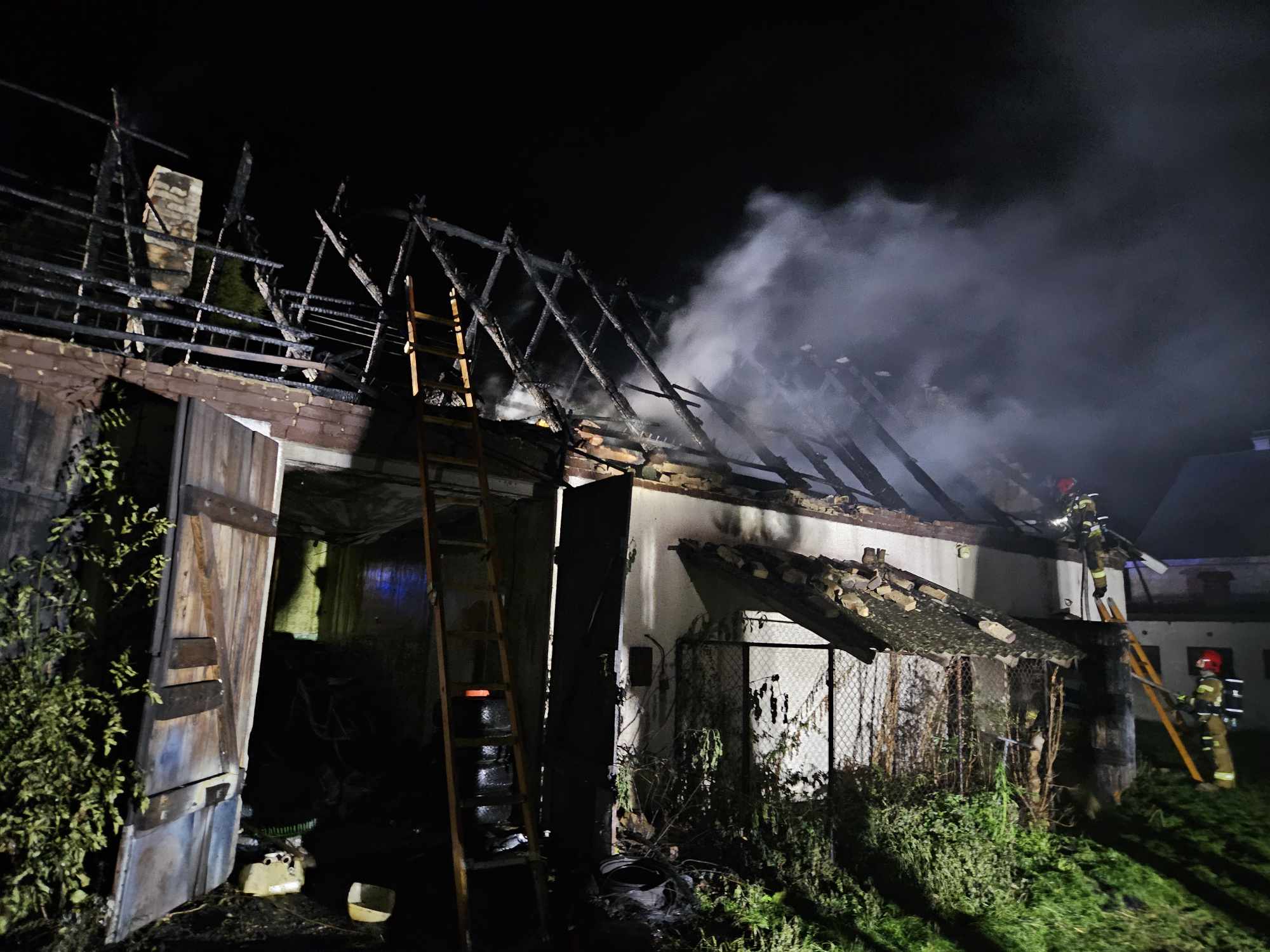 Spaleniu uległa drewniana więźba dachowa i dach budynku gospodarczego oraz baloty słomy znajdujące się na poddaszu budynku.