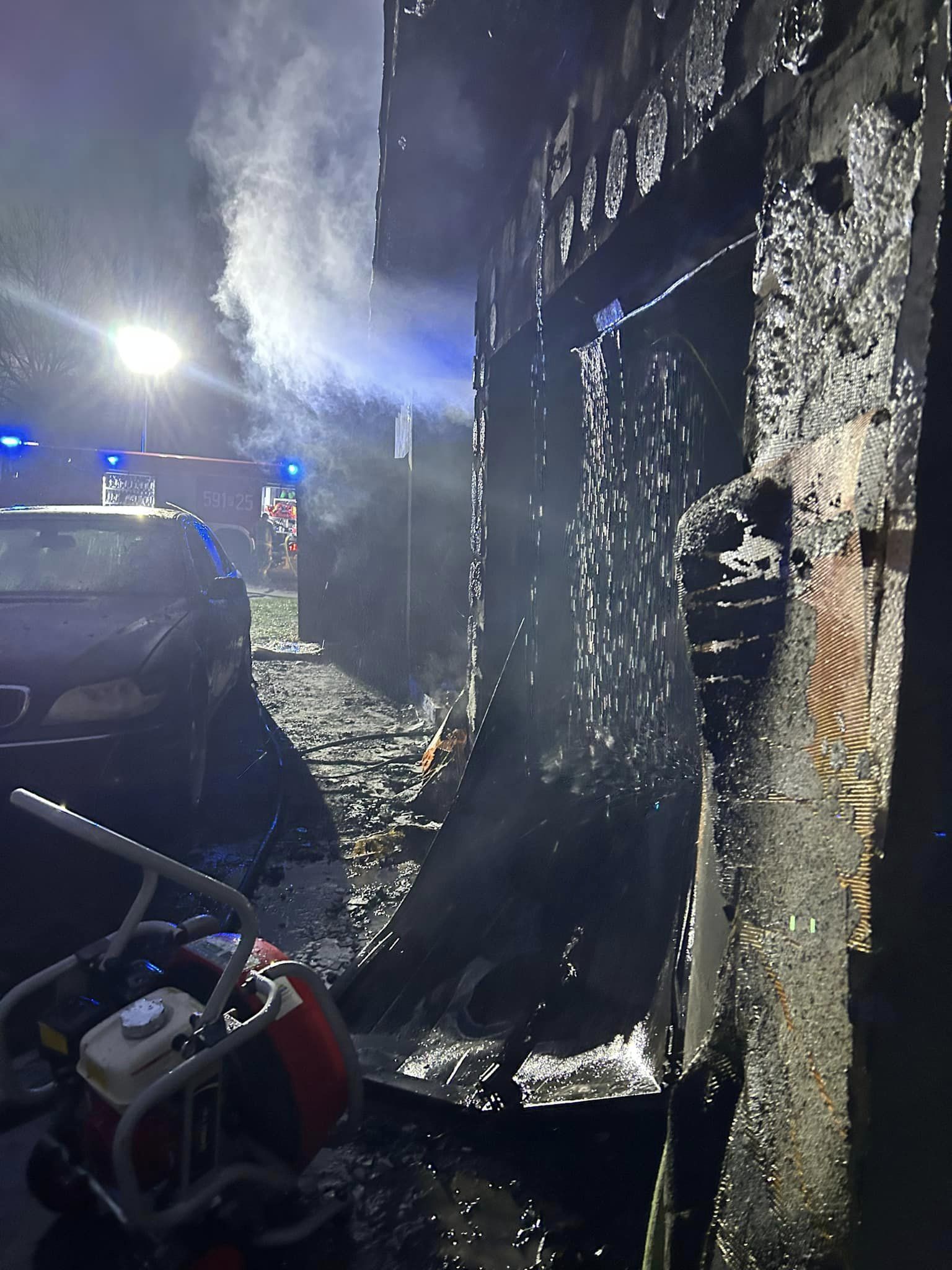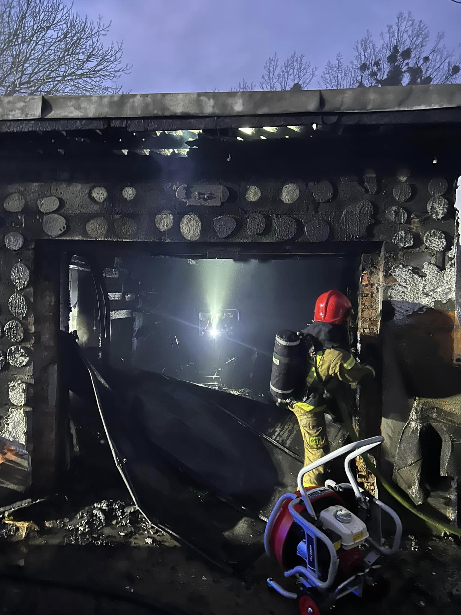 Spaleniu uległ budynek gospodarczy, wyposażenie oraz nadpaleniu uległ samochód osobowy.