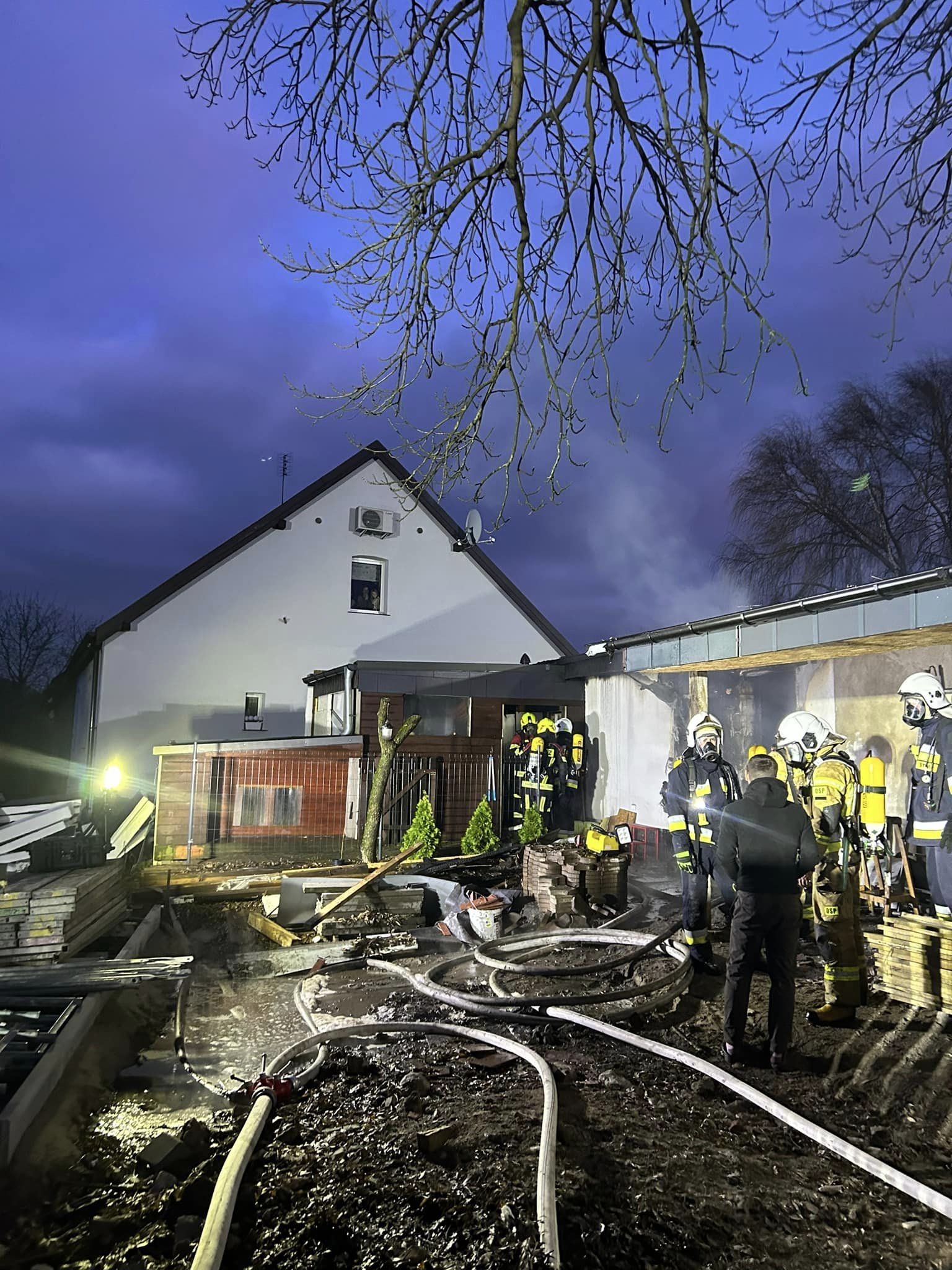 Po dojeździe na miejsce zdarzenia strażacy zastali rozwinięty pożar budynku gospodarczego, w pobliżu znajdował się budynek mieszkalny, garaż oraz samochód osobowy.