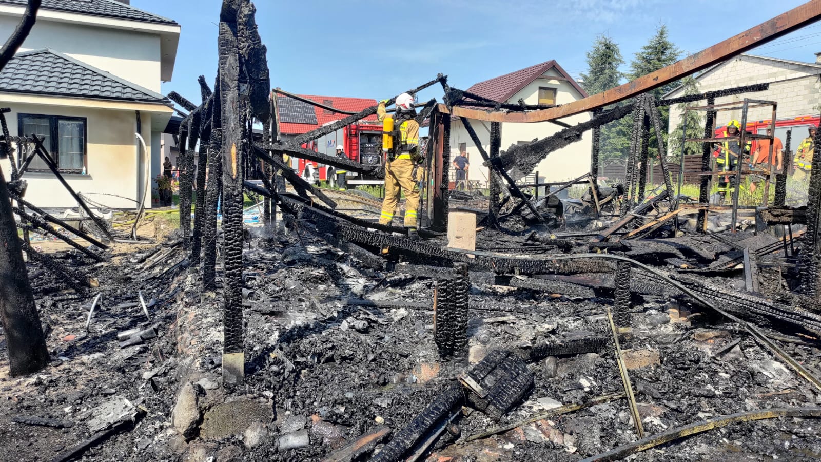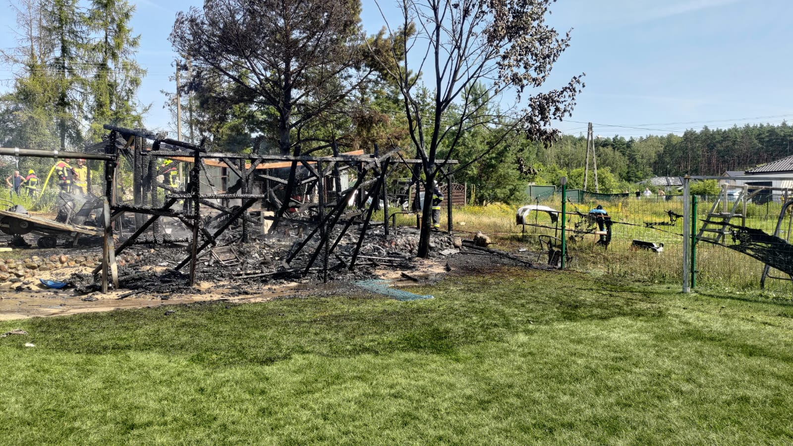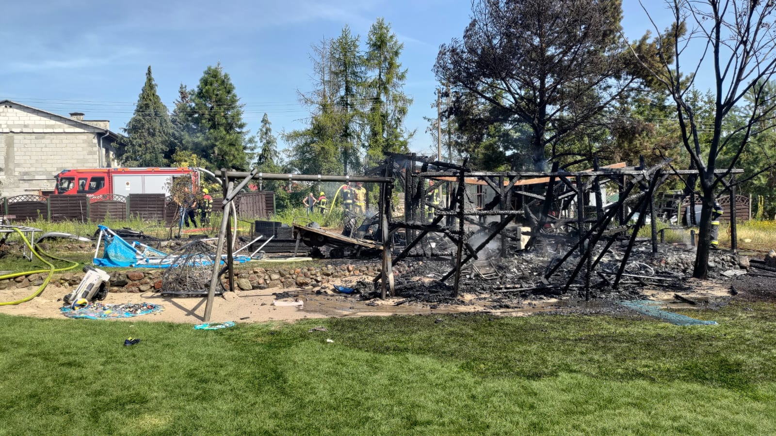 Spaleniu uległ drewniany garaż wraz ze znajdującym się wyposażeniem, motocykl, trampolina, basen ogrodowy, namiot, huśtawka i zjeżdżalnia ogrodowa, natomiast uszkodzeniu uległa elewacja budynku.