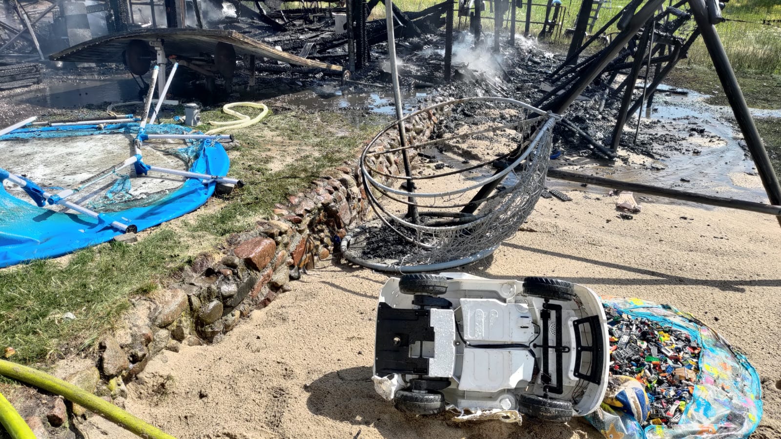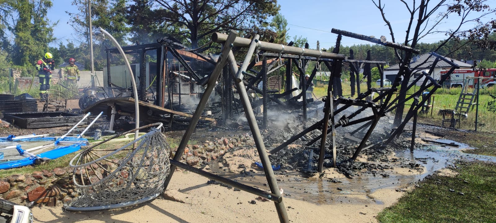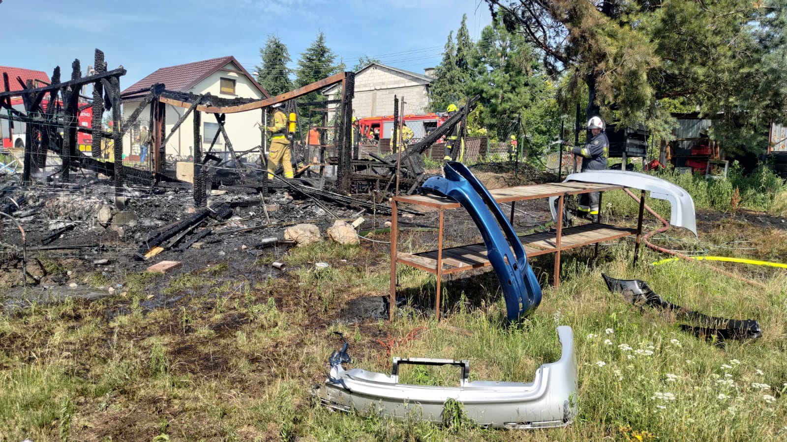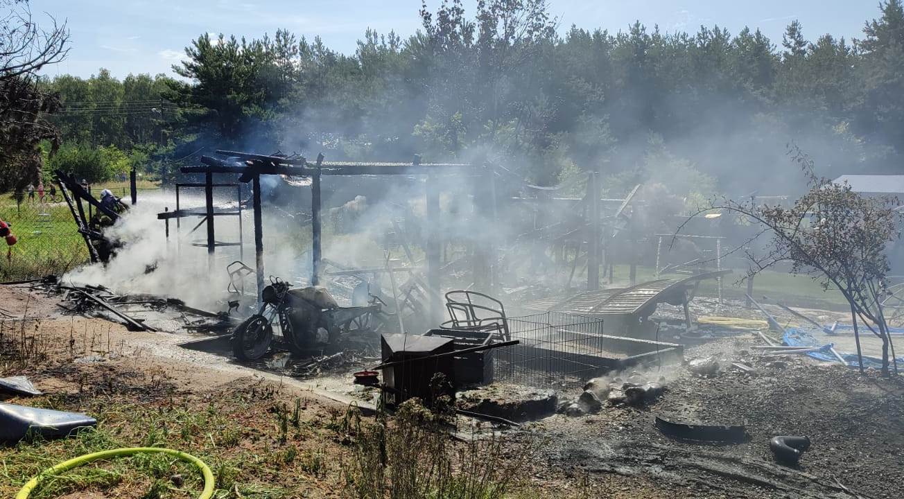 Spaleniu uległ drewniany garaż wraz ze znajdującym się wyposażeniem, motocykl, trampolina, basen ogrodowy, namiot, huśtawka i zjeżdżalnia ogrodowa, natomiast uszkodzeniu uległa elewacja budynku.