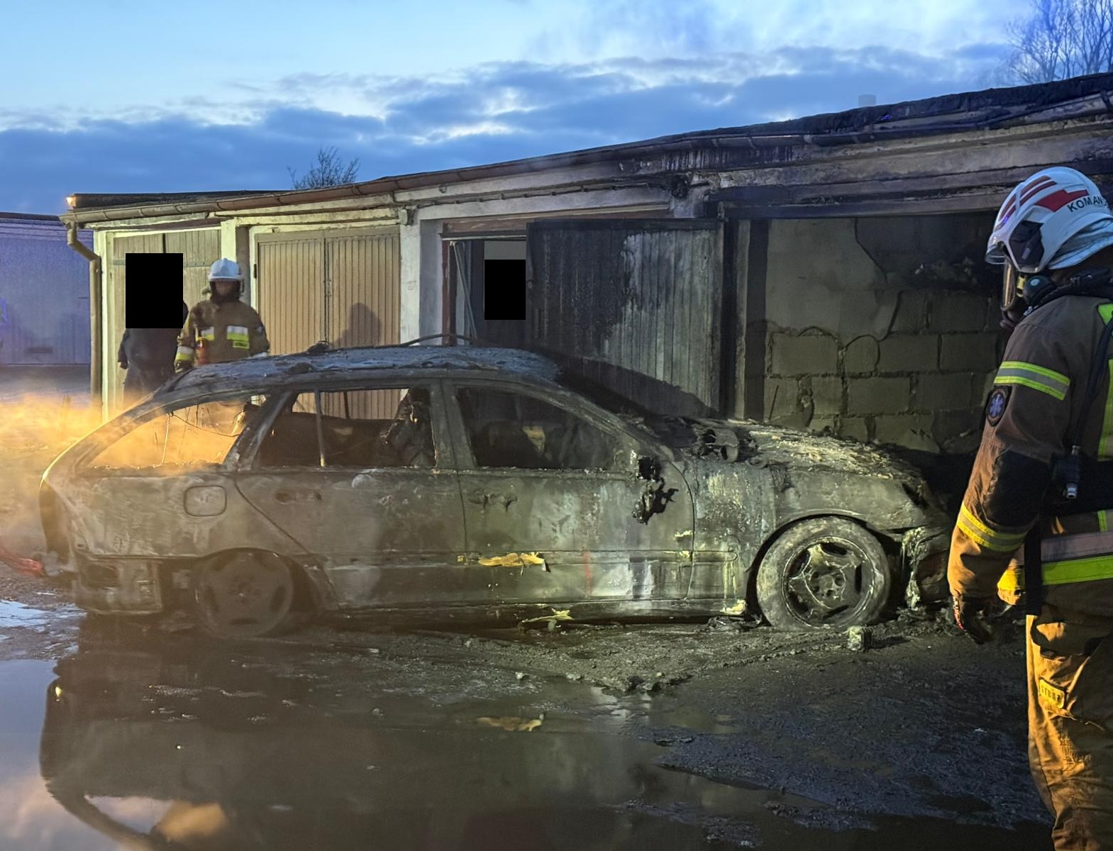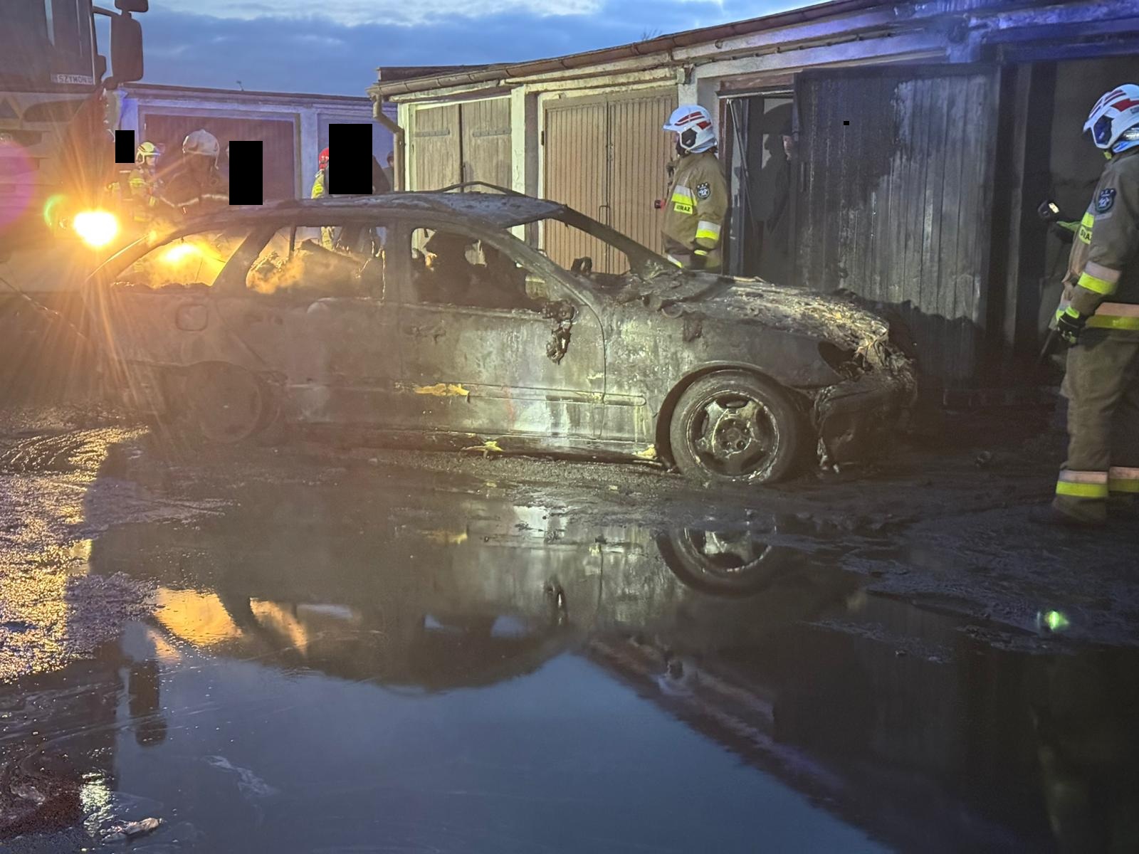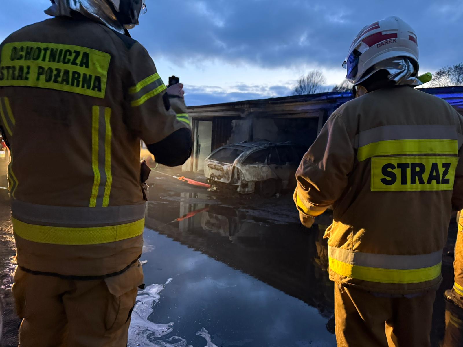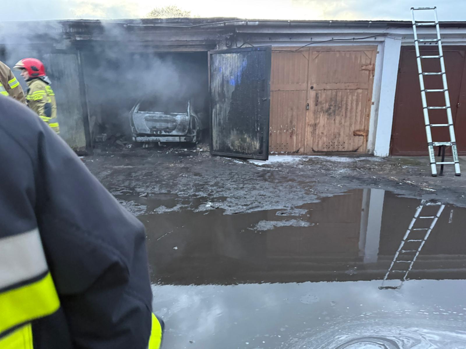 Po dojeździe na miejsce zdarzenia strażacy zastali pożar w garażu - wewnątrz znajdował się samochód osobowy.