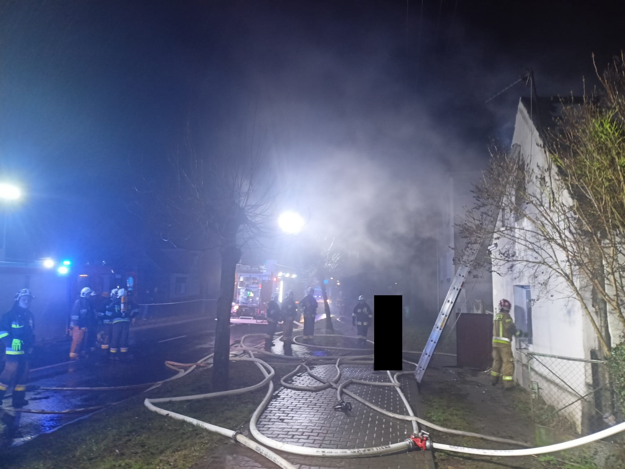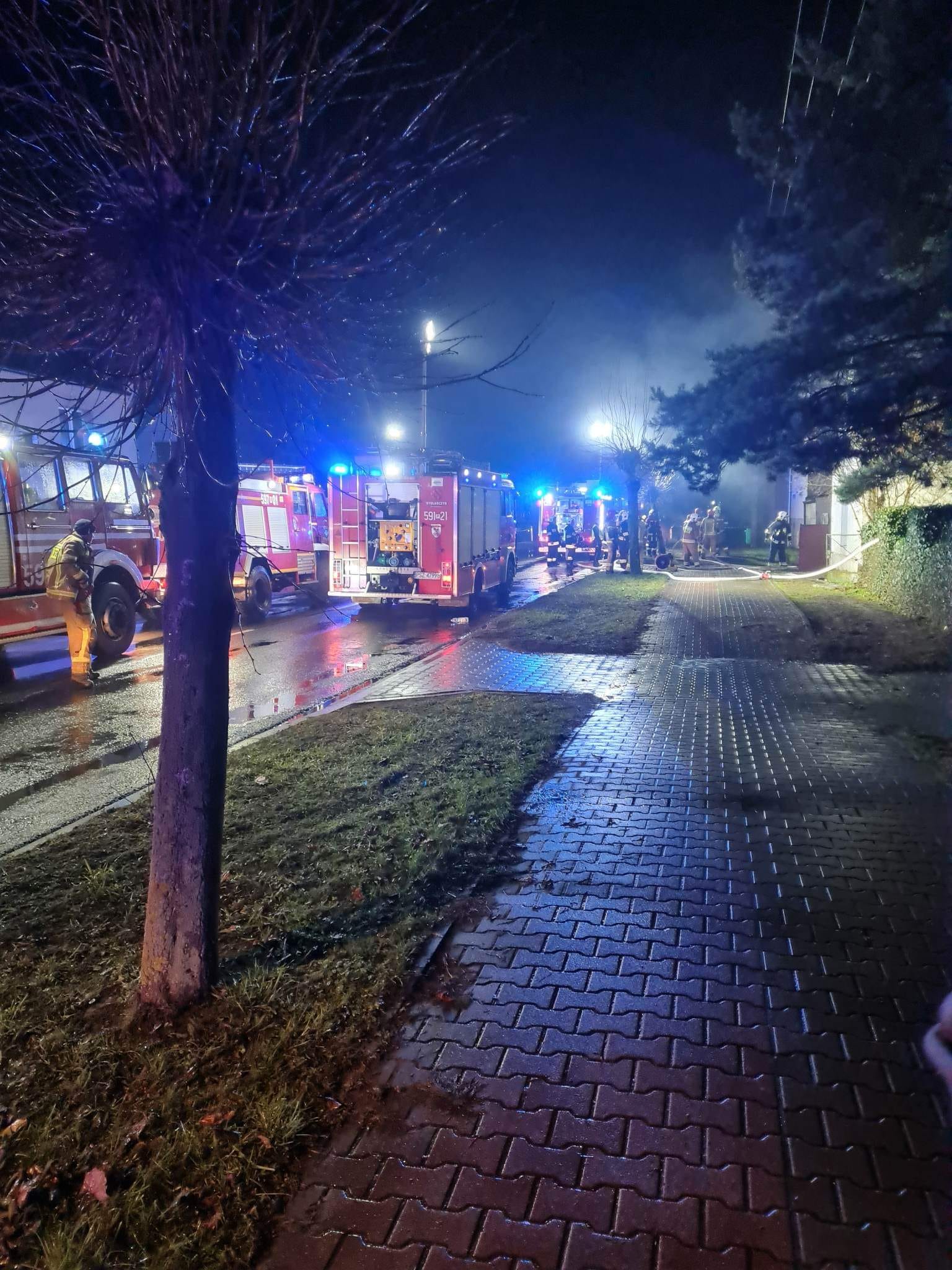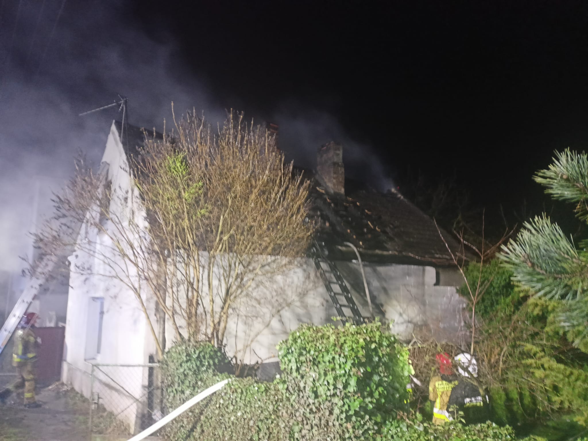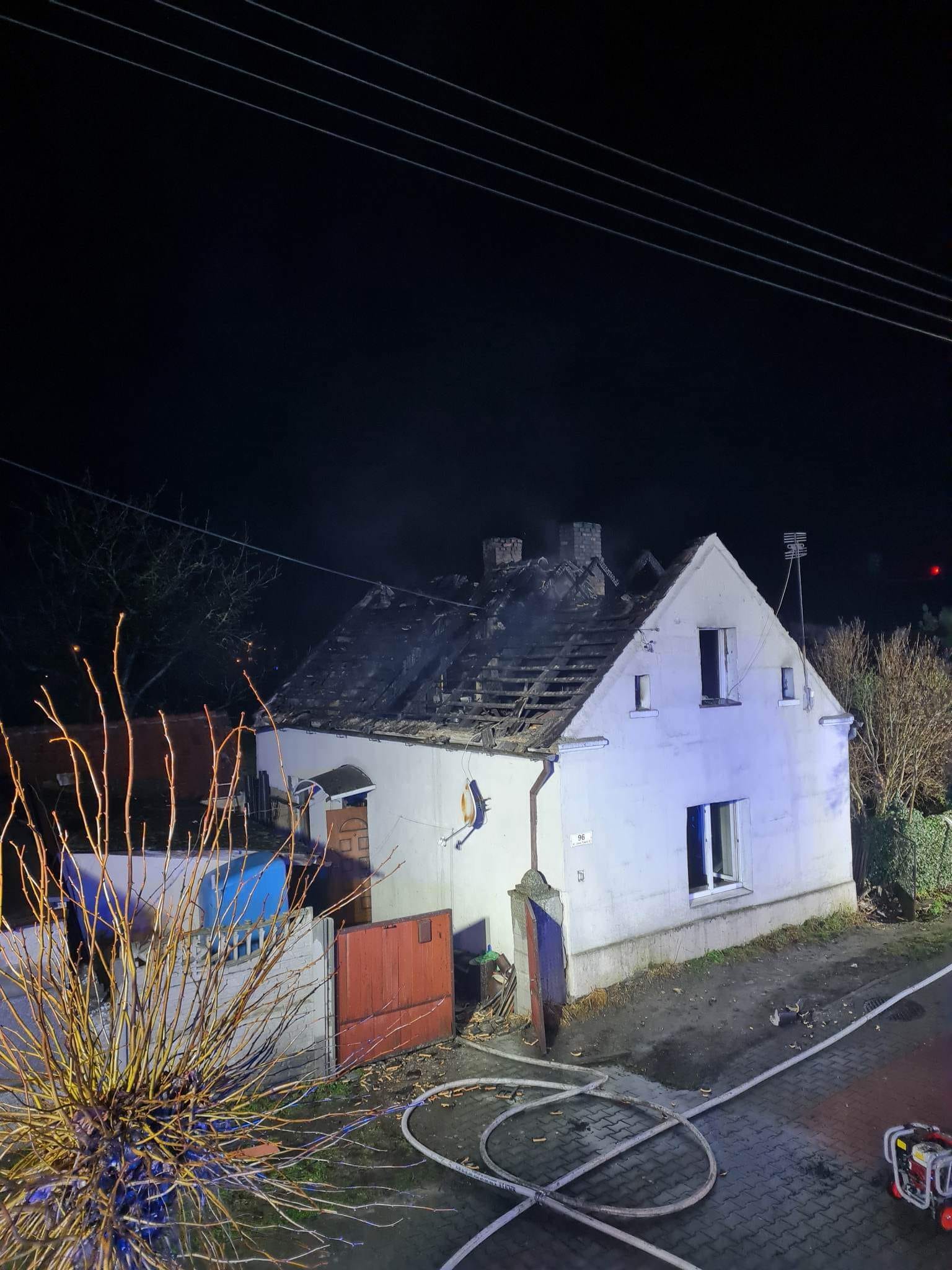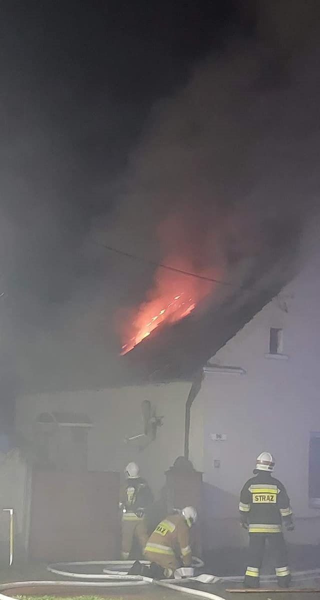 Po dojeździe na miejsce zdarzenia strażacy zastali pożar dachu i poddasza budynku mieszkalnym. Mieszkańcy opuścili budynek przed przybyciem SP i znajdowali się na zewnątrz.
