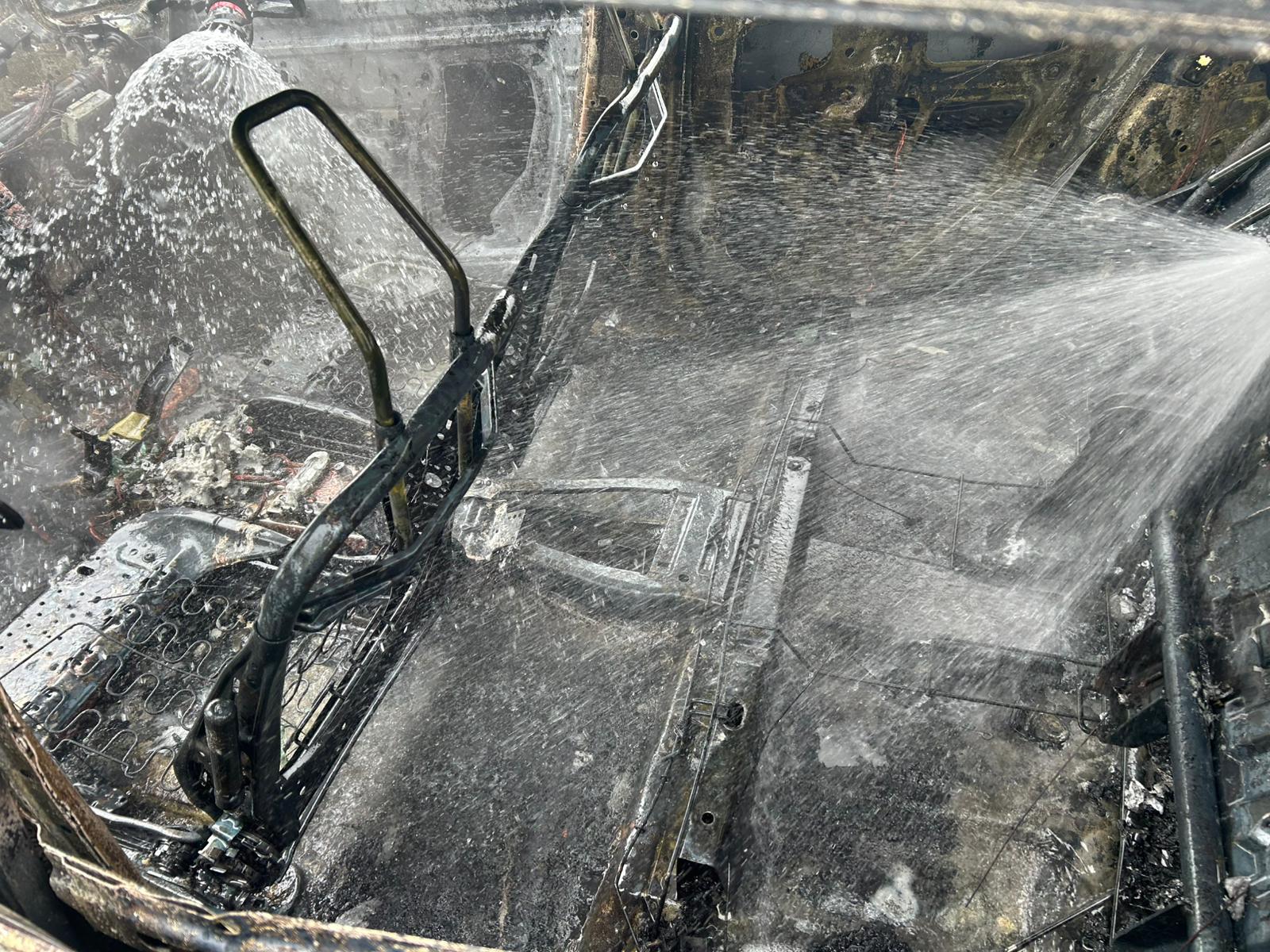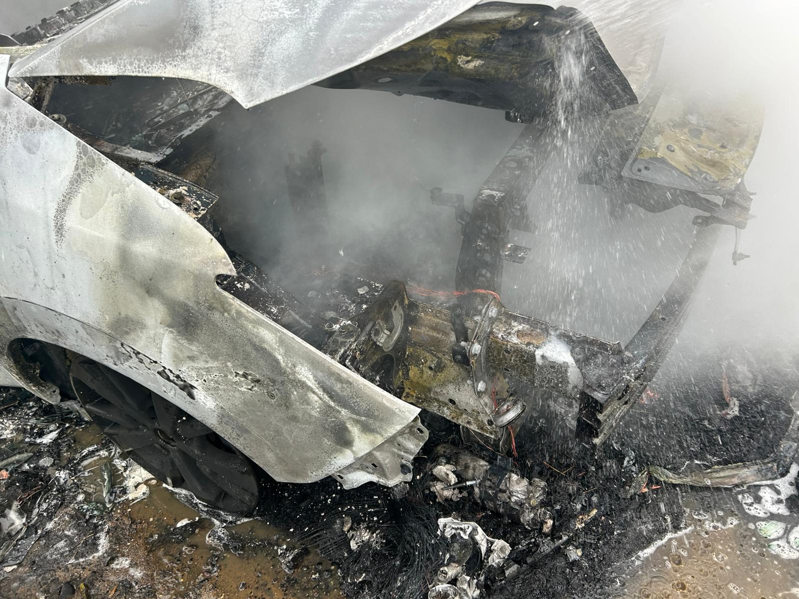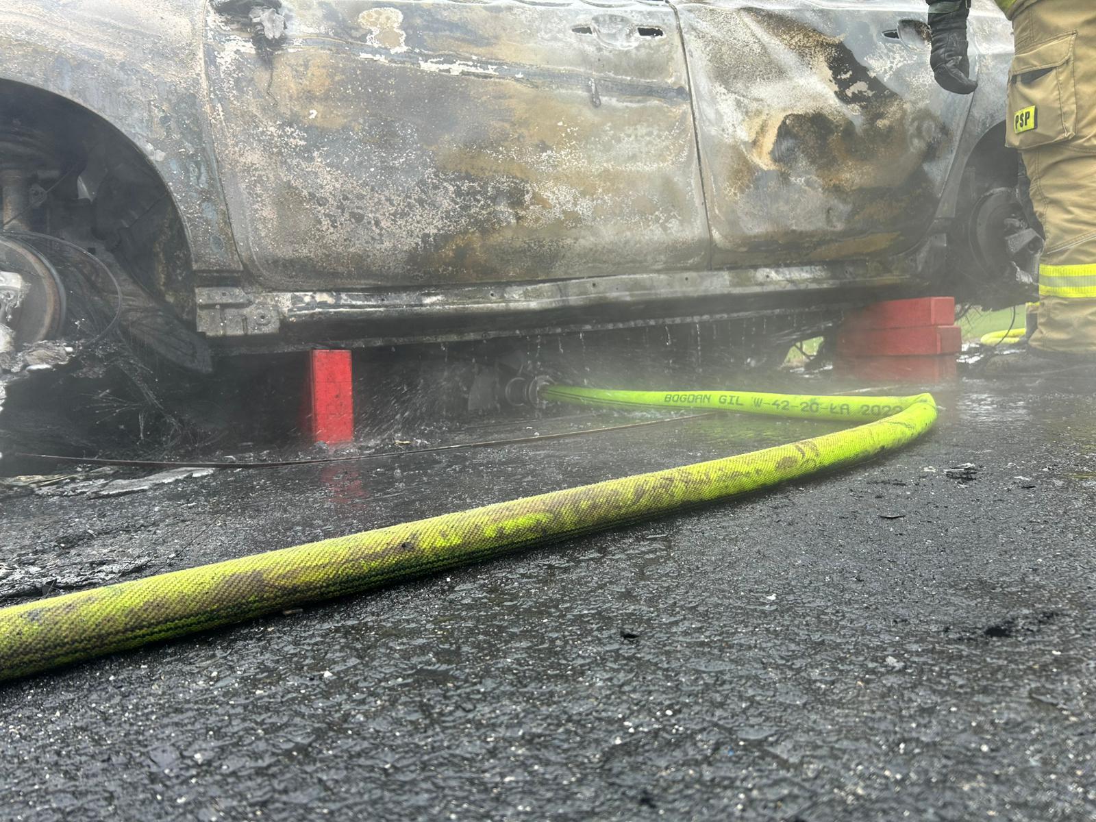 Po dojeździe na miejsce zdarzenia strażacy zastali samochód osobowy, który cały objęty był ogniem. Na miejscu był właściciel, który potwierdził, że jest to pojazd elektryczny.