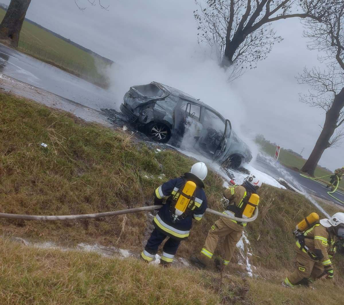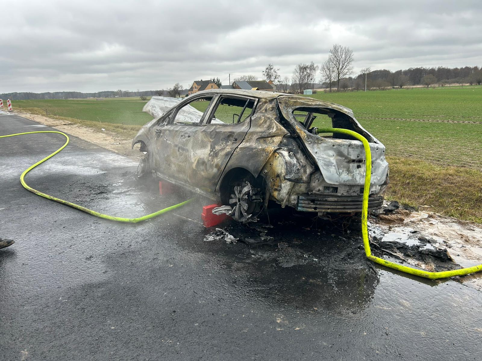 W niedzielę, 15 marca 2026 roku o godz. 12.01 do dyżurnego Stanowiska Kierowania Państwowej Straży Pożarnej w Szamotułach wpłynęło zgłoszenie z Centrum Powiadamiania Ratunkowego, które informowało o pożarze pojazdu elektrycznego na drodze wojewódzkiej 116 w miejscowości Karmin gm. Pniewy.