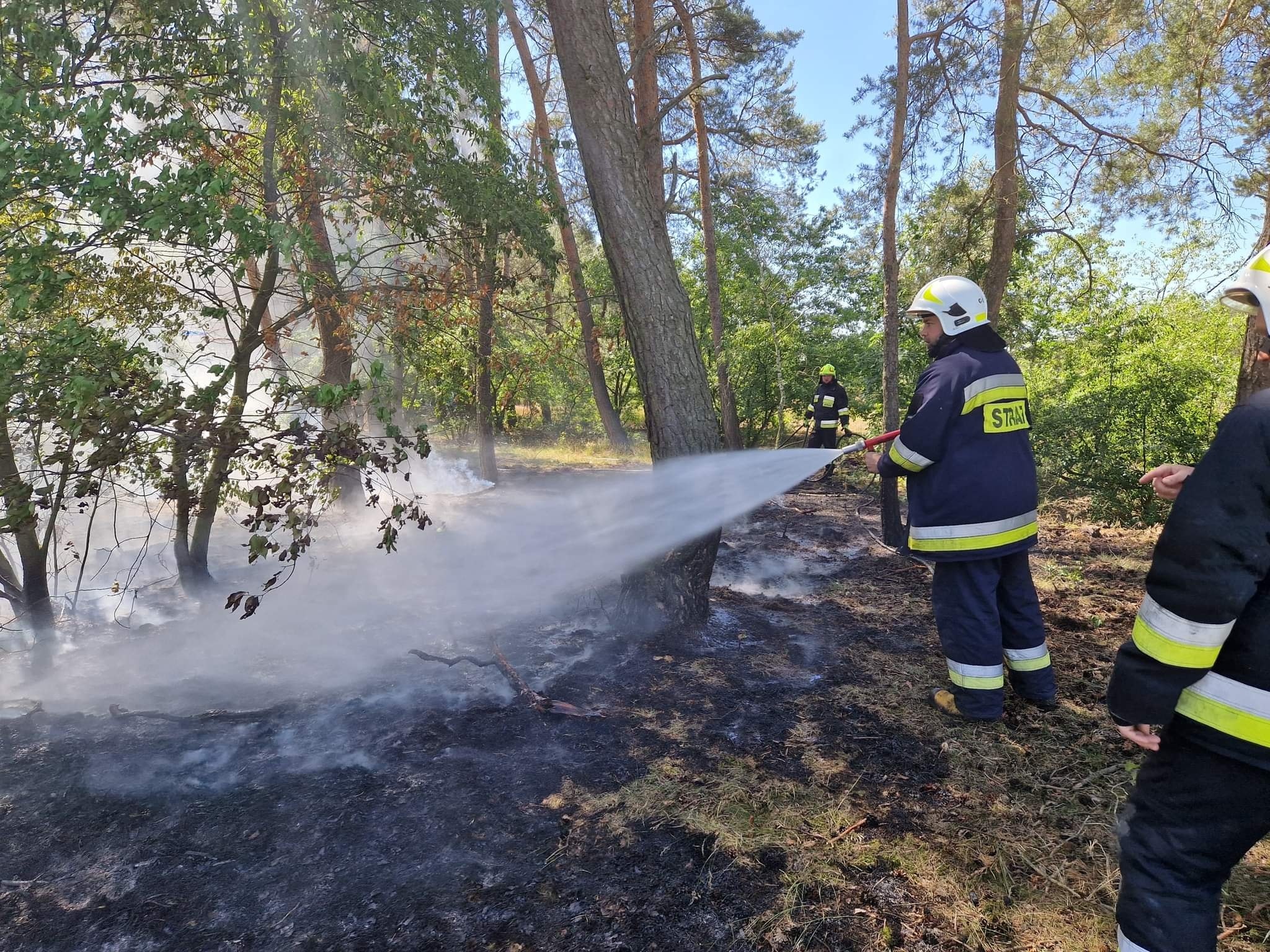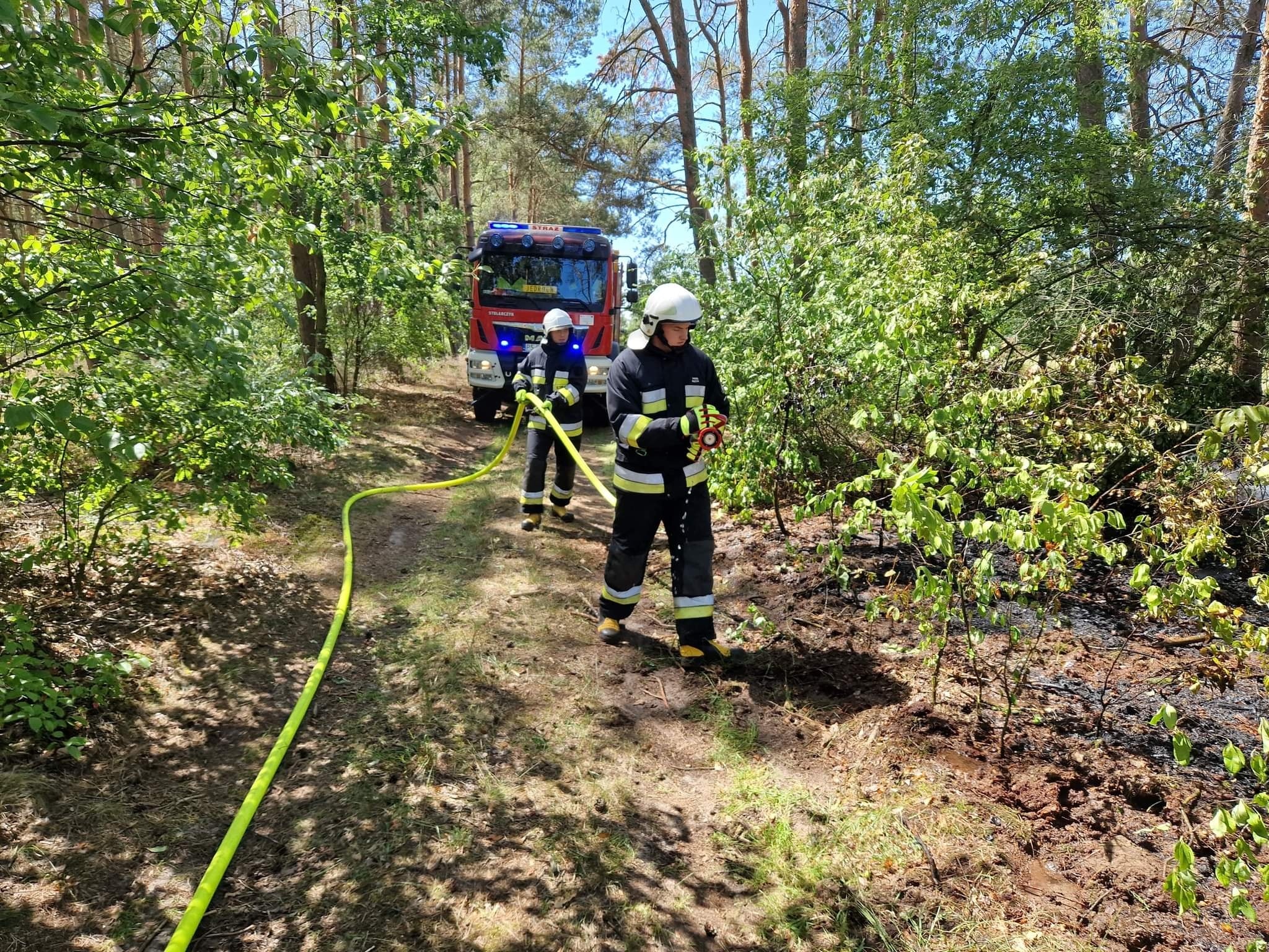 Działania SP polegały na zabezpieczeniu miejsca zdarzenia, podaniu dwóch prądów gaśniczych w natarciu na palące się poszycie leśne.