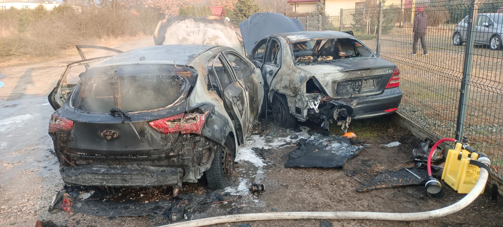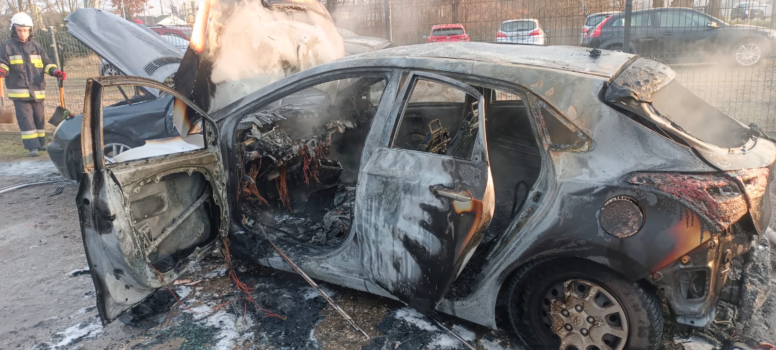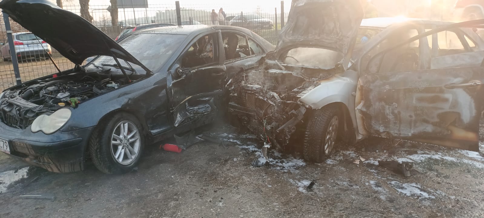 Po dojeździe na miejsce zdarzenia strażacy zastali samochód osobowy marki Hyundai, który zderzył się z pojazdem Mercedes. W wyniku zdarzenia doszło do pożaru obu pojazdów, które znajdowały się poza drogą. Kierujący i pasażerowie opuścili pojazdy przed przybyciem SP i znajdowali się w pobliżu pod opieką świadków zdarzenia.