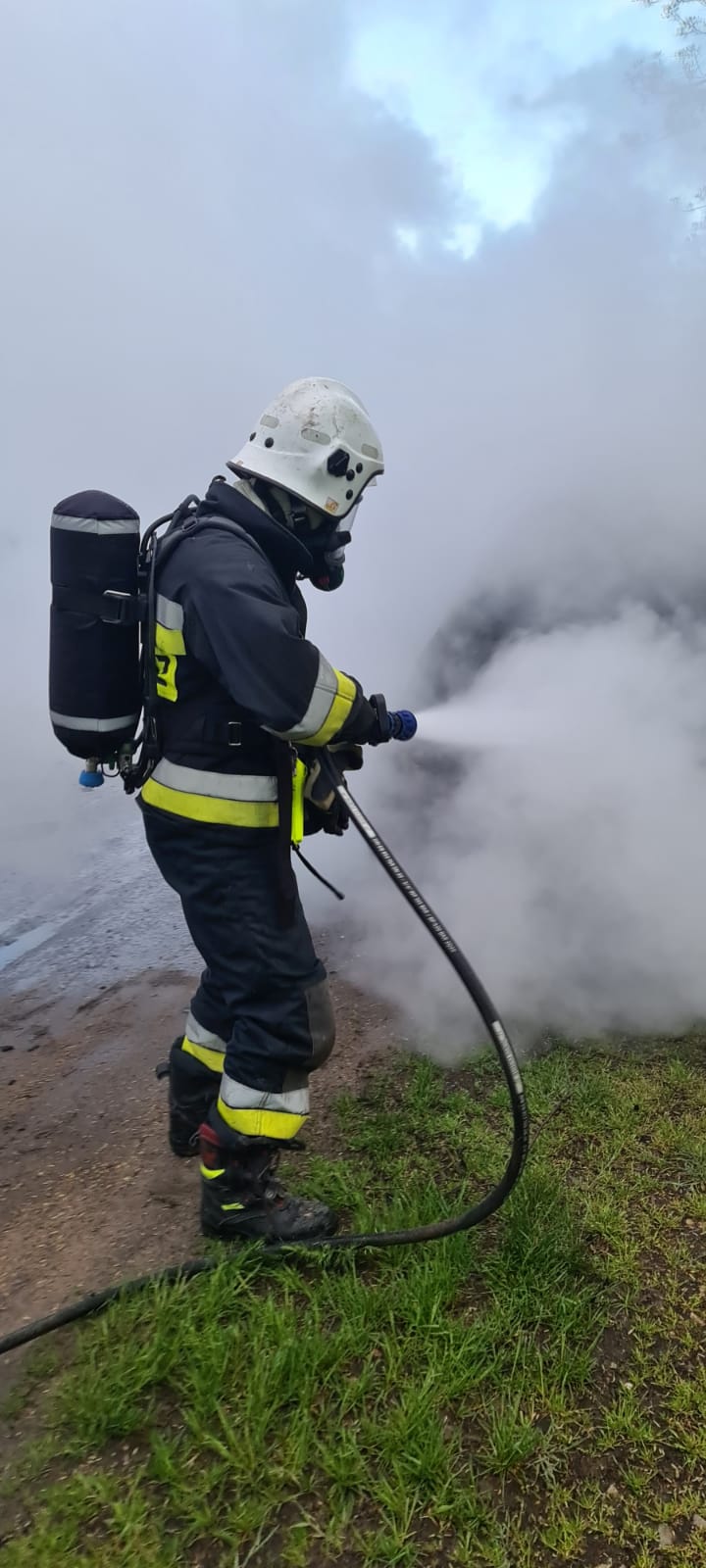Działania SP polegały na zabezpieczeniu miejsca zdarzenia, podaniu jednego prądu gaśniczego w natarciu na palący się pojazd, rozłączeniu akumulatora oraz schłodzeniu karoserii.