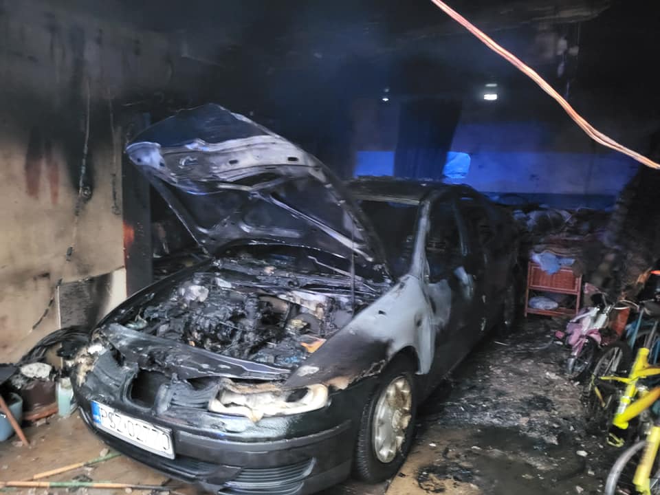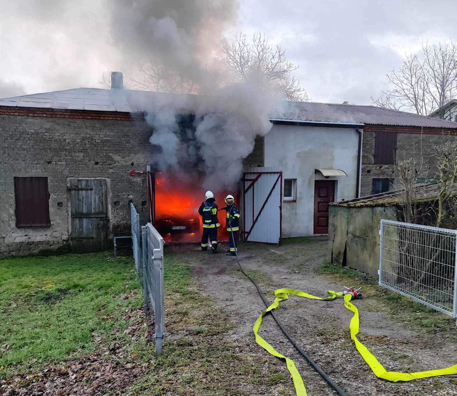 Po dojeździe na miejsce zdarzenia strażacy zastali pożar samochodu i garażu w budynku gospodarczym, w pomieszczeniu garażu panowało duże zadymienie.