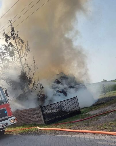 Po dojeździe na miejsce zdarzenia strażacy zastali stóg z balotami słomy i sianokiszonki, który cały objęty był ogniem.
