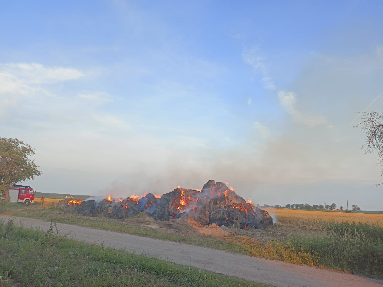 Po dojeździe na miejsce zdarzenia strażacy zastali stóg z balotami słomy, który cały objęty był ogniem.
