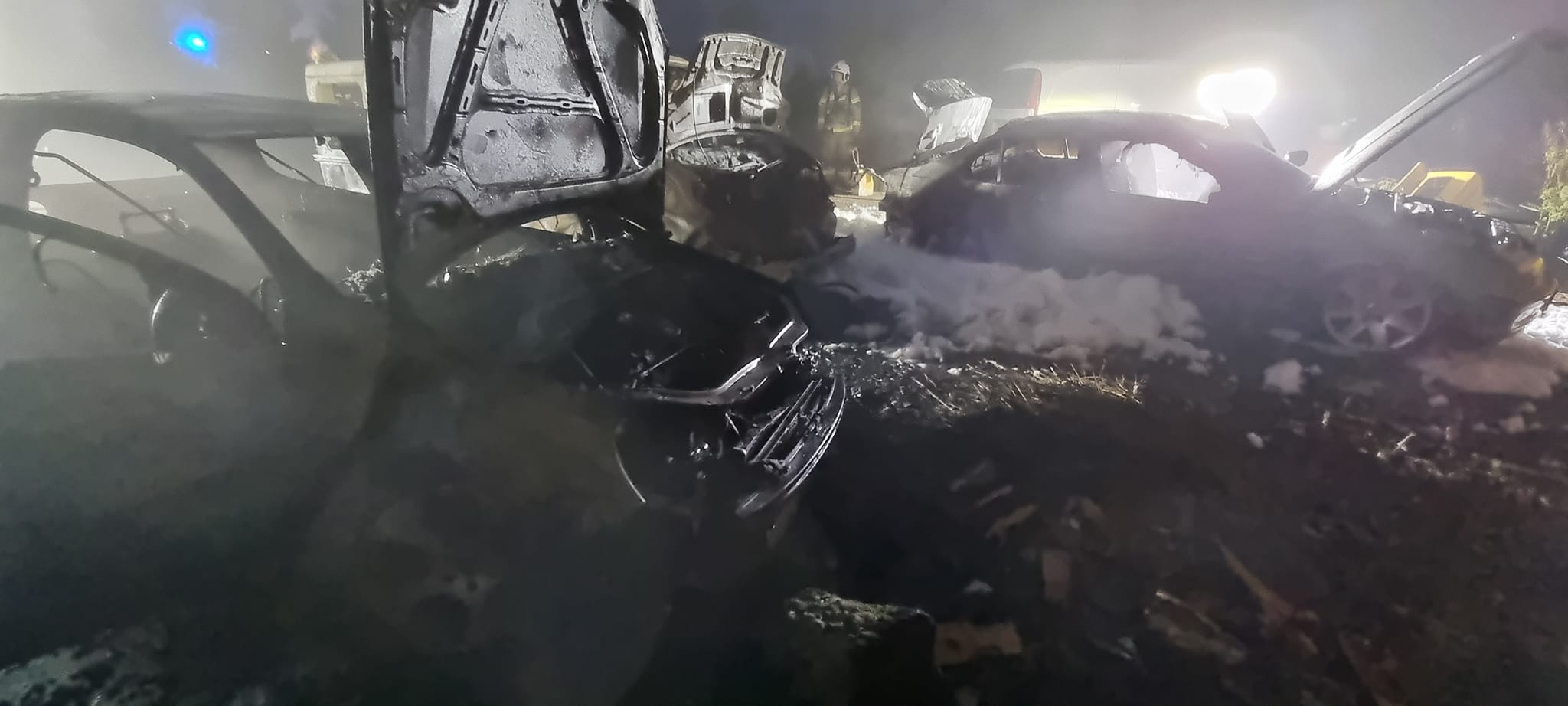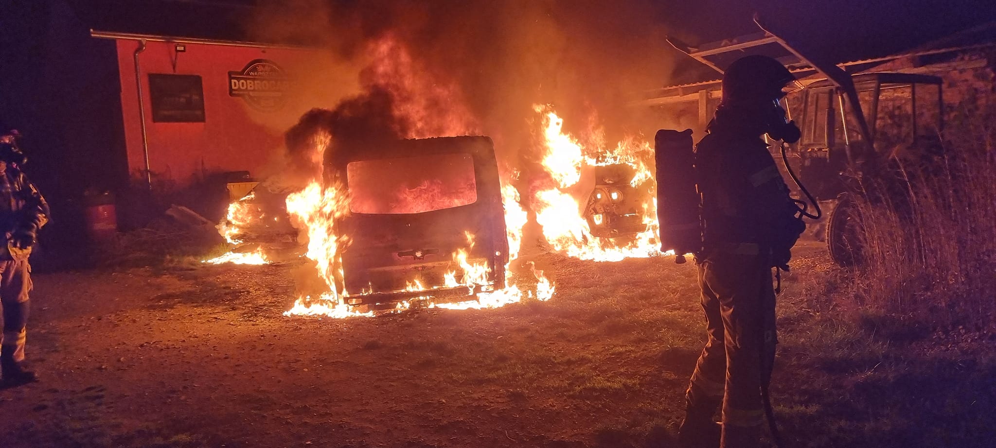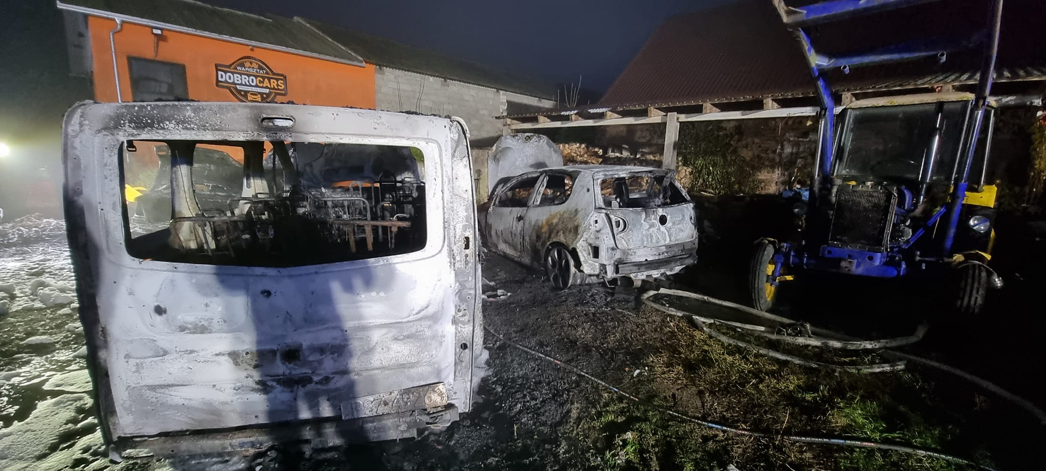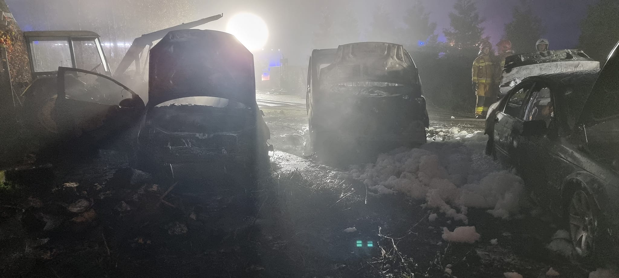 Spaleniu uległy dwa samochody osobowe i pojazd dostawczy, nadpaleniu uległ ciągnik rolniczy i samochód dostawczy.