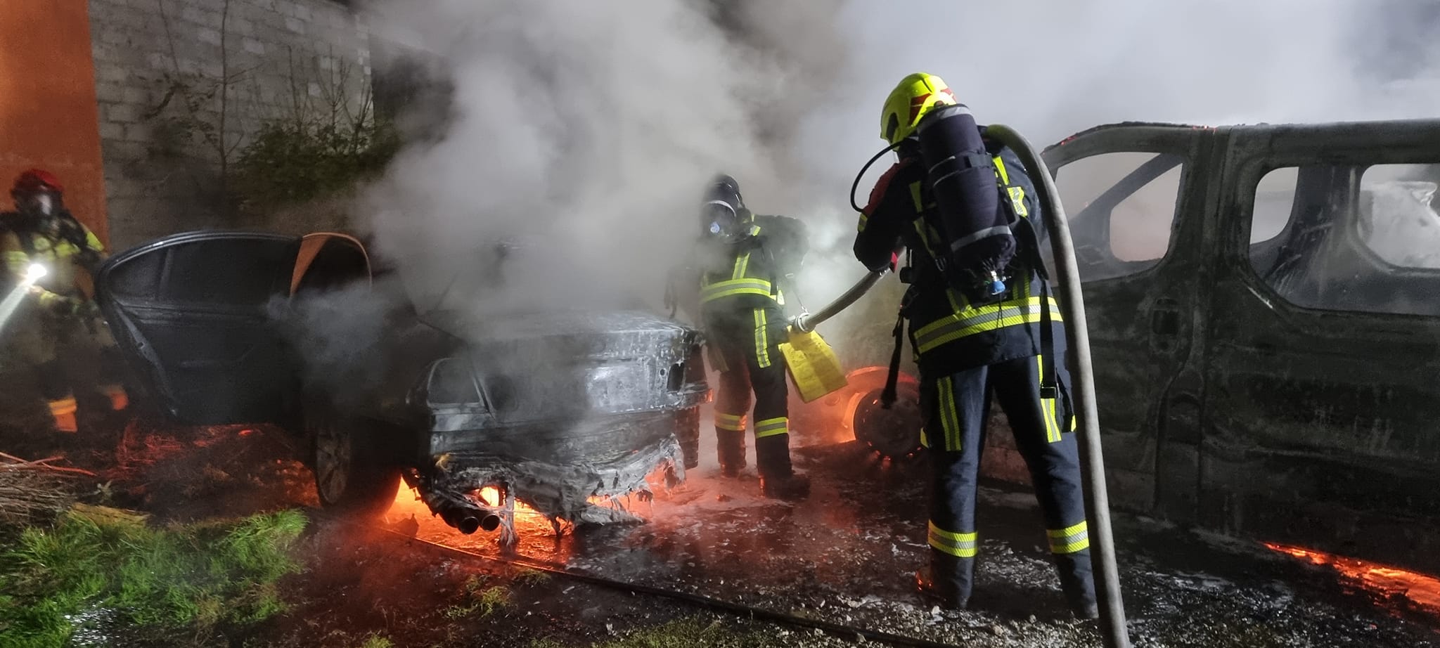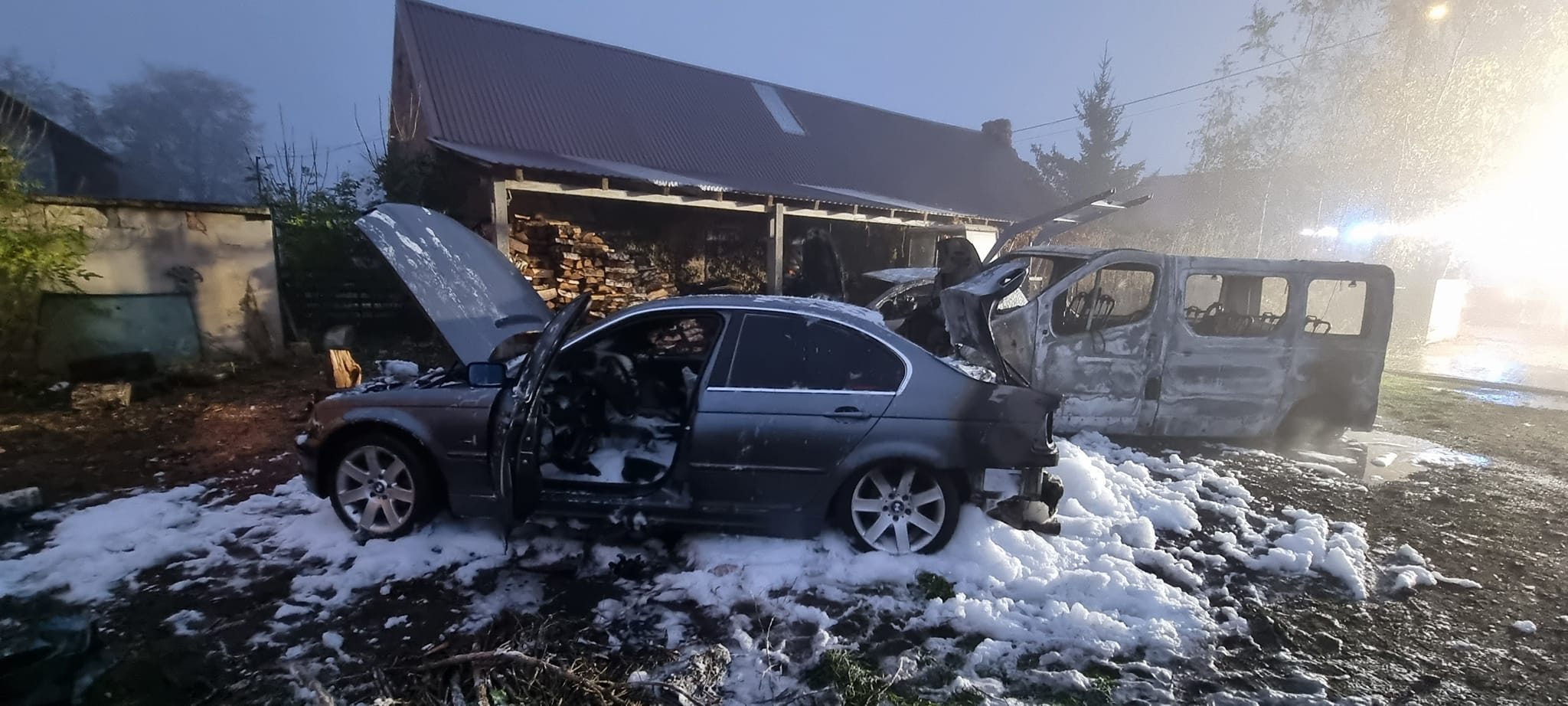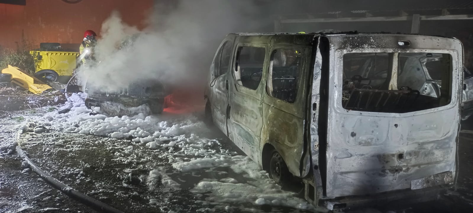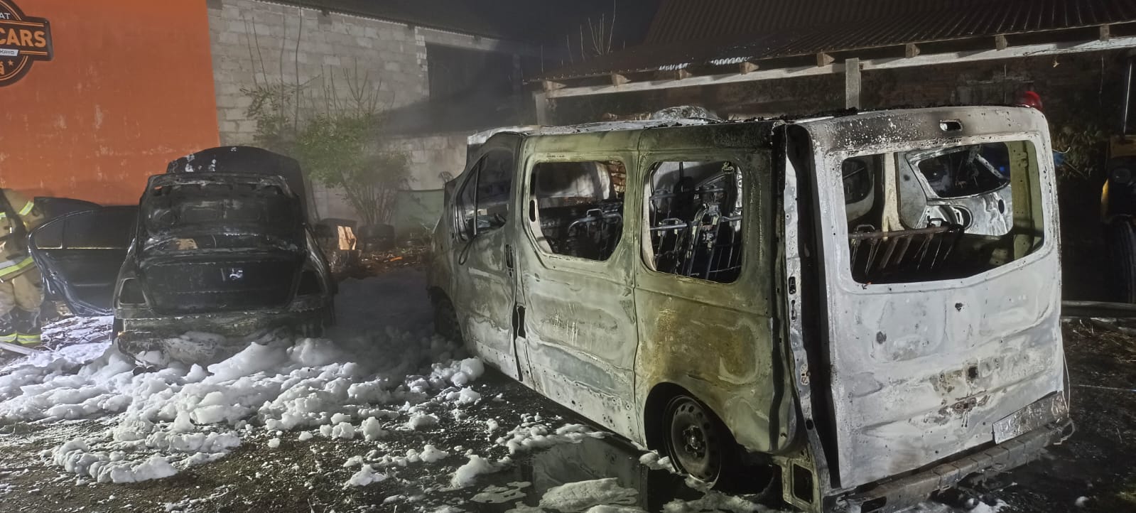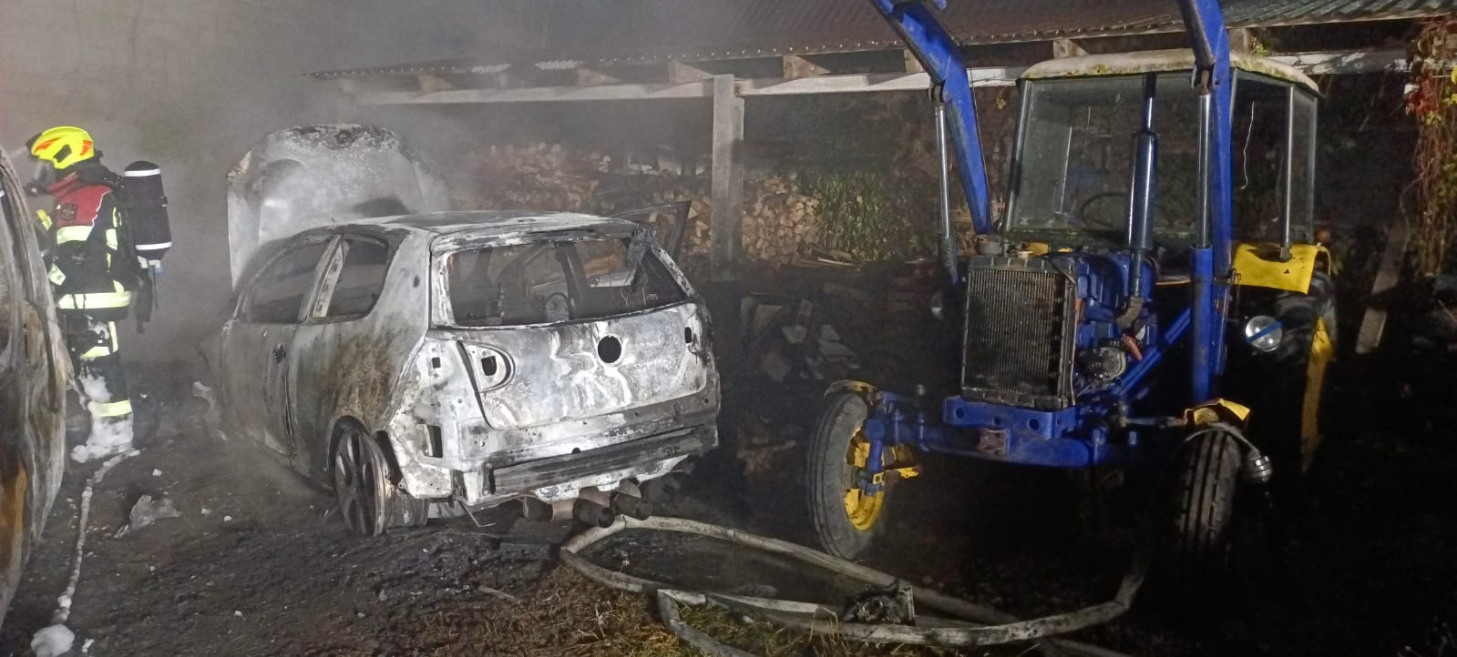 Spaleniu uległy dwa samochody osobowe i pojazd dostawczy, nadpaleniu uległ ciągnik rolniczy i samochód dostawczy.