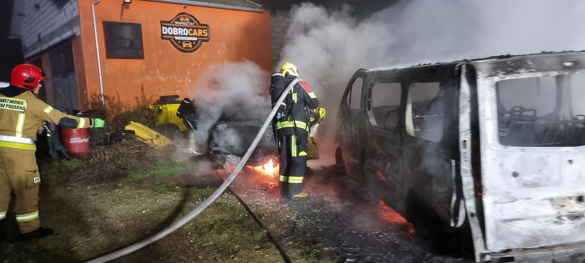 Po dojeździe na miejsce zdarzenia strażacy zastali pożar trzech pojazdów przed warsztatem samochodowym, zagrożone pożarem były kolejne pojazdy oraz budynek gospodarczy.