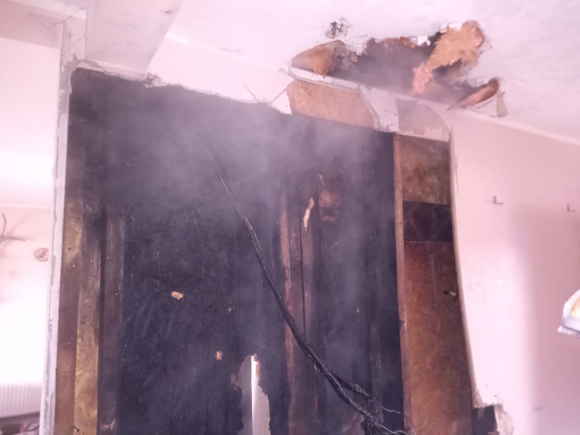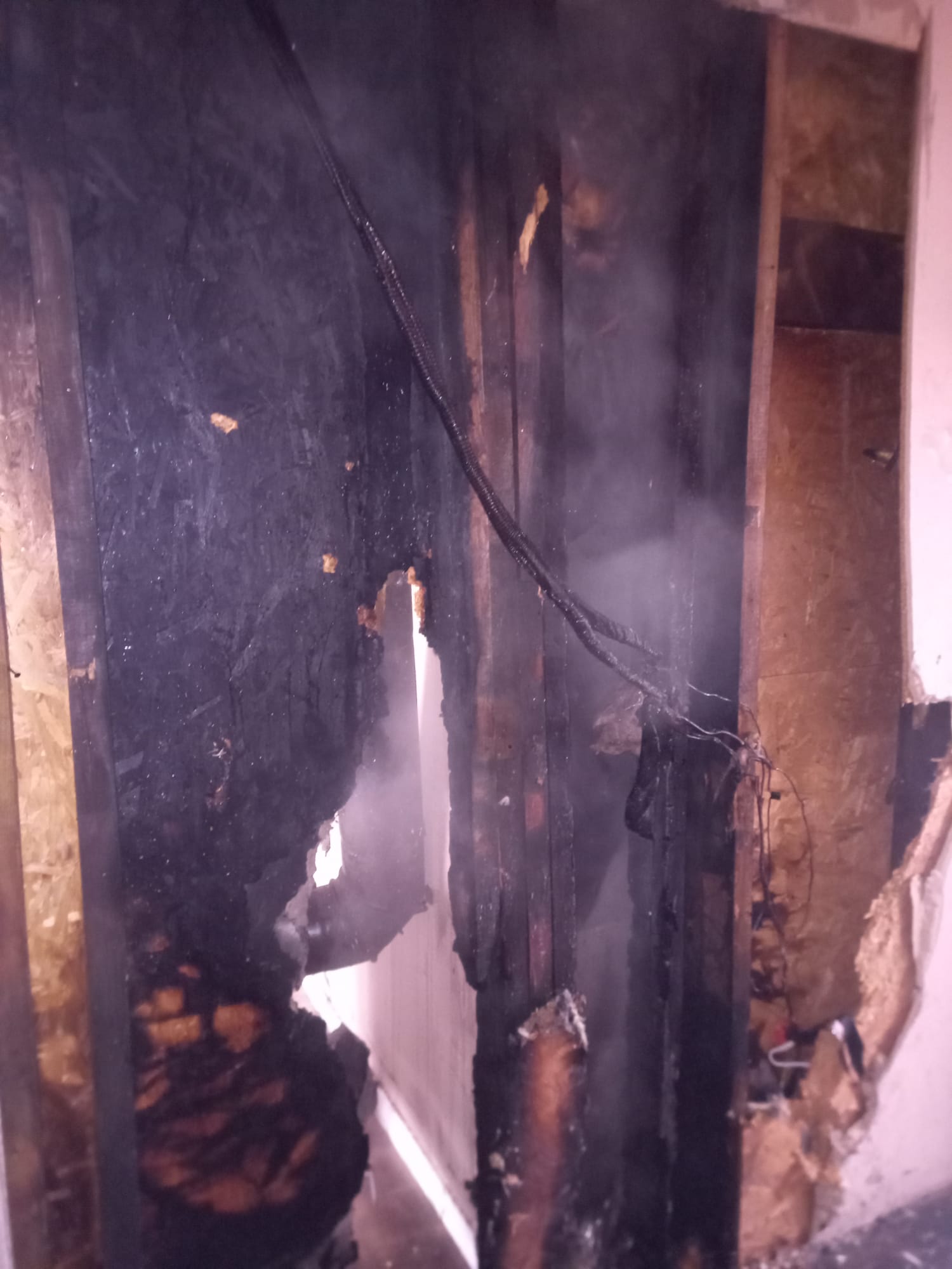 Po dojeździe na miejsce zdarzenia strażacy zastali pożar sadzy w przewodzie kominowym oraz wewnątrz ścian działowych w budynku. Mieszkańcy opuścili budynek przed przybyciem SP i znajdowali się na zewnątrz.