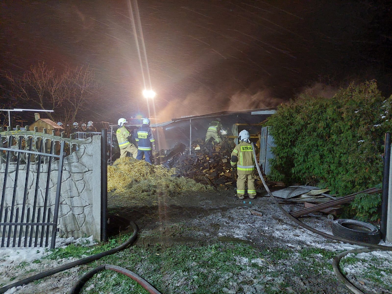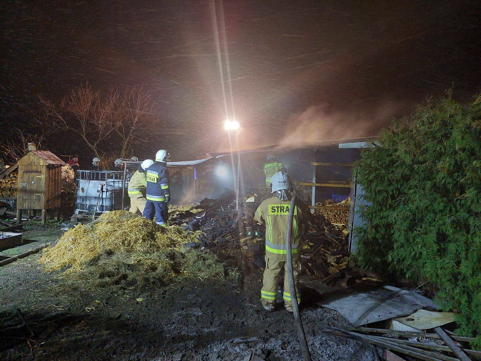 Po dojeździe na miejsce zdarzenia strażacy zastali pożar drewnianej wiaty do przechowywaniu drewna i słomy.