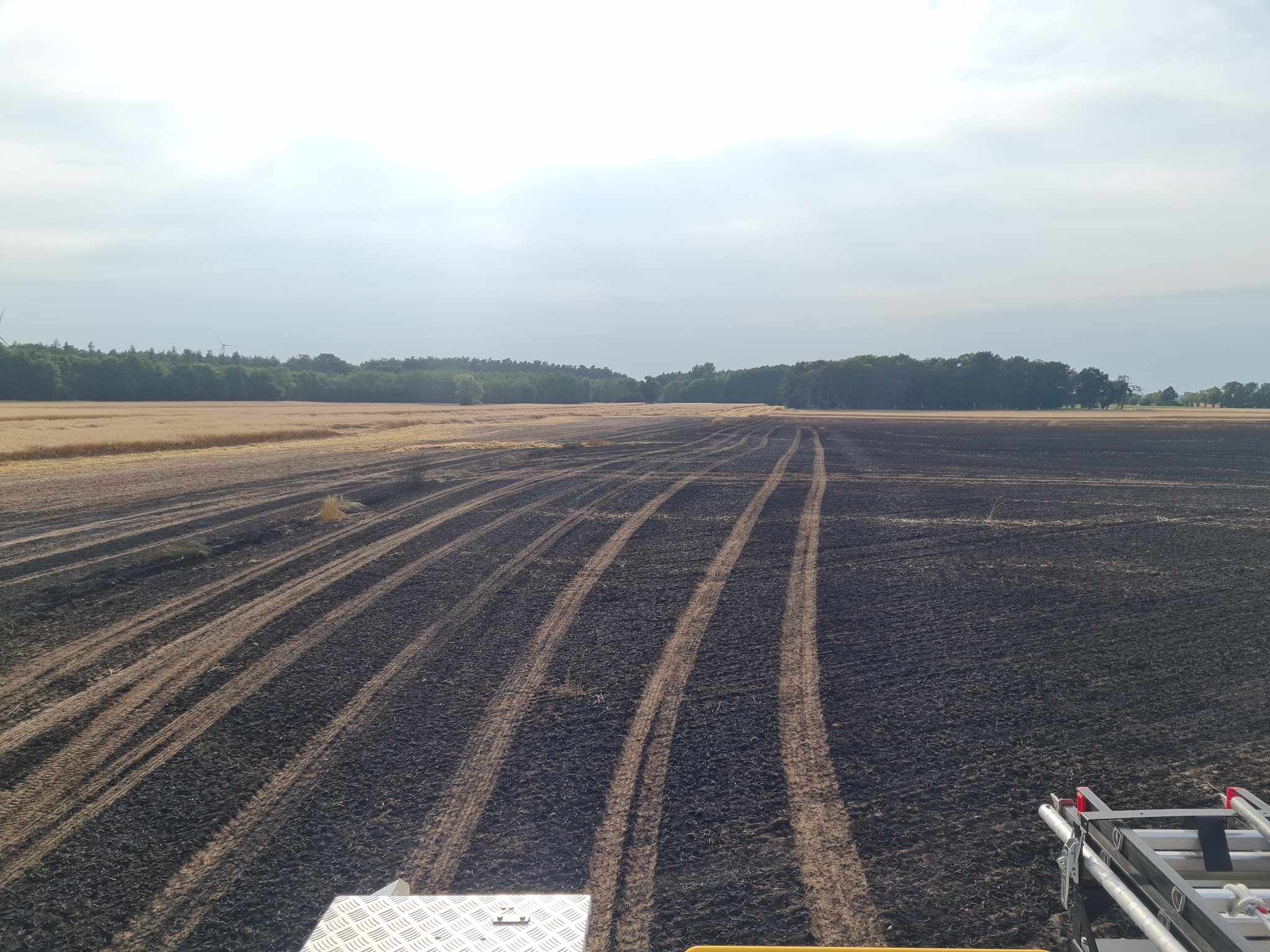 Po dojeździe na miejsce zdarzenia strażacy zastali pożar zboża na pniu na powierzchni kilku hektarów.