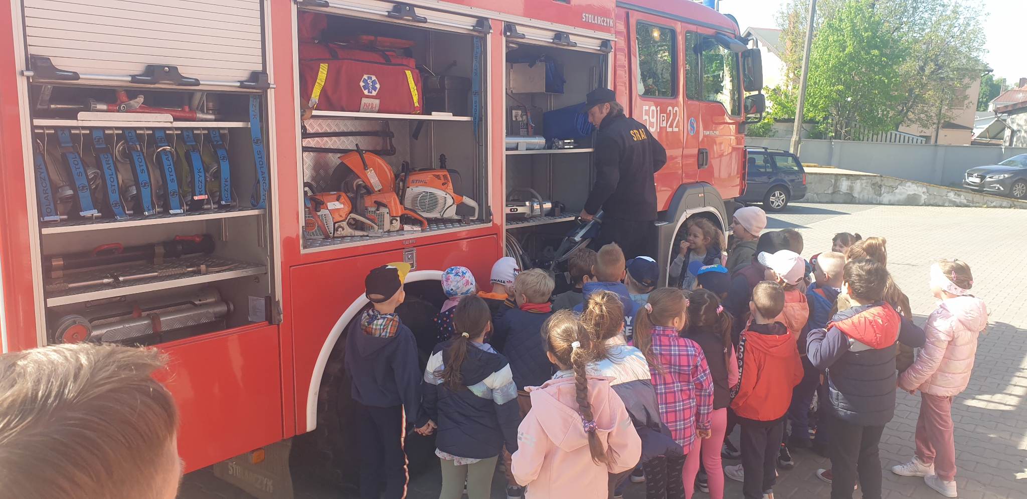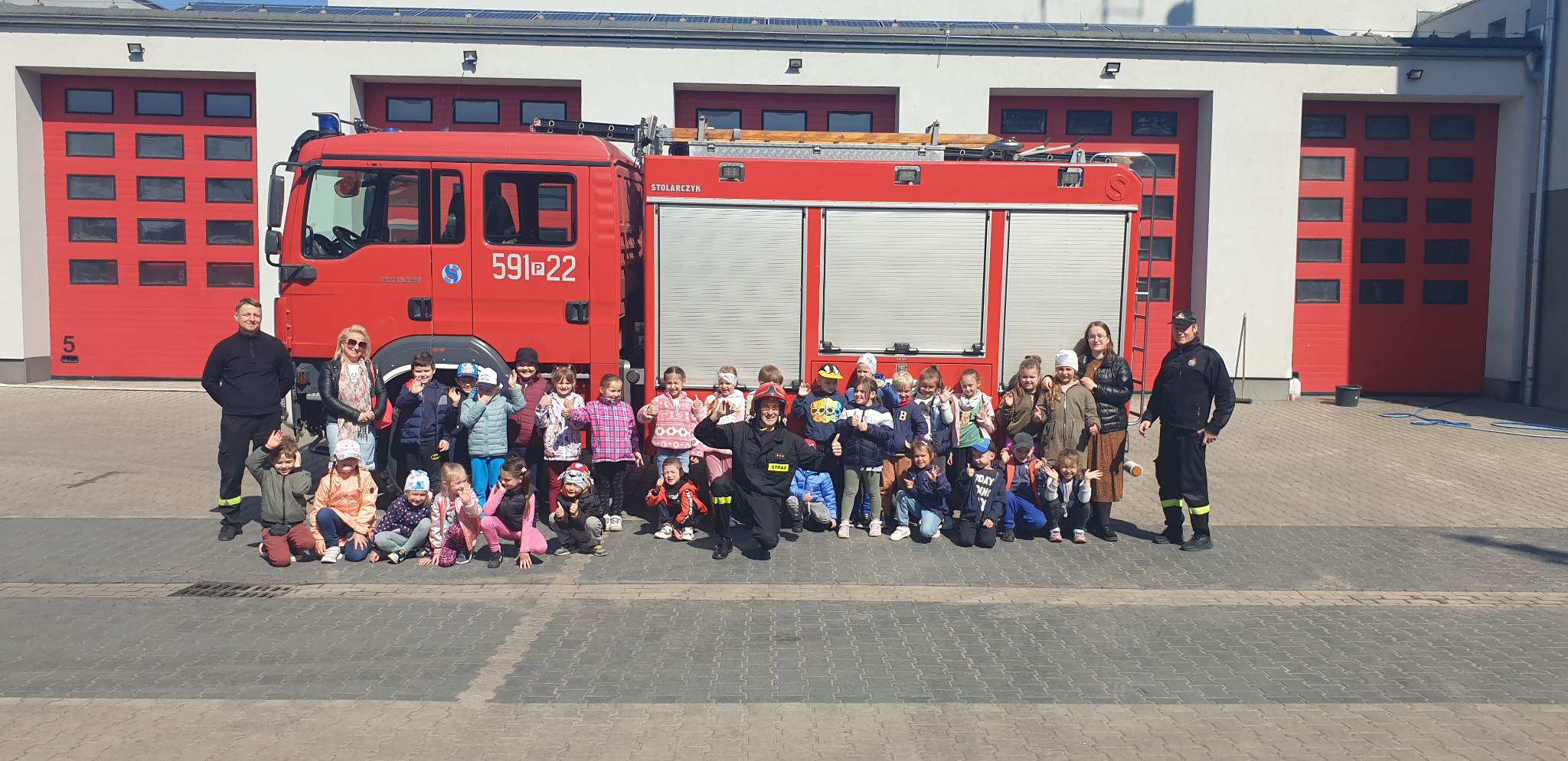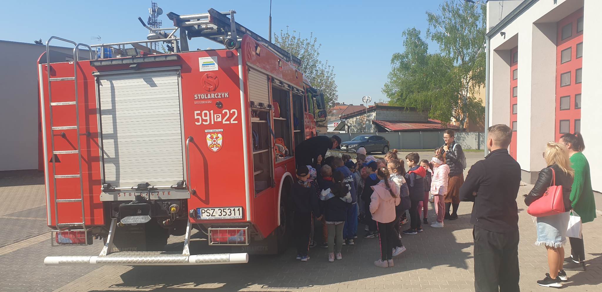 Podczas wizyty uczestnicy zapoznali się ze specyfiką strażackiej służby oraz mogli obejrzeć samochody pożarnicze wraz ze znajdującym się na nich sprzętem. Każdy miał także okazję poznać jak wygląda proces dysponowania samochodów i sprzętu do zdarzeń. Ogłoszono próbny alarm podczas którego dzieci zobaczyły jak strażacy zjeżdżają do garażu po ześlizgu, aby jak najszybciej znaleźć się w wozach bojowych.
